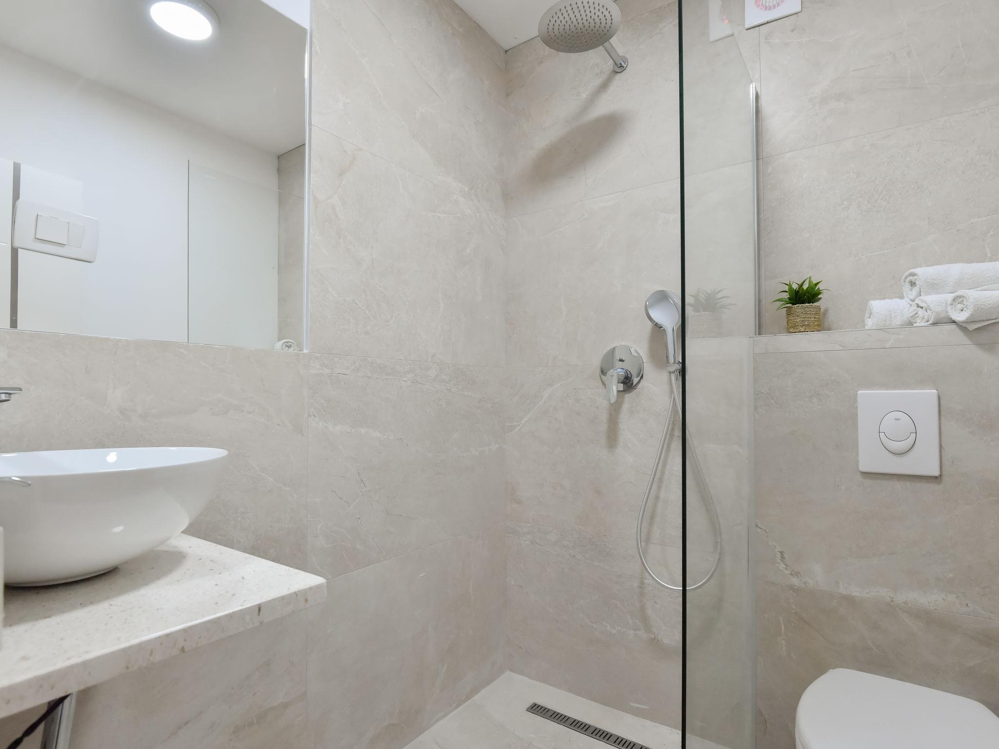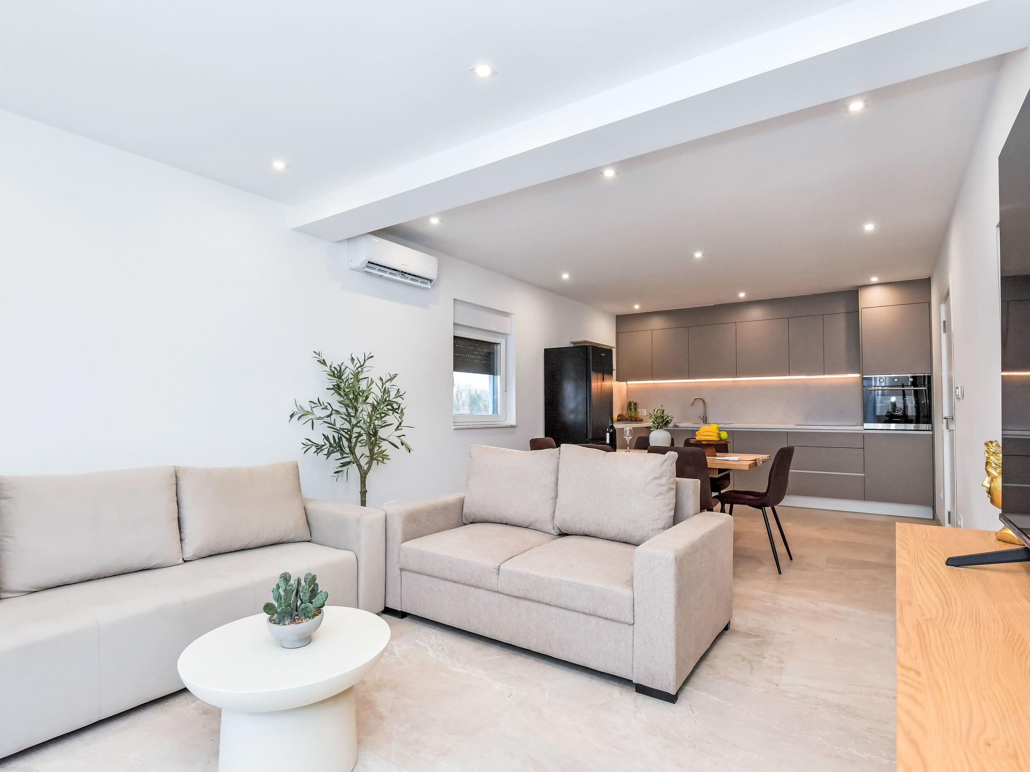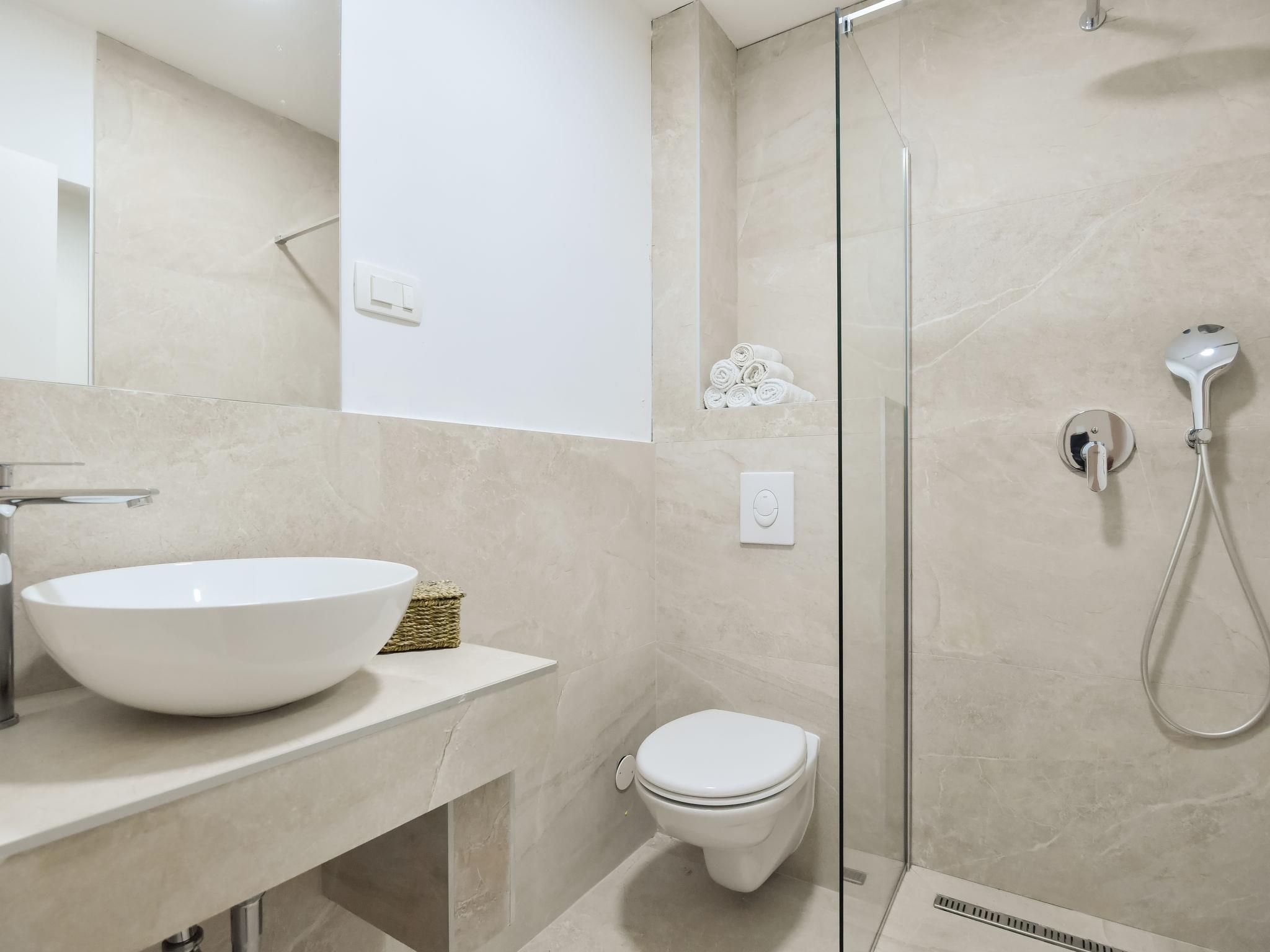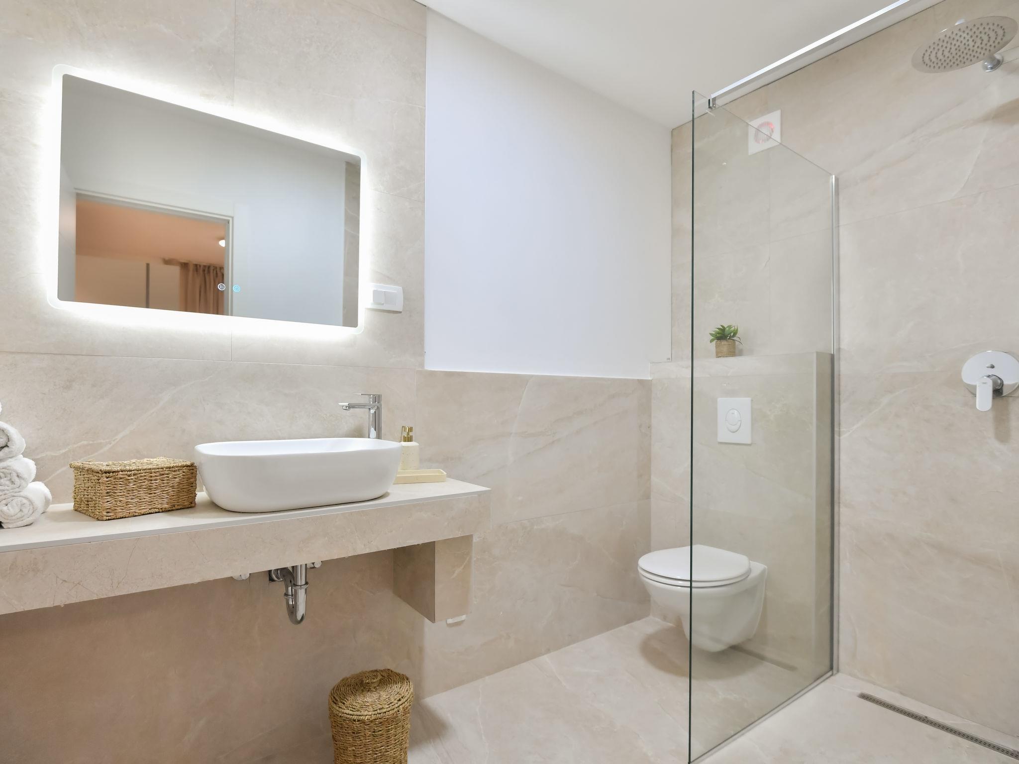 5-room house 150 m2, on the ground floor. Living/dining room with satellite TV (flat screen), air conditioning. Exit to the terrace. 3 rooms, each room with 1 french bed (160 cm, length 200 cm), shower/WC and satellite TV (flat screen), air conditioning. 1 room with 2 beds (90 cm, length 200 cm), satellite TV (flat screen). Open kitchen (oven, dishwasher, 4 ceramic glass hob hotplates, toaster, kettle, microwave, freezer, electric coffee machine). No heating option. Terrace 8 m2, roofed. Terrace furniture. View of the swimming pool.