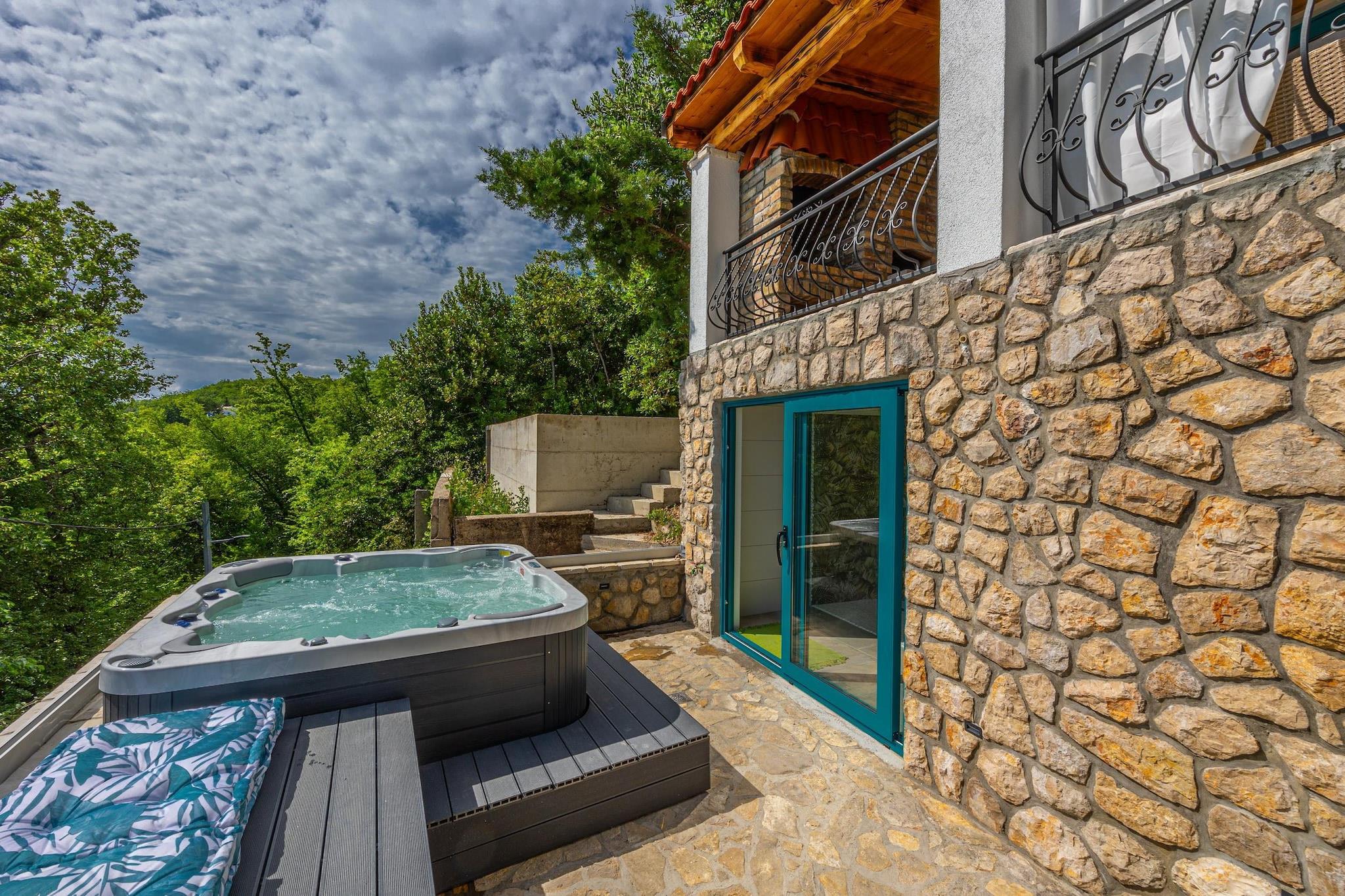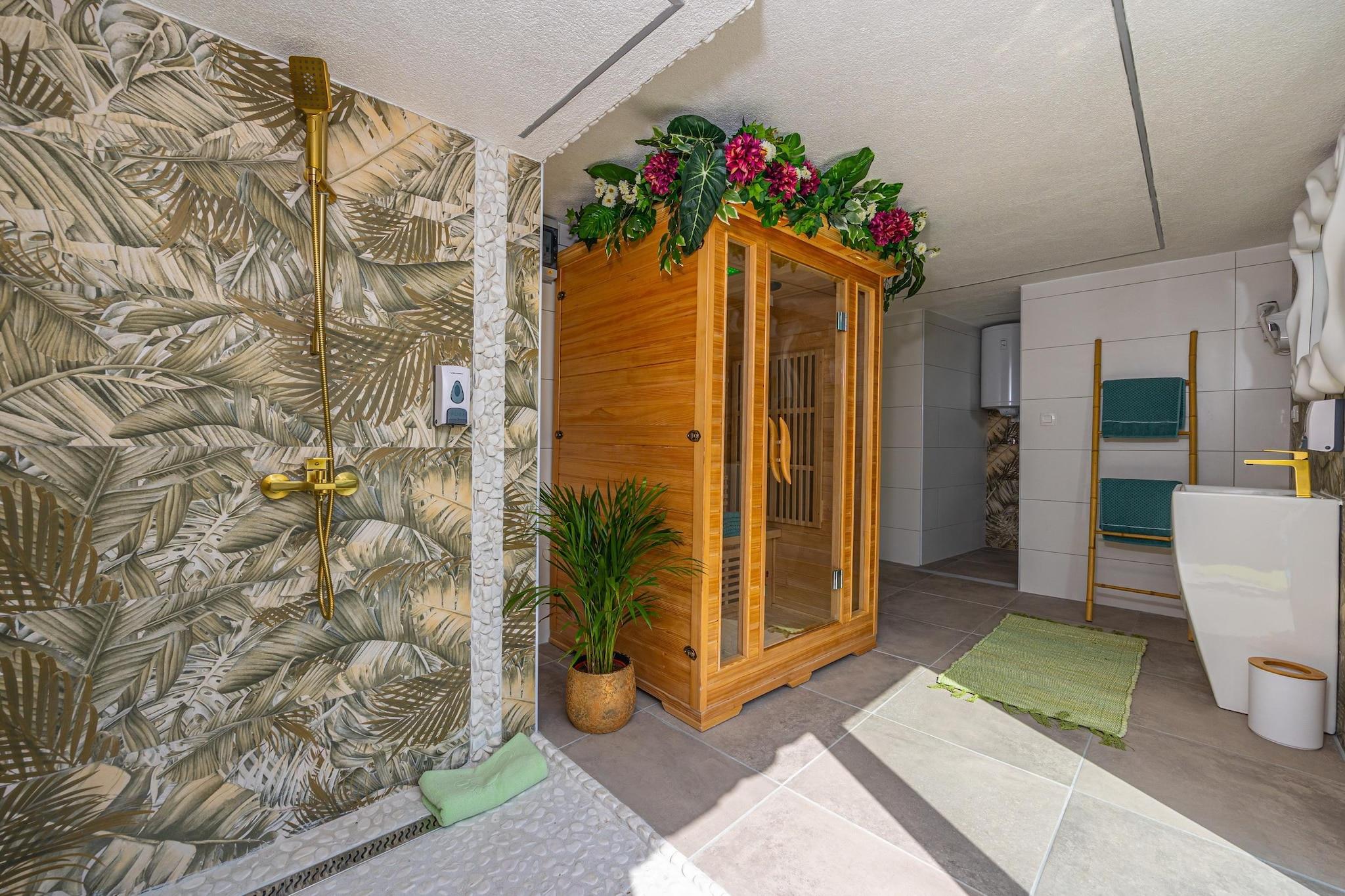 Stueetage: (Stue(Fjernsyn(parabol), sofahjørne), Køkken(spisebord, elkedel, brødrister, komfur, ovn, mikrobølgeovn, opvaskemaskine , køle-fryseskab), badeværelse(bruser, håndvask, toilet), terrasse(privat, indhegnet)) På 1. etage: (soveværelse(dobbeltseng), soveværelse(dobbeltseng), soveværelse(dobbeltseng), badeværelse(bruser, håndvask, toilet), badeværelse(bruser, håndvask, toilet), terrasse(privat)) Bubble bath, sauna(privat), varme, klimaanlæg, havemøbler, grill, strygebræt, loungemøbler