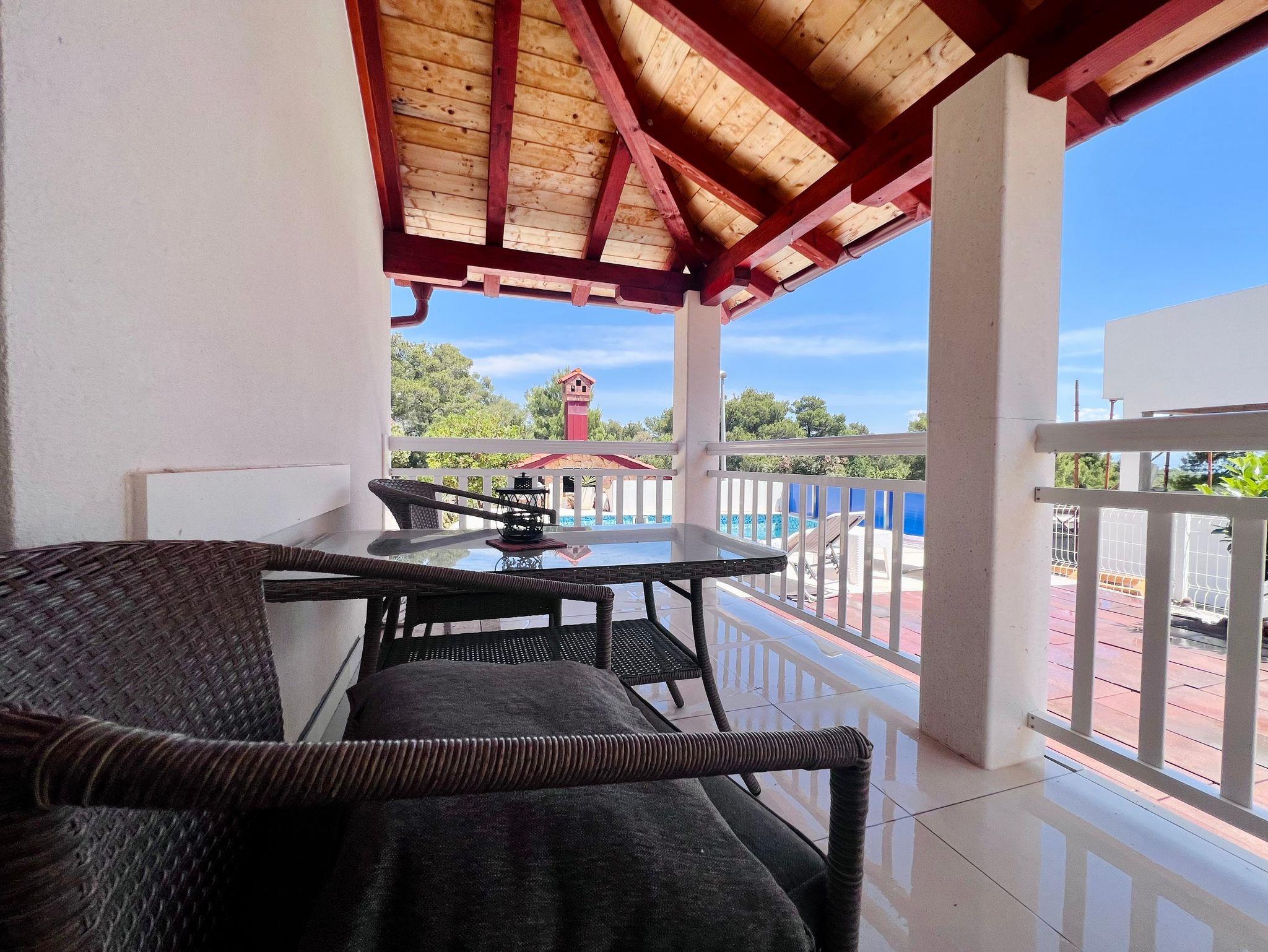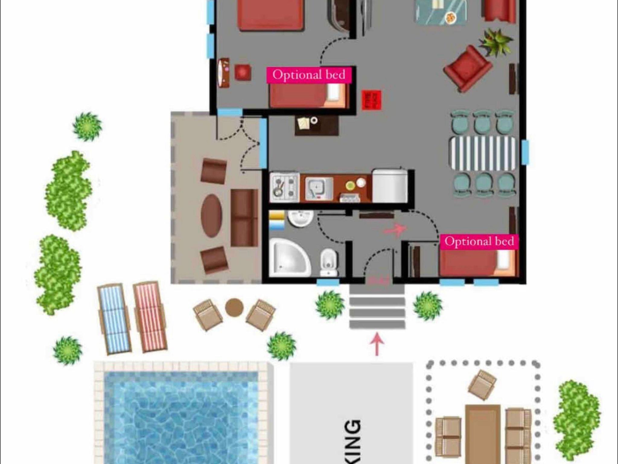 Hof (300m2, Sitzbereich), Parkplatz (Anzahl der Parkplätze: 2, Entfernung vom Objekt: im Hof), Pool: privat, Dimensionen: 4m x 5m x 1m, Wassertyp: Süßwasser, WiFi Internet, Föhn, Bügeleisen, Bügelbrett, Kinderbett