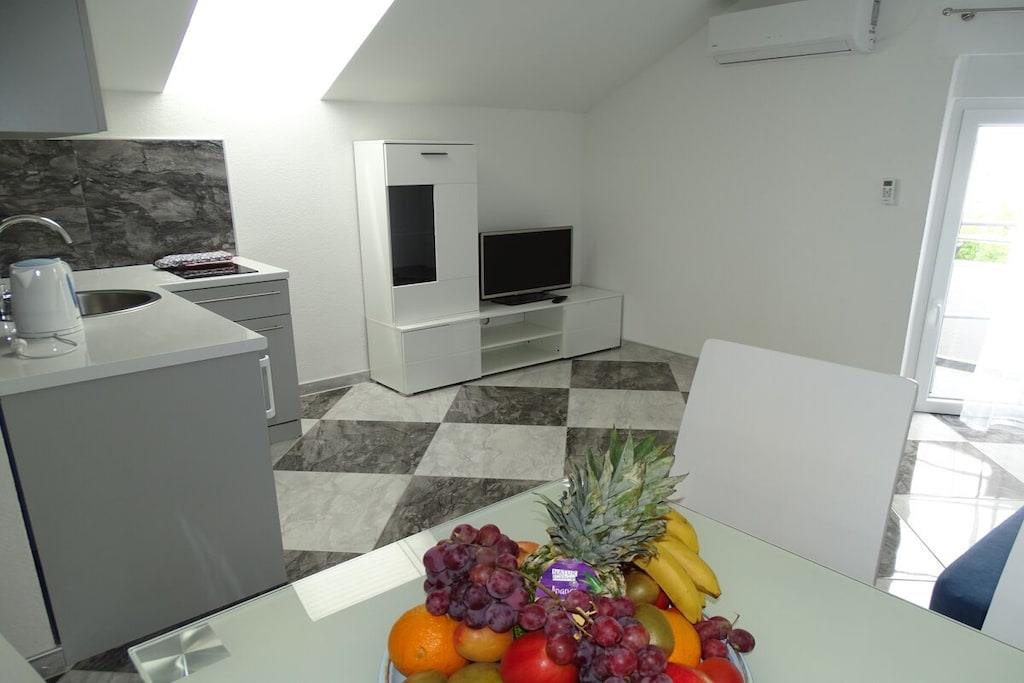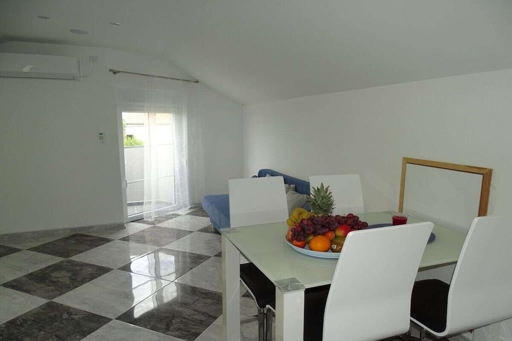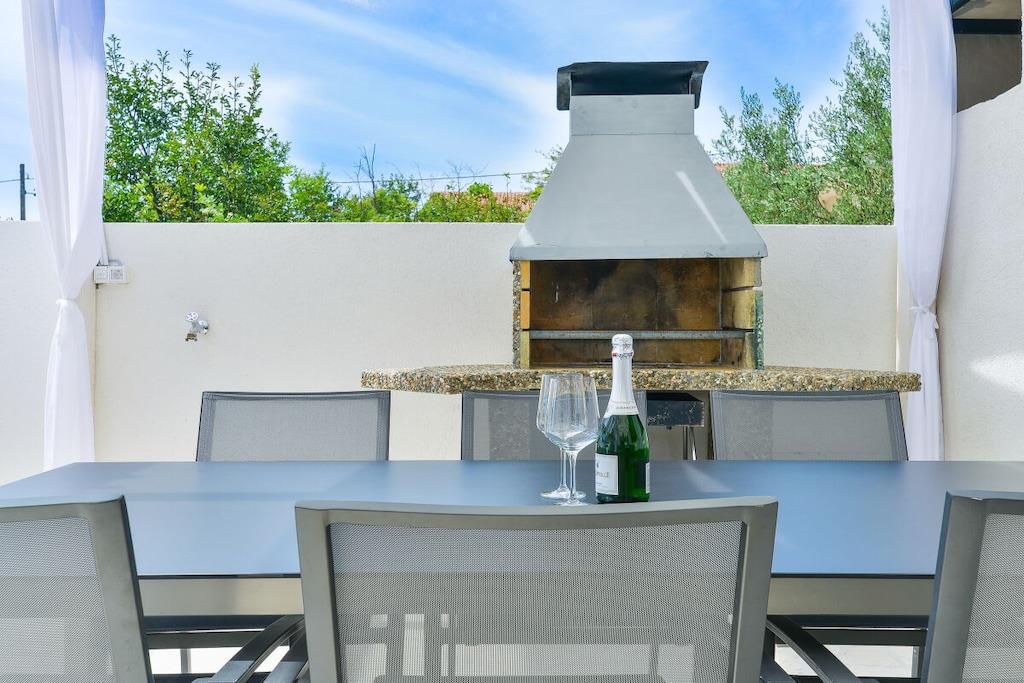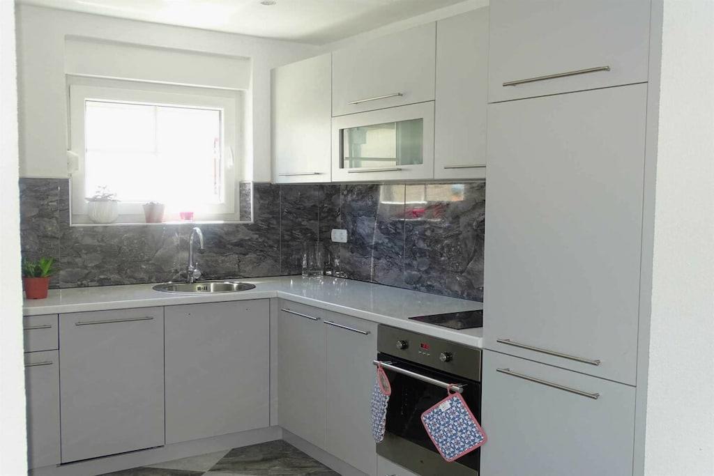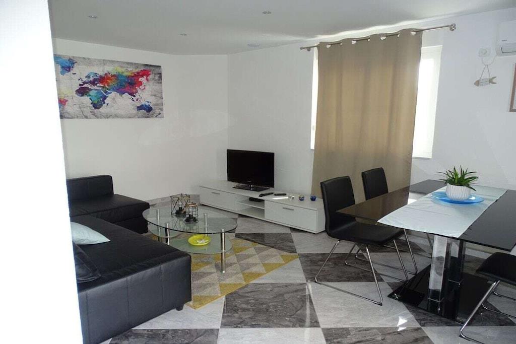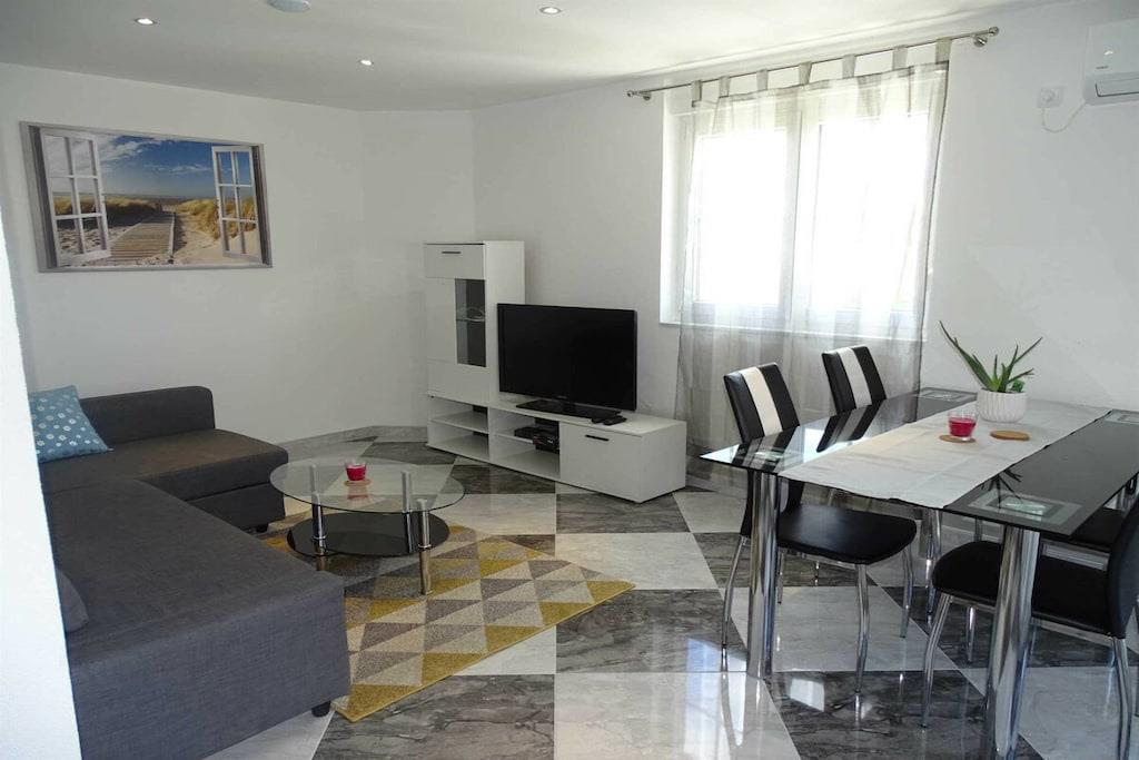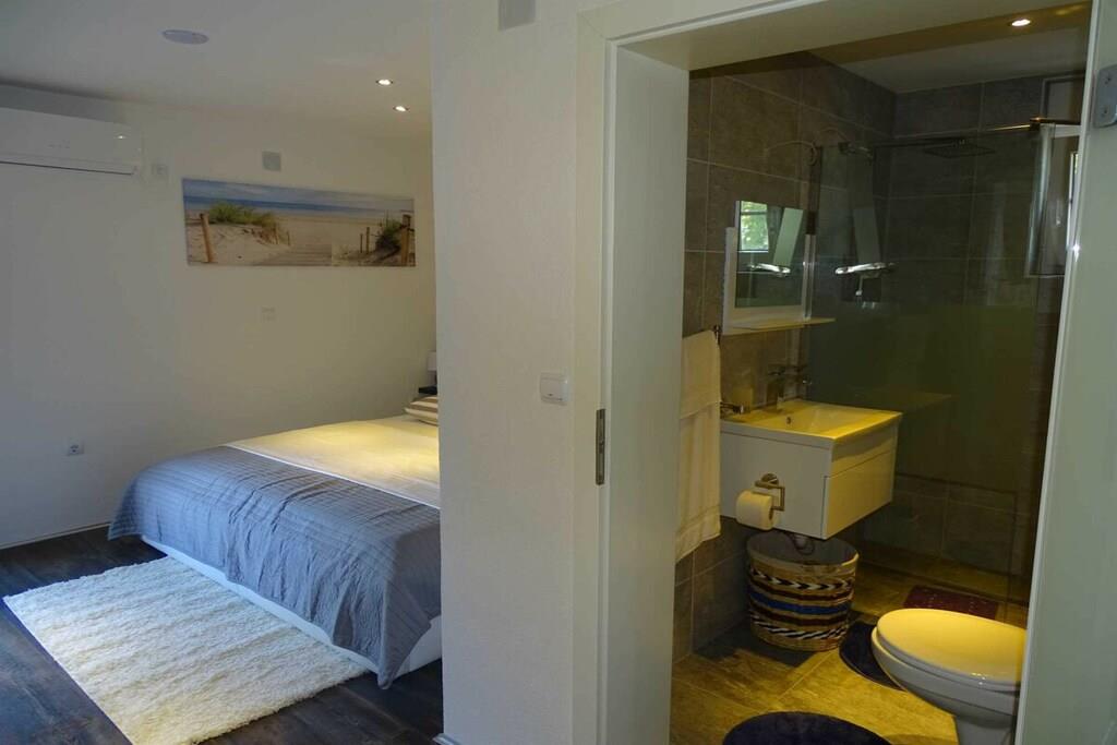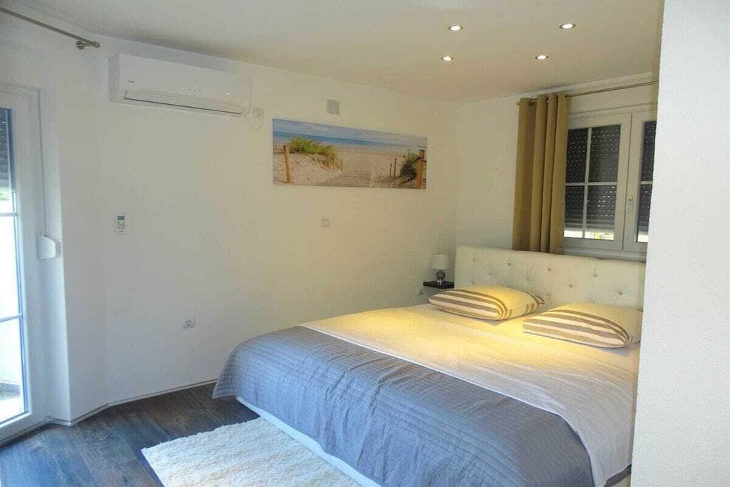 Das geräumige moderne Ferienhaus in perfekter Lage, nur 400 m vom Strand entfernt, mit privatem Pool bietet Privatsphäre und Zugang zu allem, was Sie für einen perfekten Urlaub benötigen. Das Haus besteht aus zwei Wohnungen mit zwei Schlafzimmern und einer Wohnung mit einem Schlafzimmer. Insgesamt gibt es also fünf Schlafzimmer und fünf Bäder. Zwei Wohnungen haben einen Balkon mit herrlichem Meerblick. Die Küchen in den Appartements sind komplett mit neuen Geräten ausgestattet und sofort einsatzbereit. Die Esszimmer, Wohnzimmer und Balkone sind geschmackvoll eingerichtet. Das Ferienhaus bietet 4 kostenlose Privatparkplätze, einen 32 m2 großen Swimmingpool, einen Steingrill, einen Aufenthaltsraum im Freien und einen Essbereich im Freien.