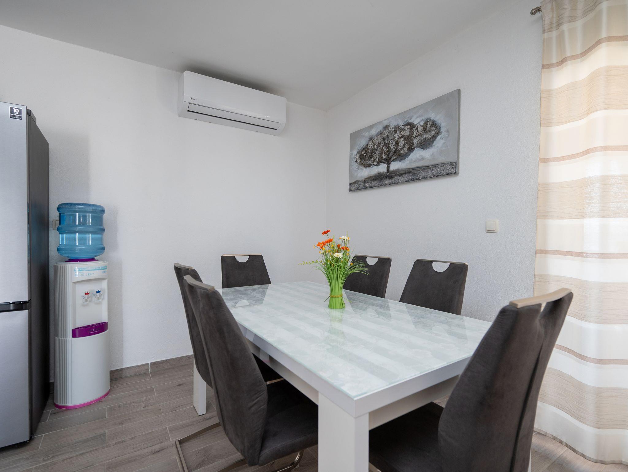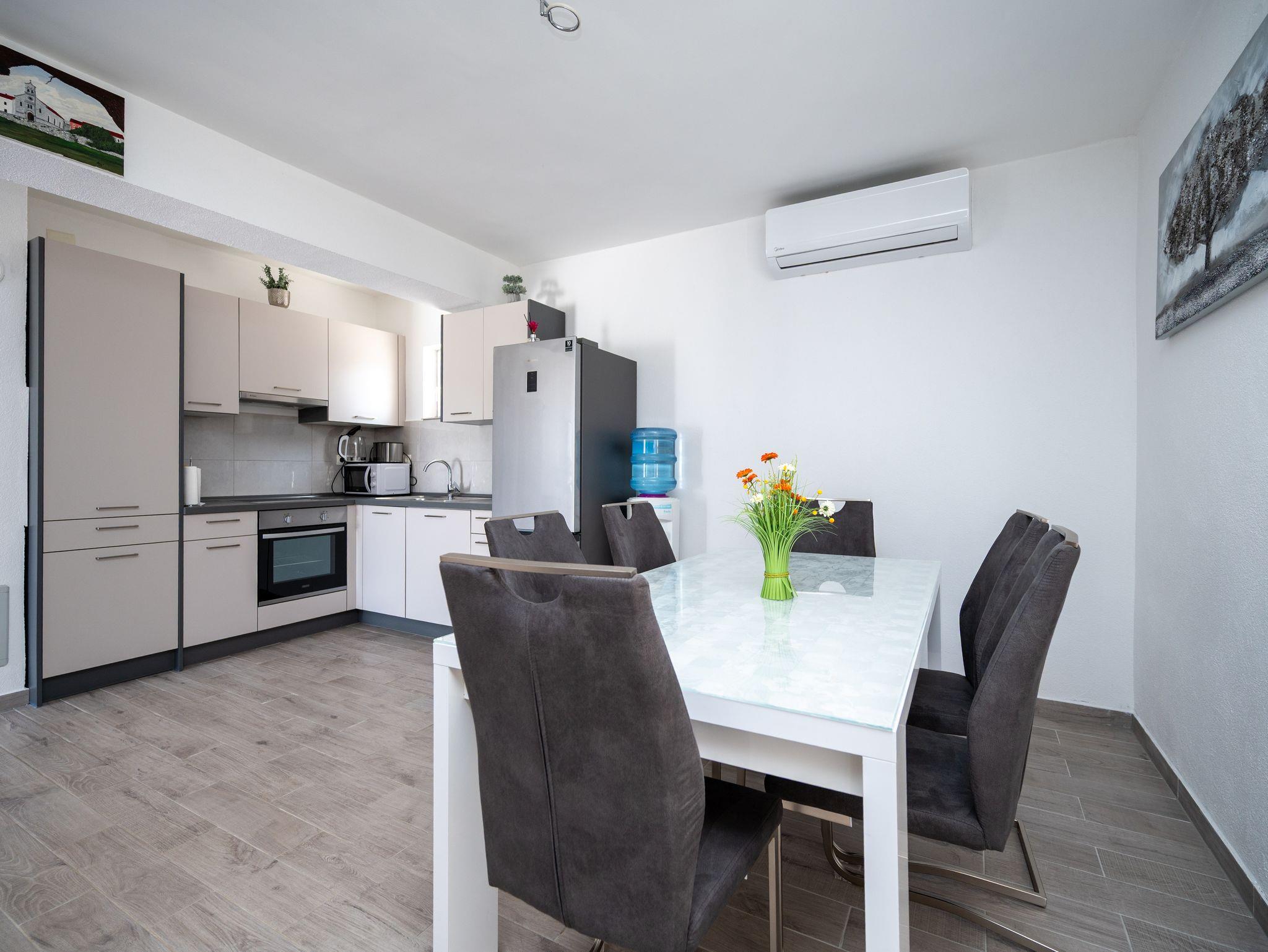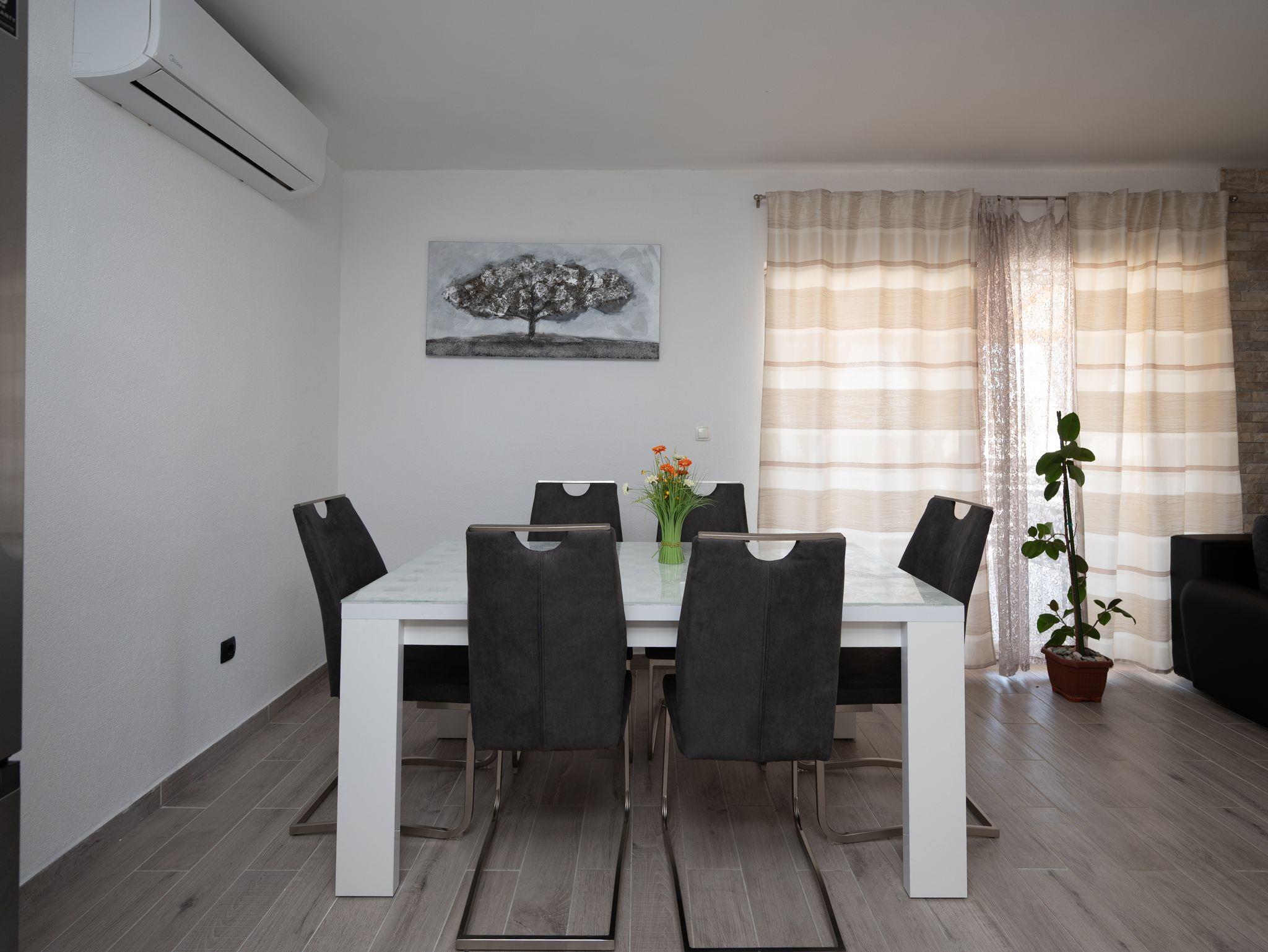 Haus bietet Platz für 6 Gäste. Die Betten sind in Schlafzimmern, die es 2 gibt, und in Wohnzimmer, innerhalb einer Gesamtfläche von 60m2, angeordnet. Die Gäste haben eine eigene Terrasse zur Verfügung, auf der sie in warmen Sommernächten genießen können. Das Haus bietet Meerblick. Für vollen Genuss und Entspannung gibt es einen privaten Grill für Gäste dieser Unterkunft. Während ihres Aufenthalts können Gäste das gemeinsam zur Nutzung stehende Schwimmbad benutzen. In der Unterkunftseinheit besteht die Möglichkeit des Mitbringens von Haustieren gegen Aufpreis. In der gebuchten Unterkunftseinheit zahlt man am Ort ein Depositum ( der Preis ist an der Internetseite angeführt ). IM PREIS INBEGRIFFEN: Kurtaxe, Endreinigung, Klimatisierung, Pool, Parkplatz, Internet, Bügeleisen, Bügelbrett, Föhn. VERBINDLICHE ZUSÄTZLICHE KOSTEN: Kaution (300,00 € Einmalzahlung). UNVERBINDLICHE ZUSÄTZLICHE KOSTEN: Haustiere (10,00 € pro Nacht). Die Verfügbarkeit zusätzlicher Dienstleistungen in Ihrem reservierten Termin und die Preise derselben (falls nicht aufgeführt) müssen im Voraus überprüft werden. Zusätzliche Dienstleistungen die in der Zahlungsaufforderung nicht aufgeführt sind werden direkt beim Vermieter bezahlt, angenommen der Gast nutzt auch diese.