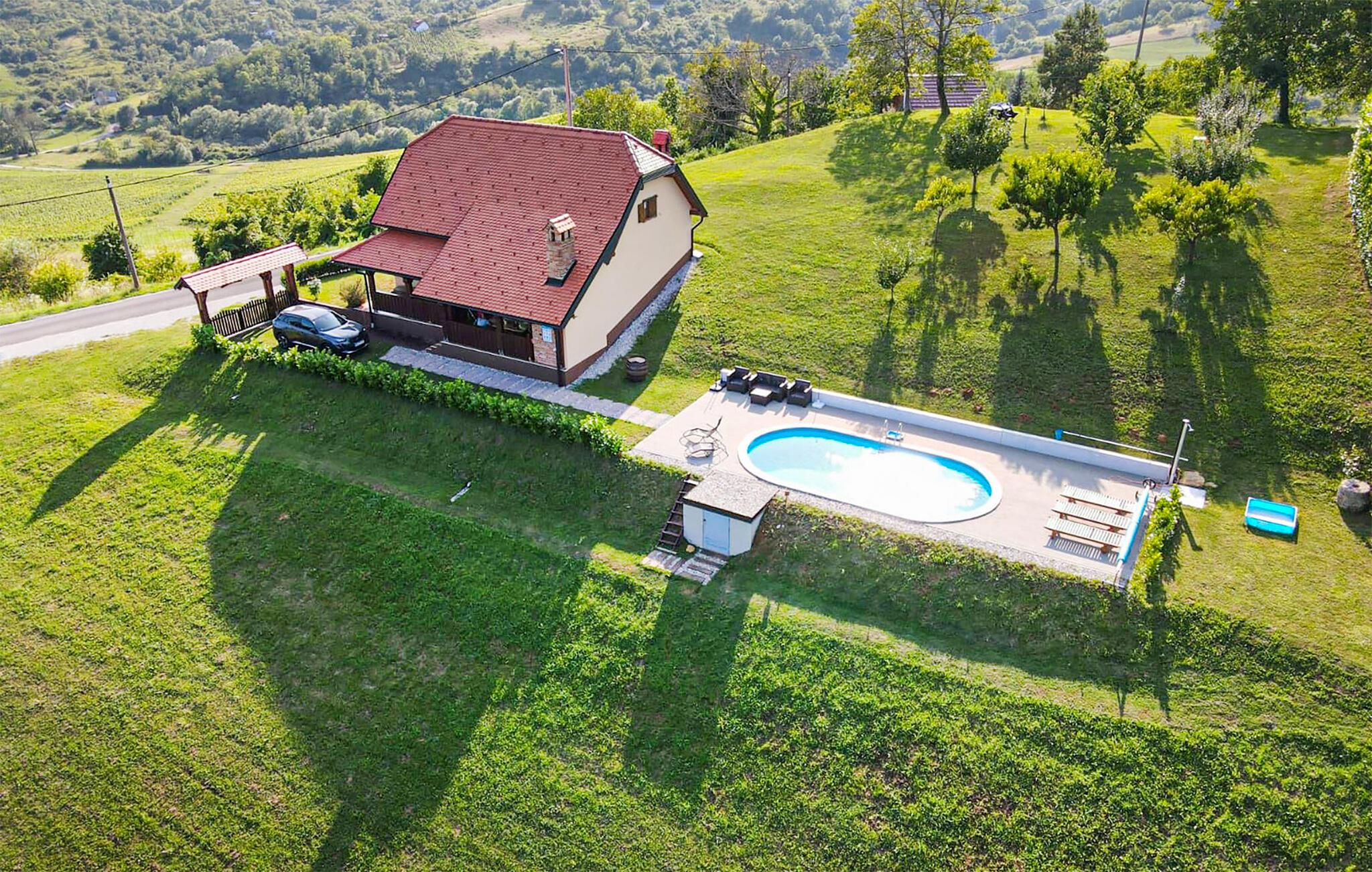 Dette feriehus ligger ikke langt fra Jastrebarsko og kan rumme seks personer, som kan fordele sig i de tre soveværelser, mens der også er to badeværelser. Tilbring en ubekymret og afslappet ferie i naturen omgivet af frugtplantager og vinmarker - langt fra byens stress og jag.