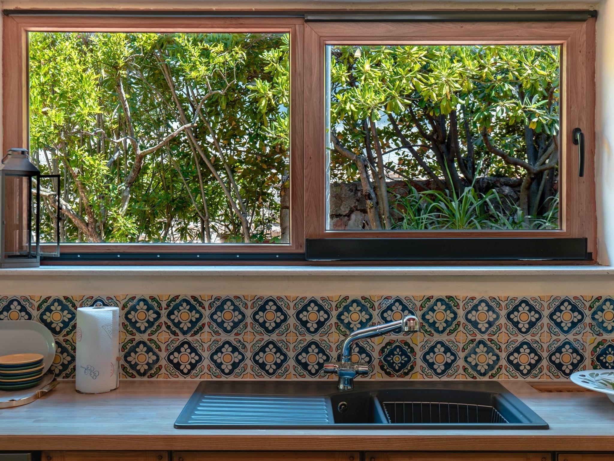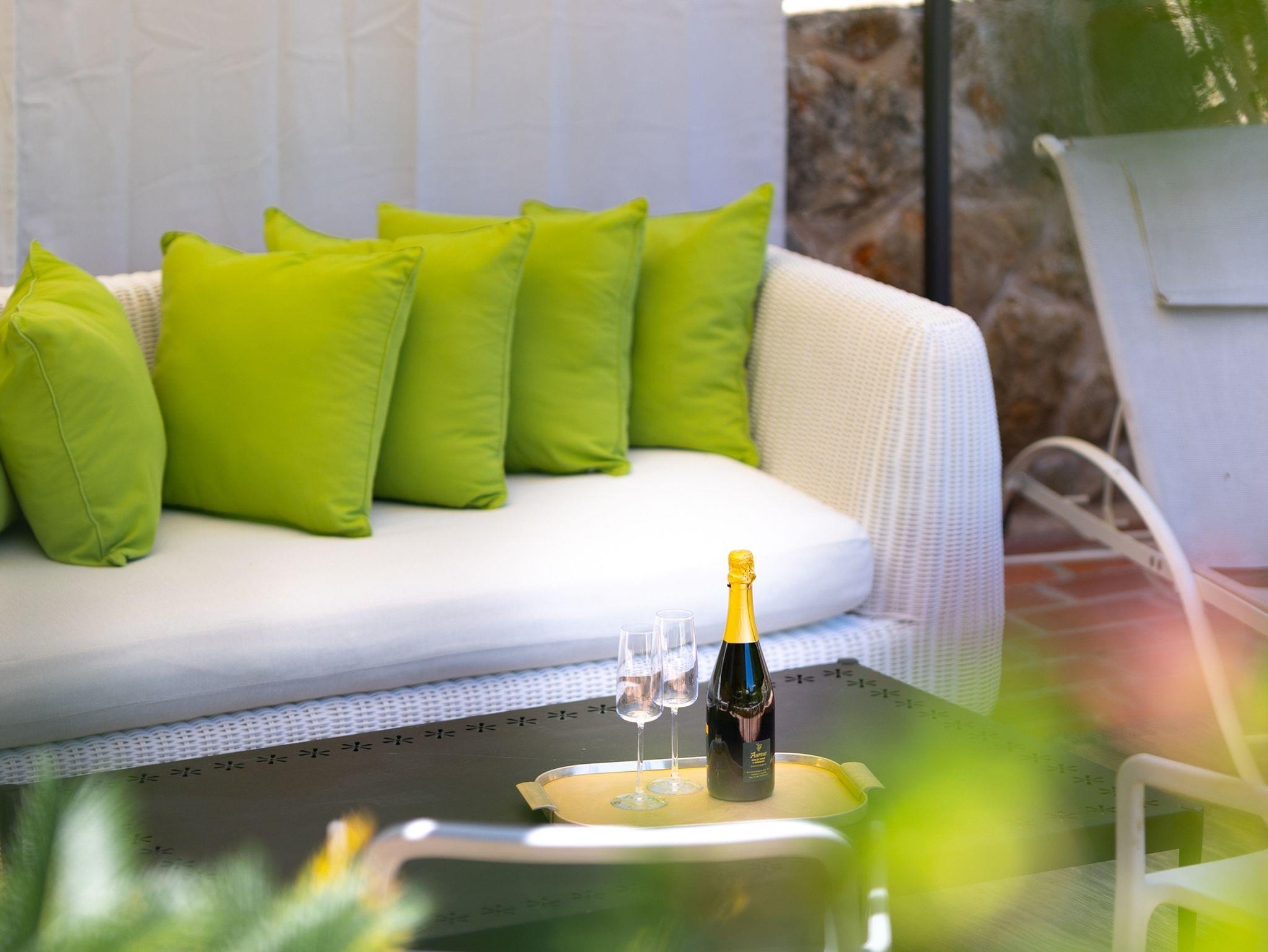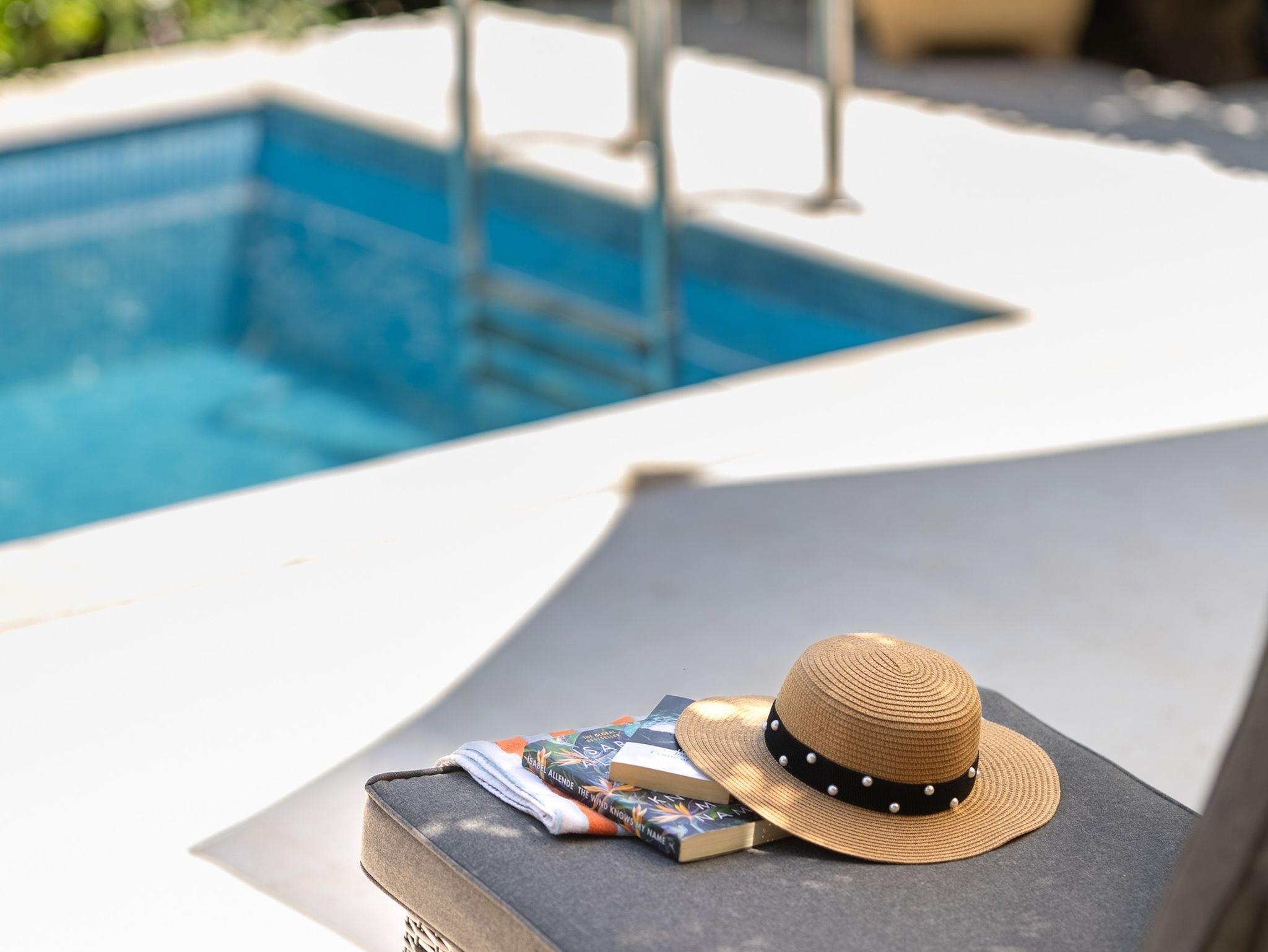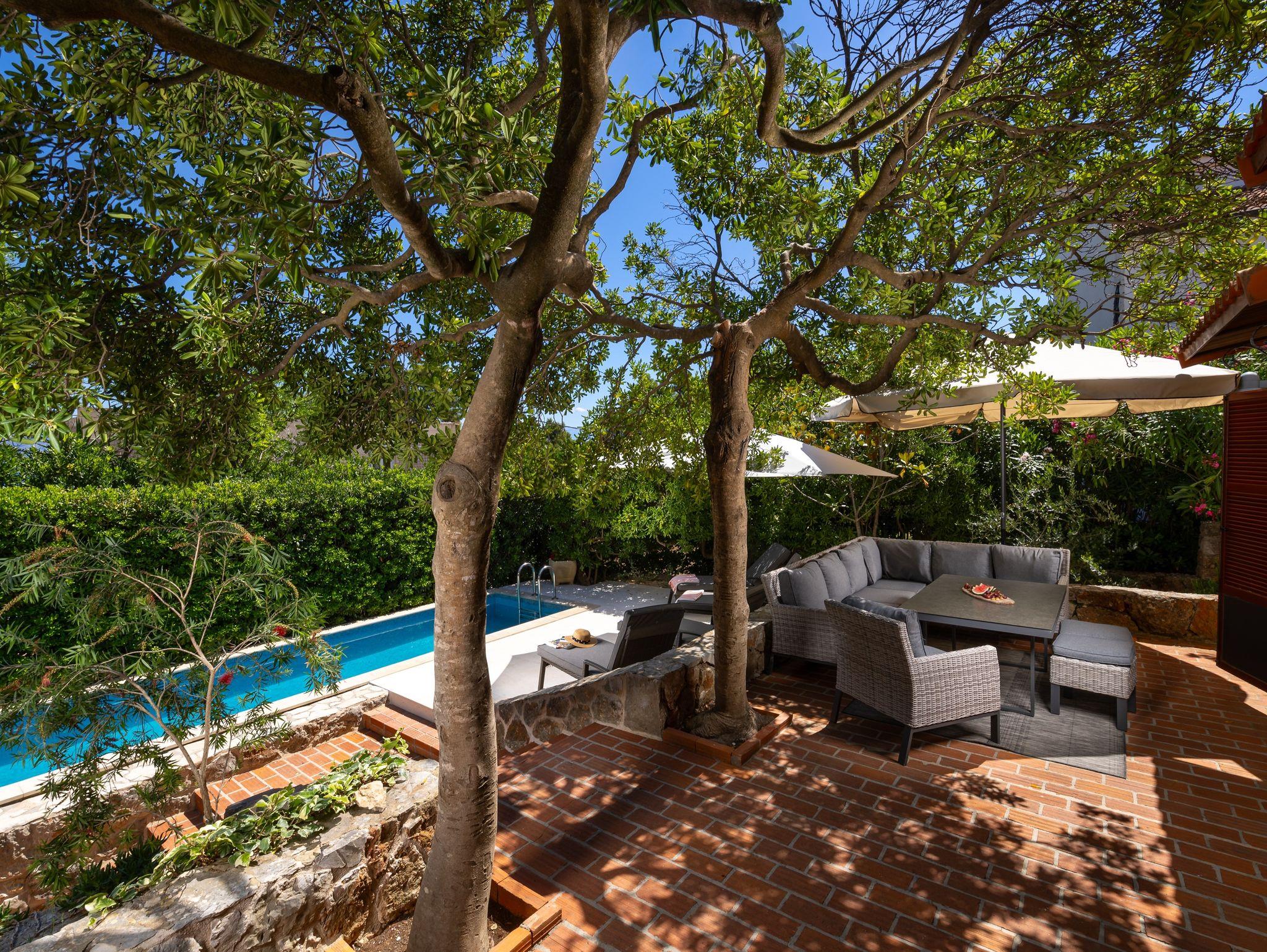 Umgebung des Objekts (Eingerichtet), Hof (150m2, Kinderbereich, Sitzbereich), Parkplatz (Anzahl der Parkplätze: 3, Entfernung vom Objekt: im Hof), Pool: privat, Wassertyp: Süßwasser, WiFi Internet, Föhn, Bügeleisen, Bügelbrett, Kinderbett