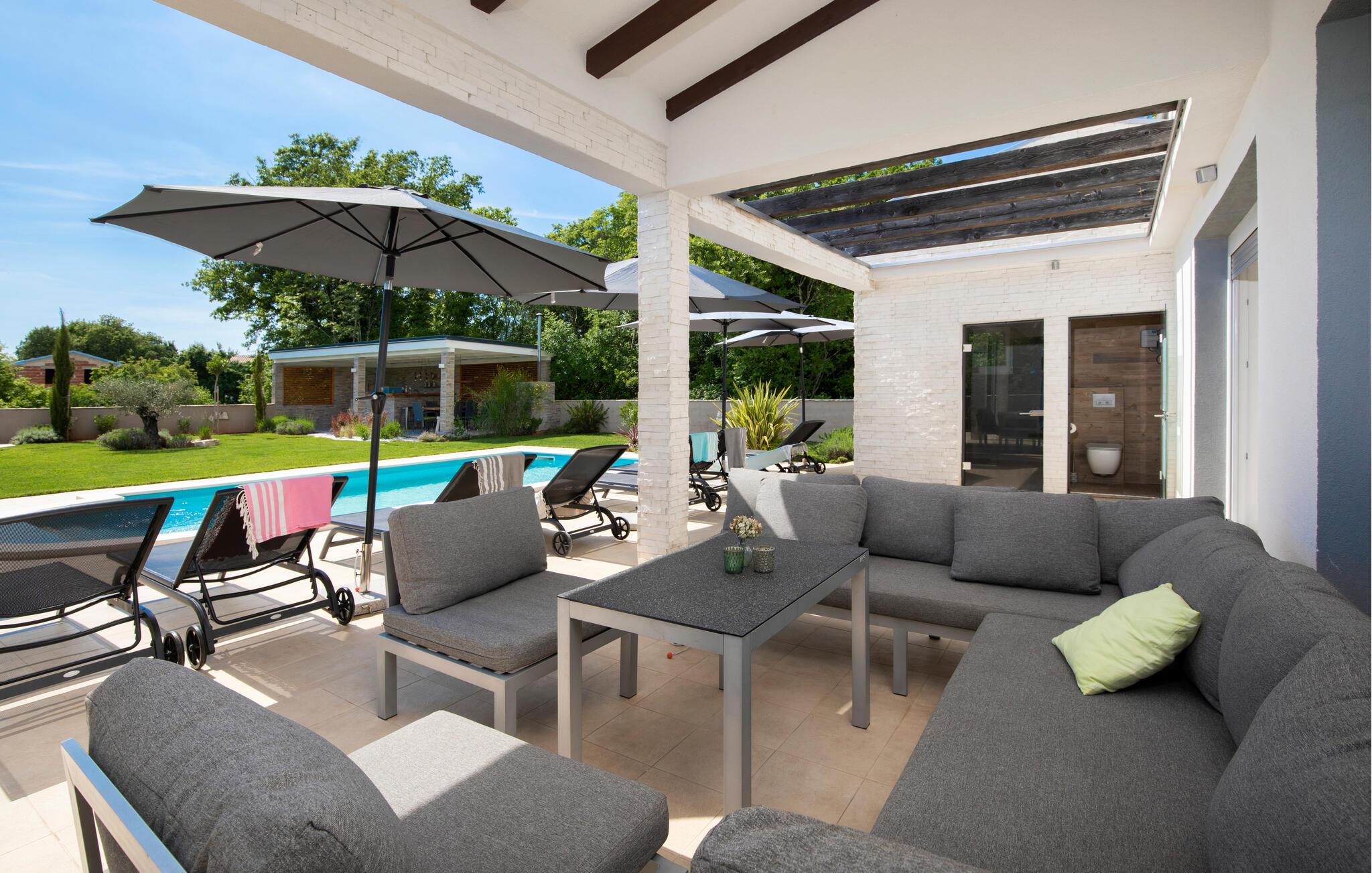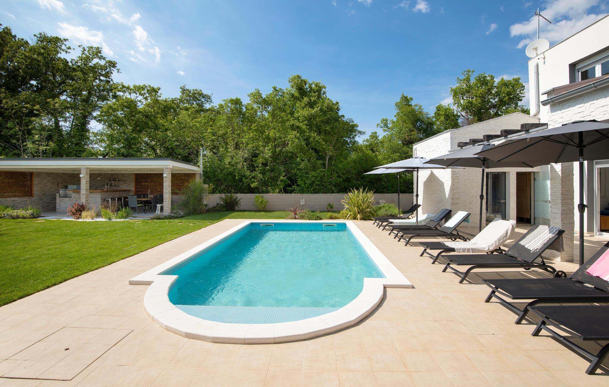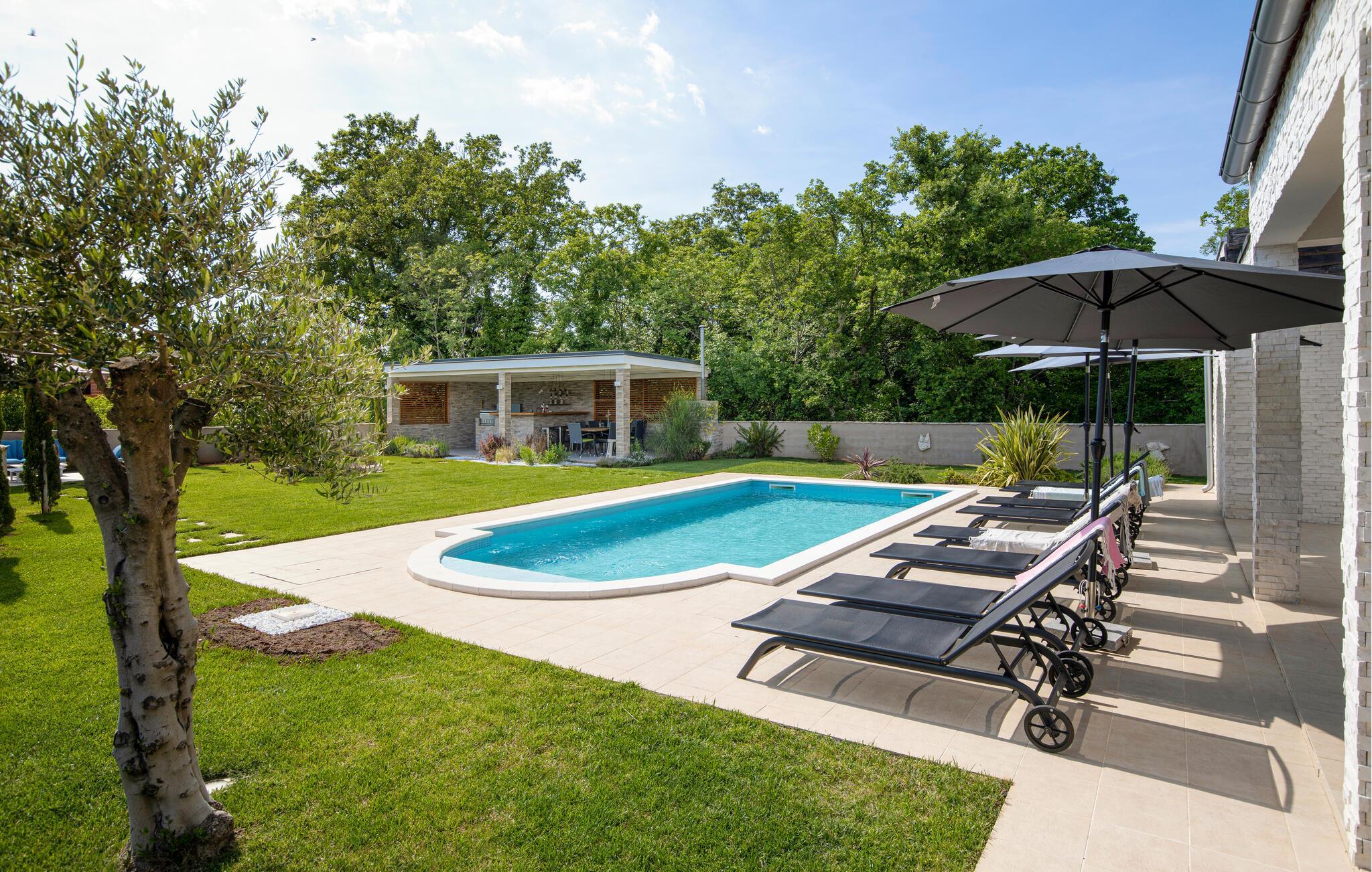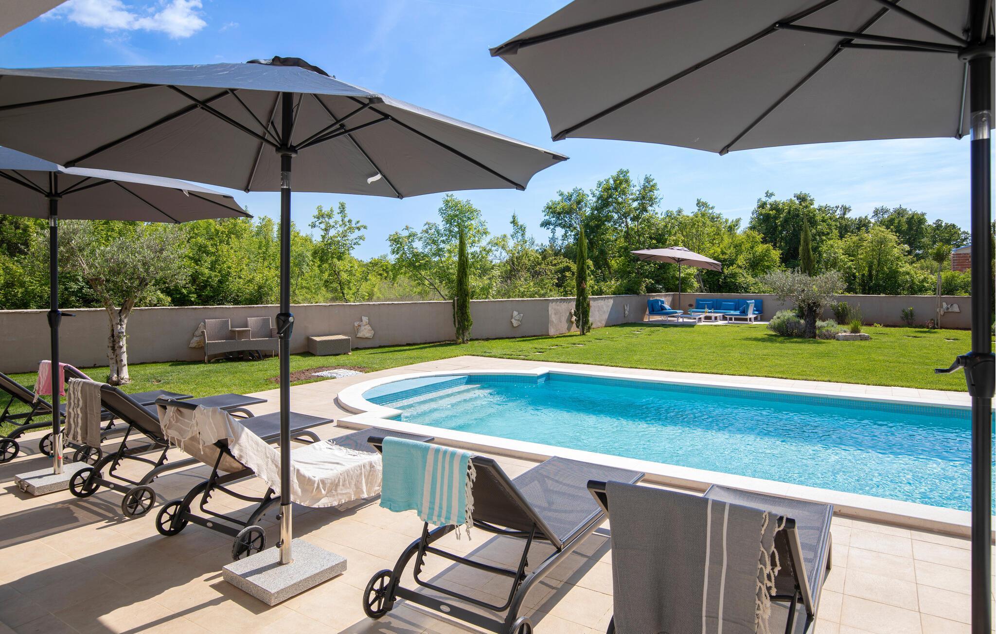 Draußen lädt der private Pool zum Schwimmen oder Entspannen auf den Sonnenliegen ein, während Sie ein Buch lesen oder einfach nur die Seele baumeln lassen.