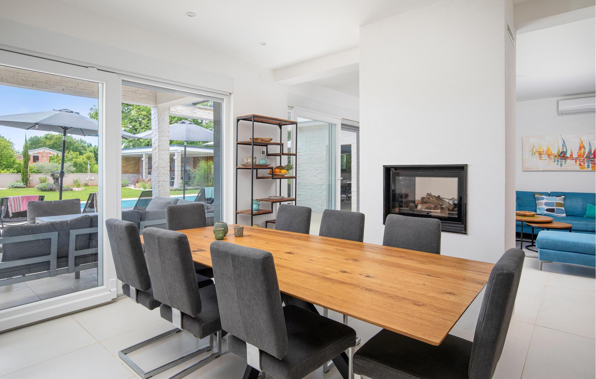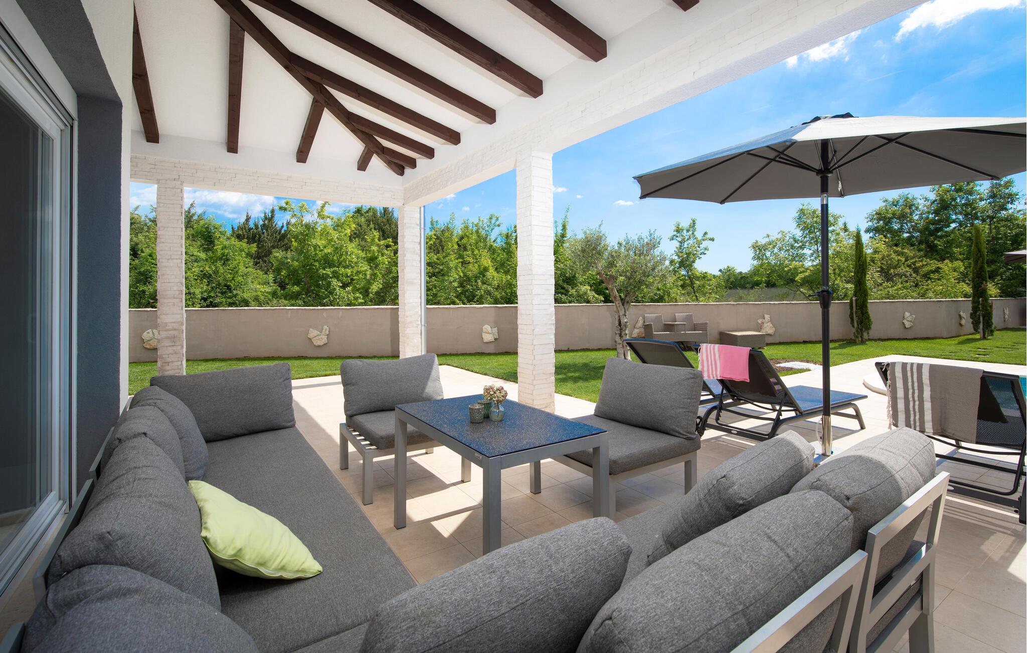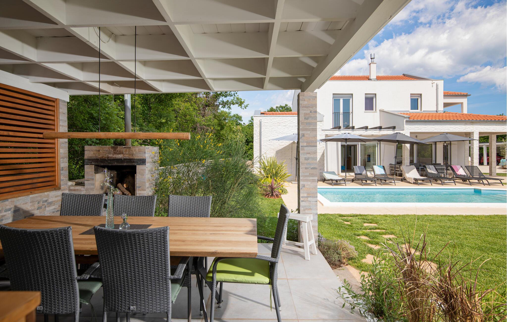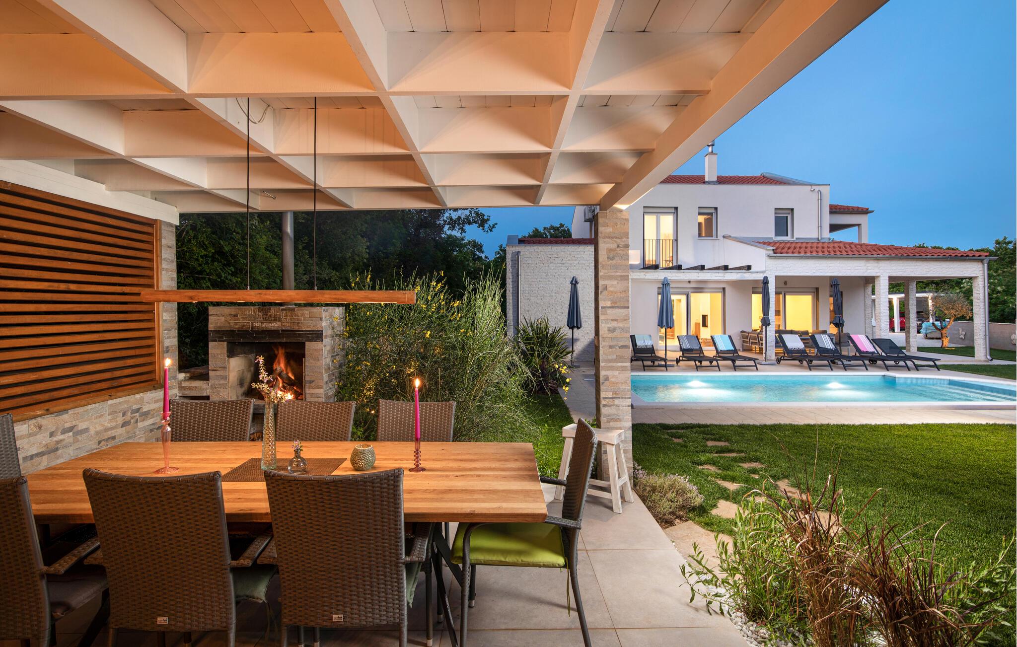 Draußen lädt der private Pool zum Schwimmen oder Entspannen auf den Sonnenliegen ein, während Sie ein Buch lesen oder einfach nur die Seele baumeln lassen.
