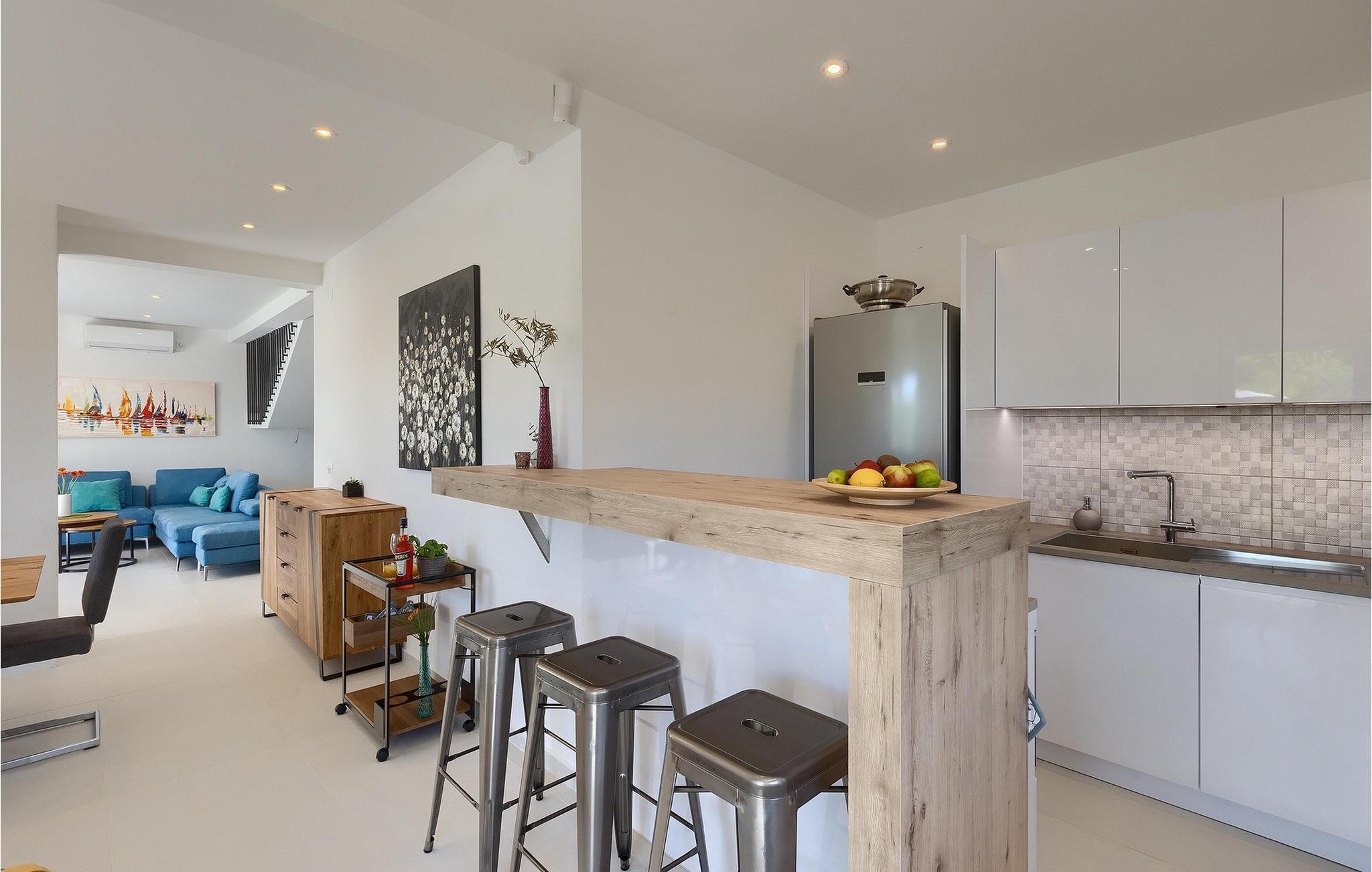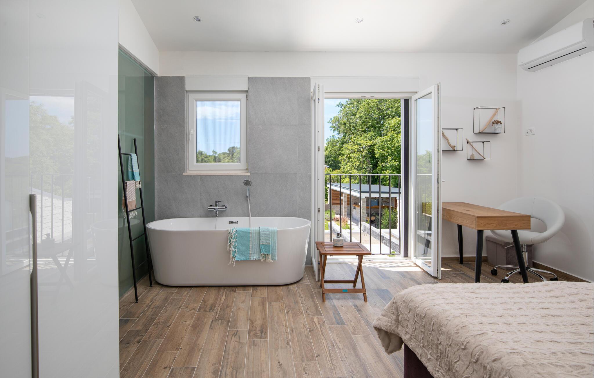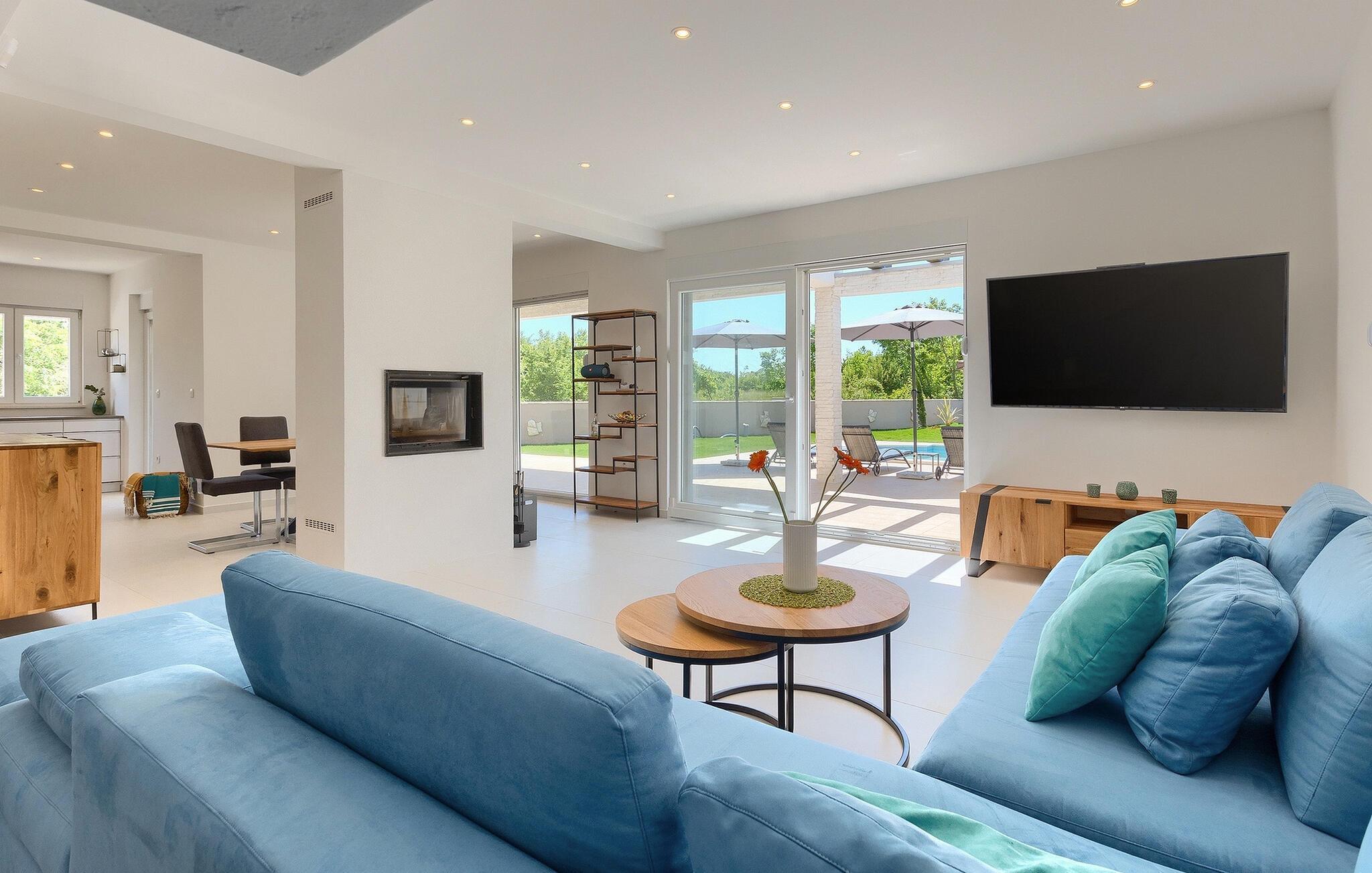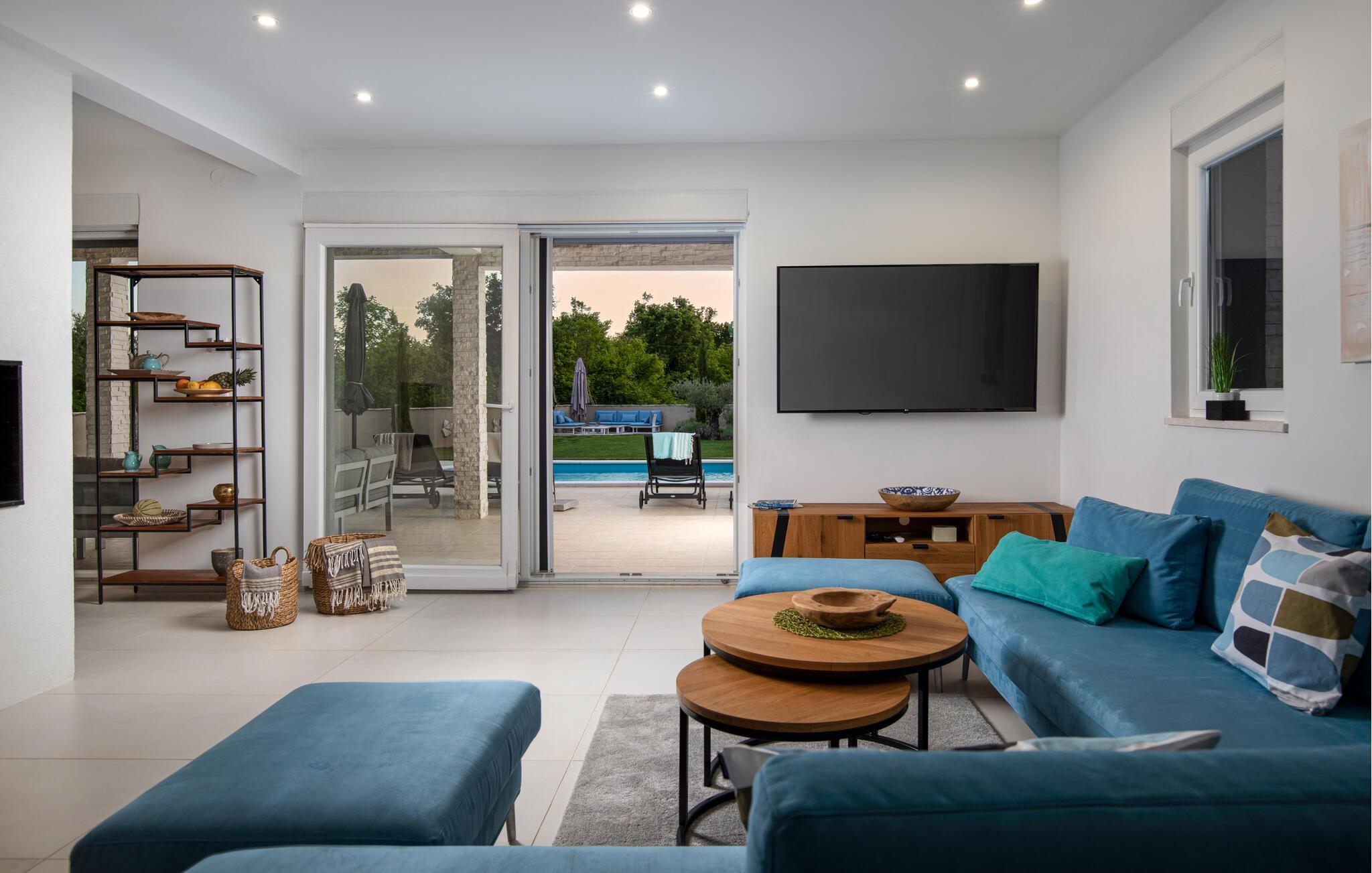 Draußen lädt der private Pool zum Schwimmen oder Entspannen auf den Sonnenliegen ein, während Sie ein Buch lesen oder einfach nur die Seele baumeln lassen.