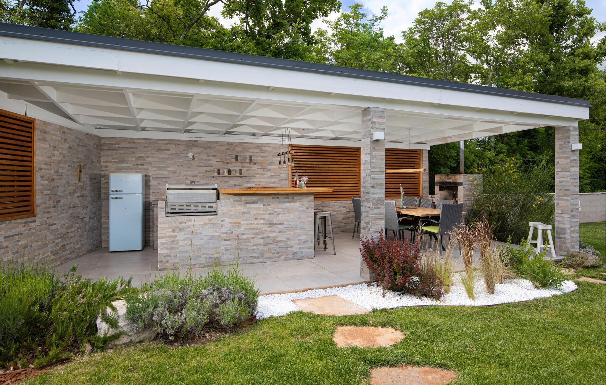 Neben dem schönen Pool, verfügt der Außenbereich über 4 verschiedene Rückzugsbereiche (Terrasse, Loggia, Sommerküche und Lounge-Bereich) Die Sommerküche mit Gasgrill, Kühlschrank, Bartheke & Außenessbereich, bieten Ihnen und Familie & Freunden einen idealen Ort, um lokale gastronomische Köstlichkeiten zuzubereiten und zu geniessen. Der Loungebereich am Ende des Gartens, eignet sich zur totalen Erholung, mit Blick auf den Pool und den schönen Garten. Die Loggia im Obergeschoß dient mit dem schönen Ausblick auf die unberührte Natur der Umgebung zum Entspannen, mit einer Tasse Tee oder Kaffee, und ist über zwei der Schlafzimmer sowie die Außentreppe erreichbar.