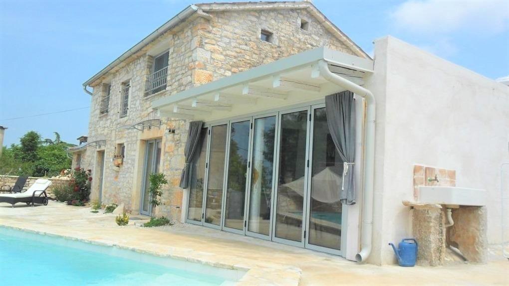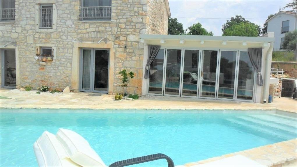 Wunderschönes und komplett neu renoviertes, original istrisches Natursteinhaus mit sagenhaftem Meerblick, tollem solarbeheiztem Pool, der bei Bedarf auch mittels Luftwasserwärmepumpe beheizt wird und überdachter Terrasse, die mit wenigen Handgriffen als Wintergarten genutzt werden kann.
