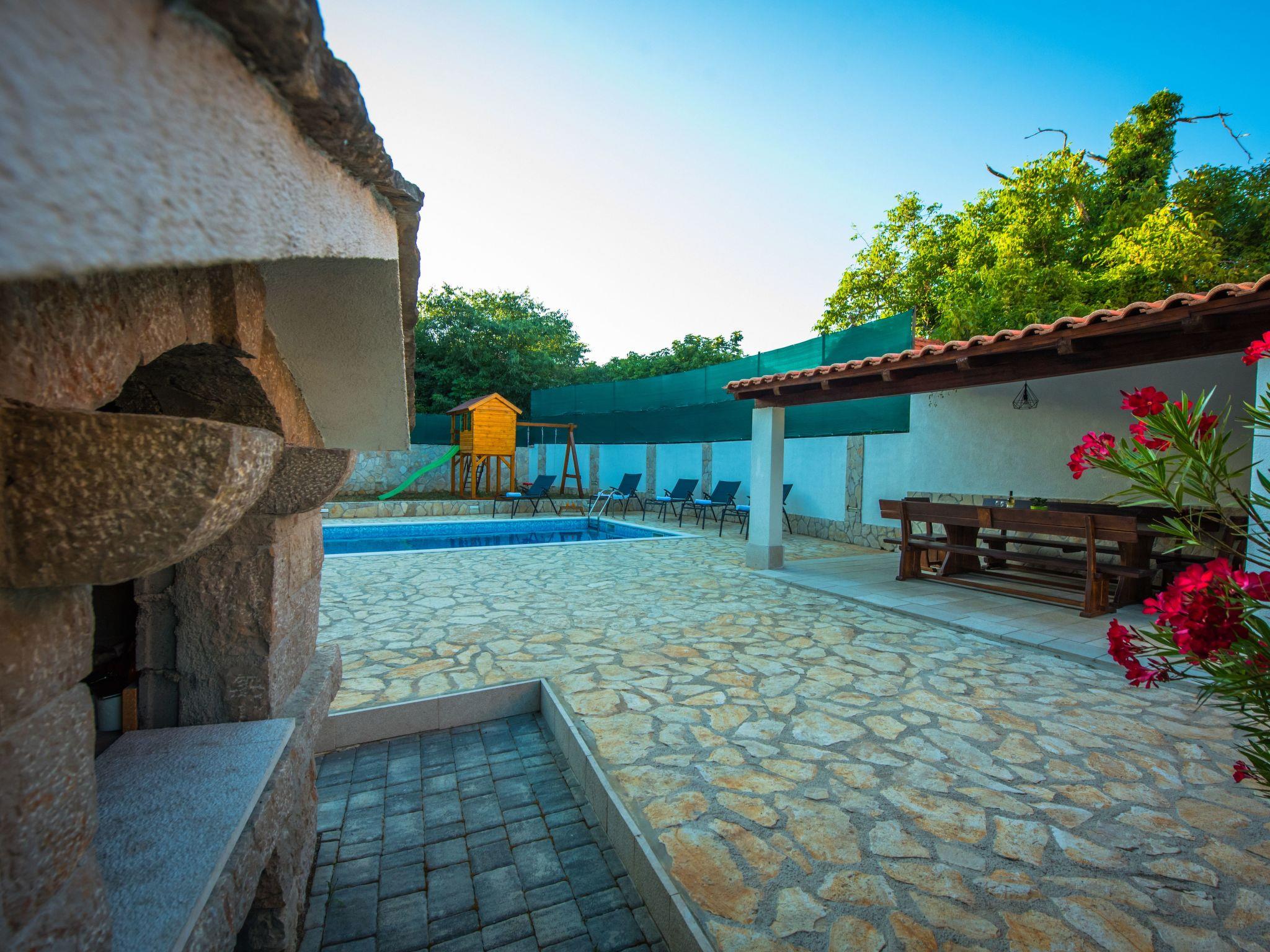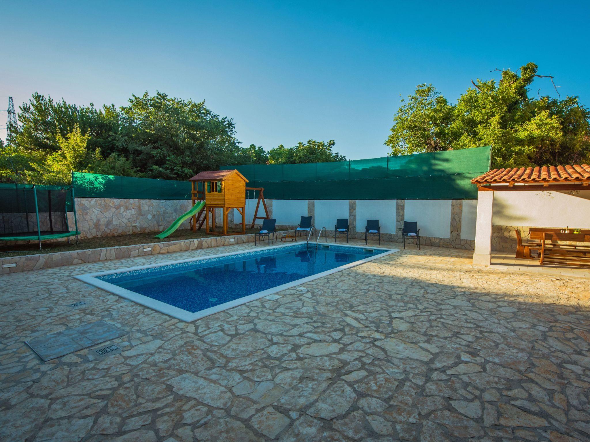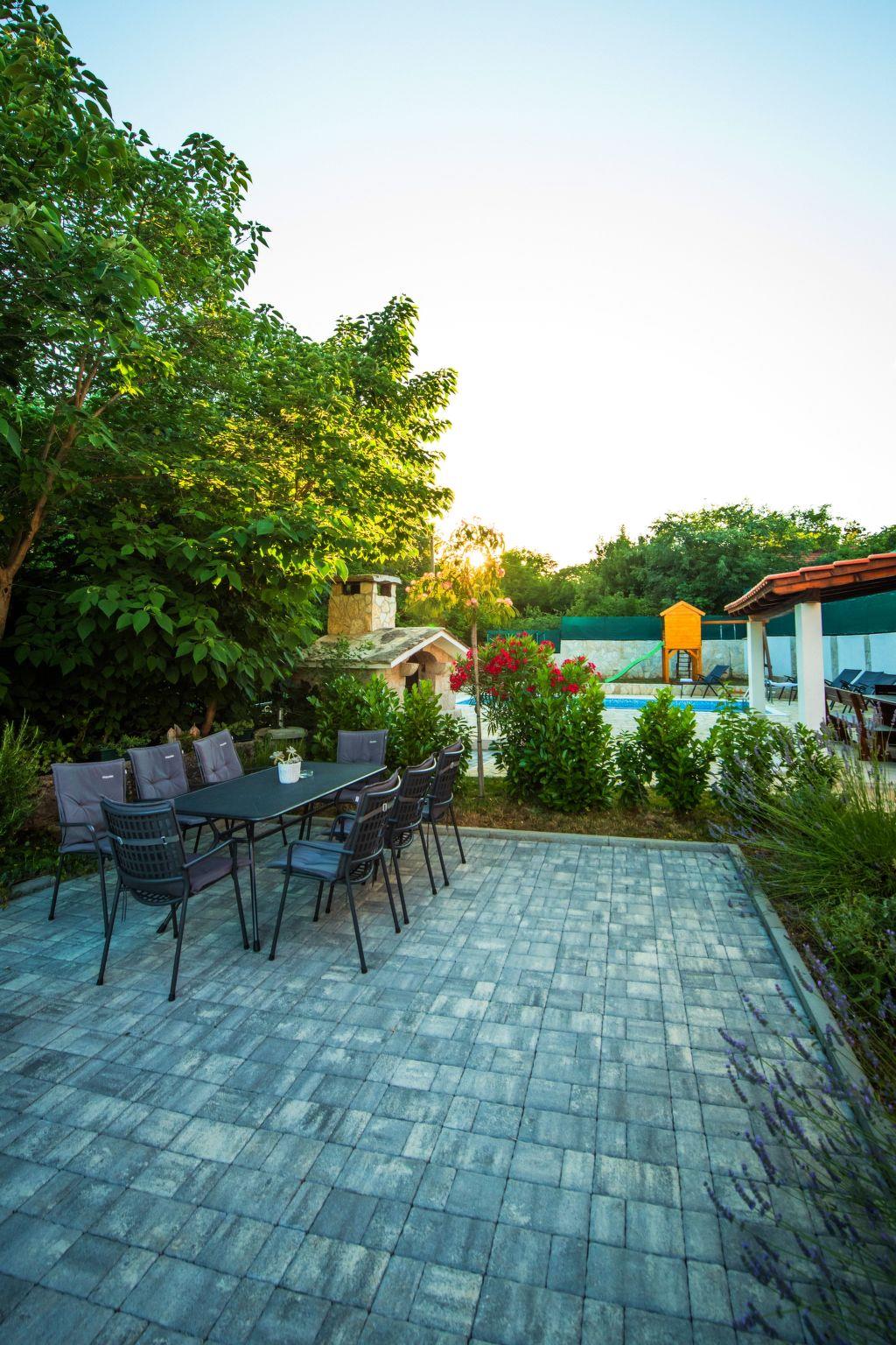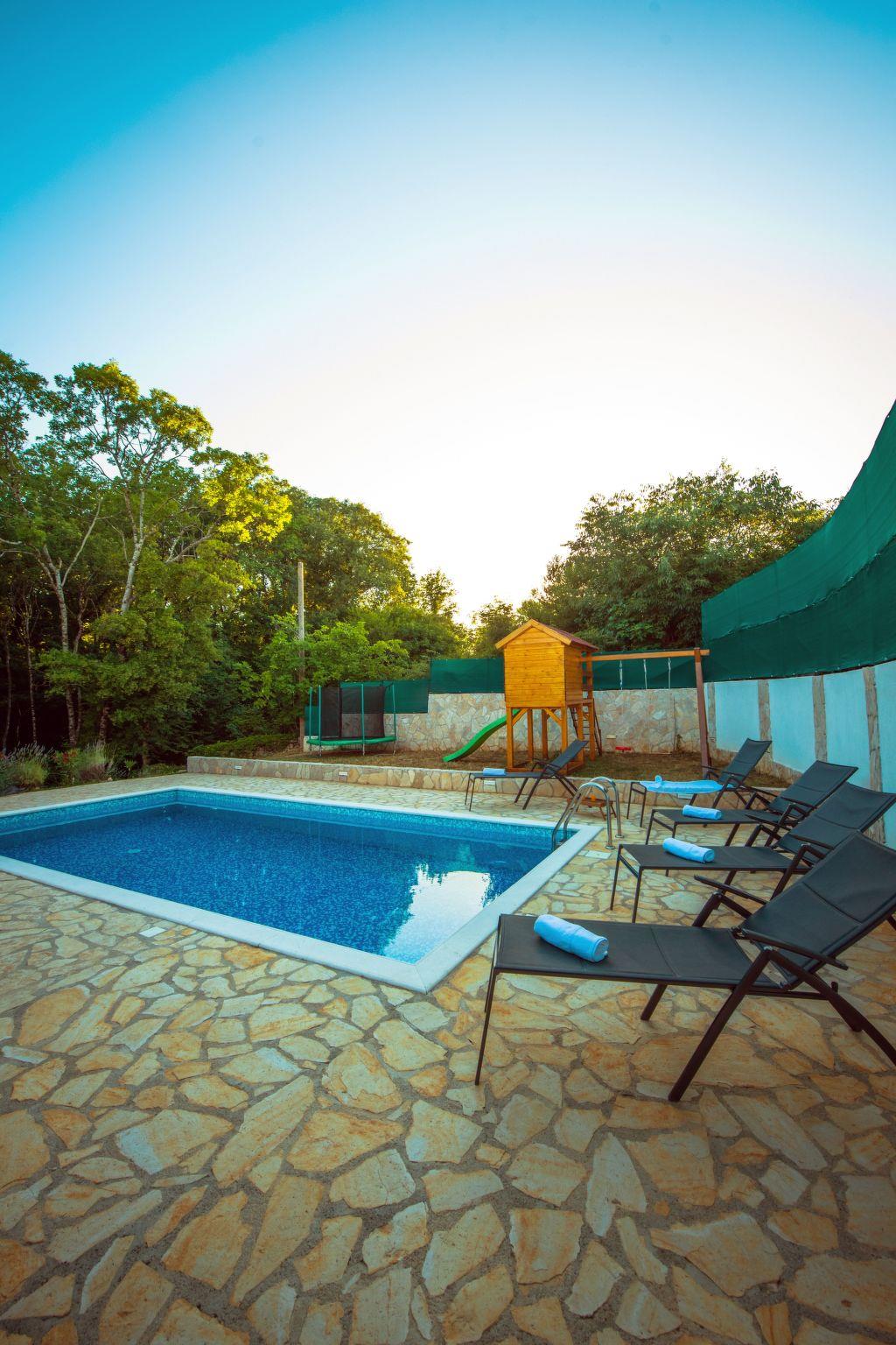 Villa has everything you need for a perfect holiday in this peaceful and quiet environment and it's ideal if you want to enjoy family days out and also if you want friends gathering vacation. The house can accommodate 8 persons and is divided in two parts: ground floor and the first floor. On the ground floor there is a large living room, a kitchen, a dining room, one bedroom with double beds and one bathroom. On the first floor there are 2 bedrooms with double beds, 1 bedroom with 2 single beds and also one bathroom. House is air conditioned and outside pool (32 m²) will give you refreshment during summer days. There is also washing machine on your disposal. The house disposes with a beautiful garden and typical fireplace on wood for BBQ, as well as the private parking. In front of villa is field for playing sports and the playground for children in our private garden.
