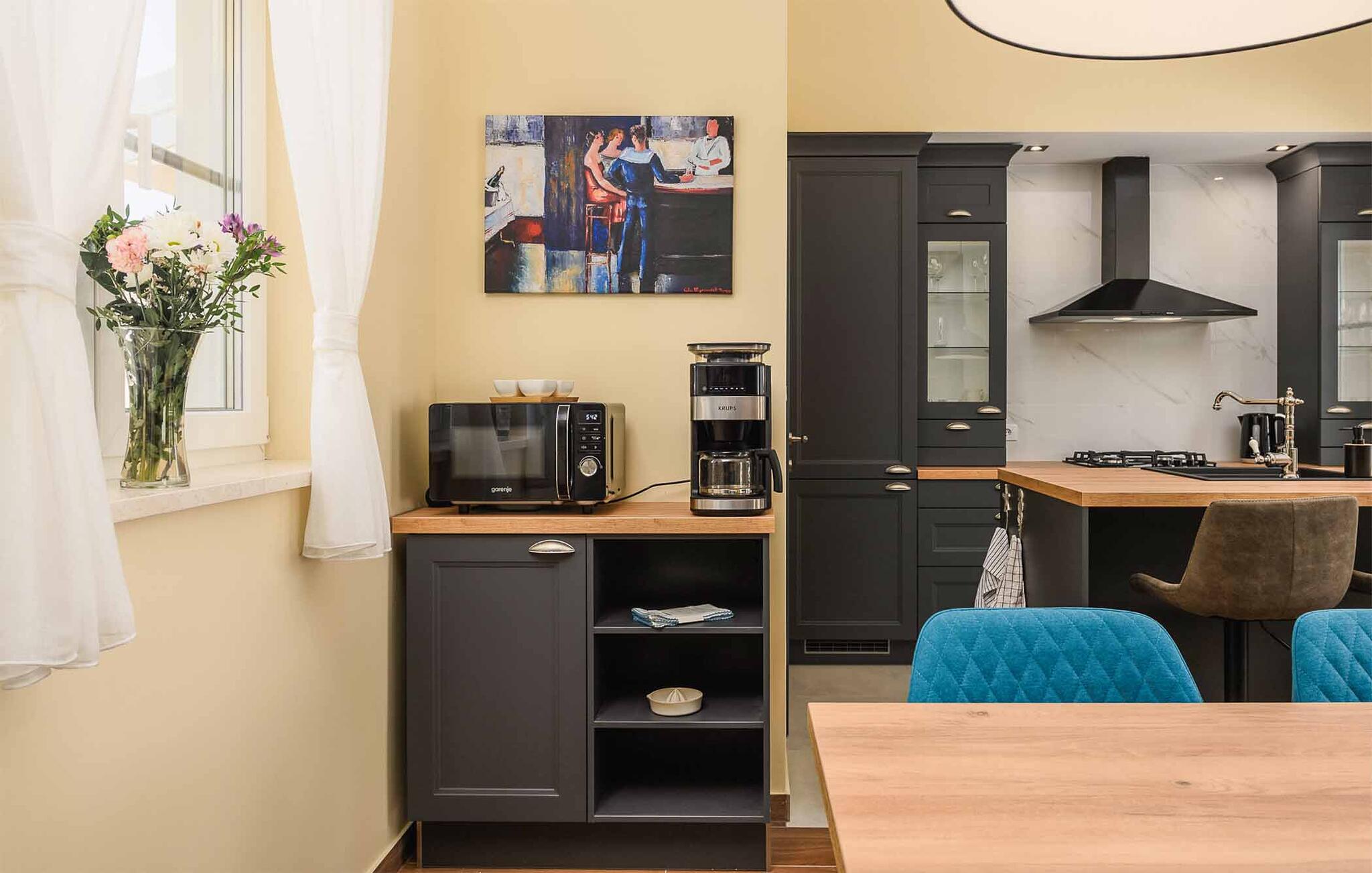 Velkommen til denne skønne feriebolig, der ligger i rolige, naturskønne omgivelser og danner rammen om et allelunde vidunderligt ophold med familien. Indvendigt emmer det af kvalitet, mørke farveskalaer og moderne faciliteter, så I kan lade skuldrene falde og bare slappe af. Indretningen prydes af et åbent design med et soveværelse på første sal uden dør, der giver det indre et særligt præg og en følelse af rummelighed. Køkkenet er moderne og fuldt udstyret, så tag jer blot god tid med at kræse om livretterne, inden I rykker ind i stuen med snacks og en god film på tv'et til langt ud på aftenen.
