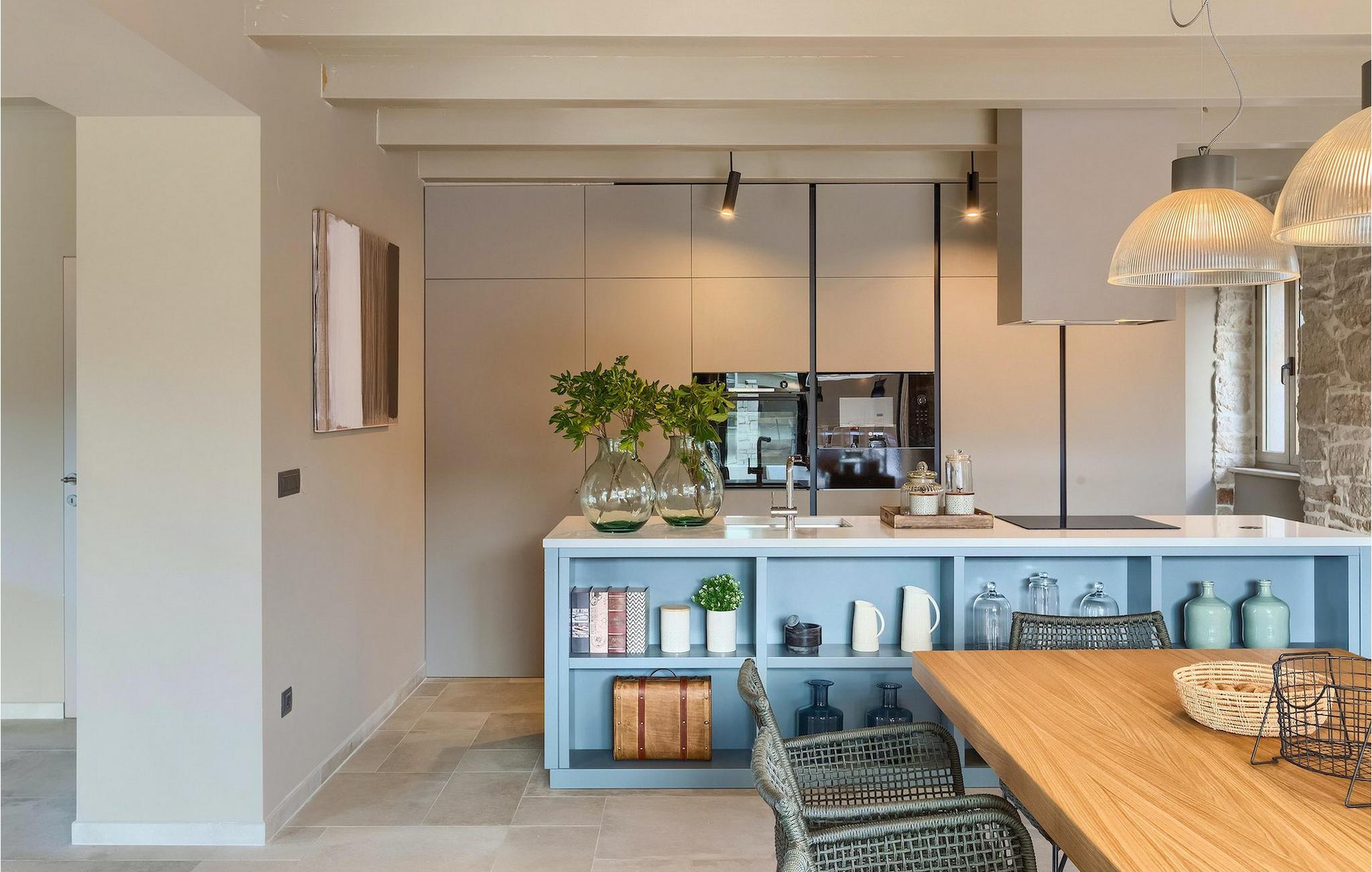 Stueetagen er åben, lys og rustik, indbydende til familiesammenkomster. Et fuldt udstyret køkken og spisestue udgør den perfekte symbiose for dine kulinariske udflugter, som suppleres af en stue med pejs i midten: et absolut must-have til romantiske aftener og tidsrejser til fortiden eller fremtiden.