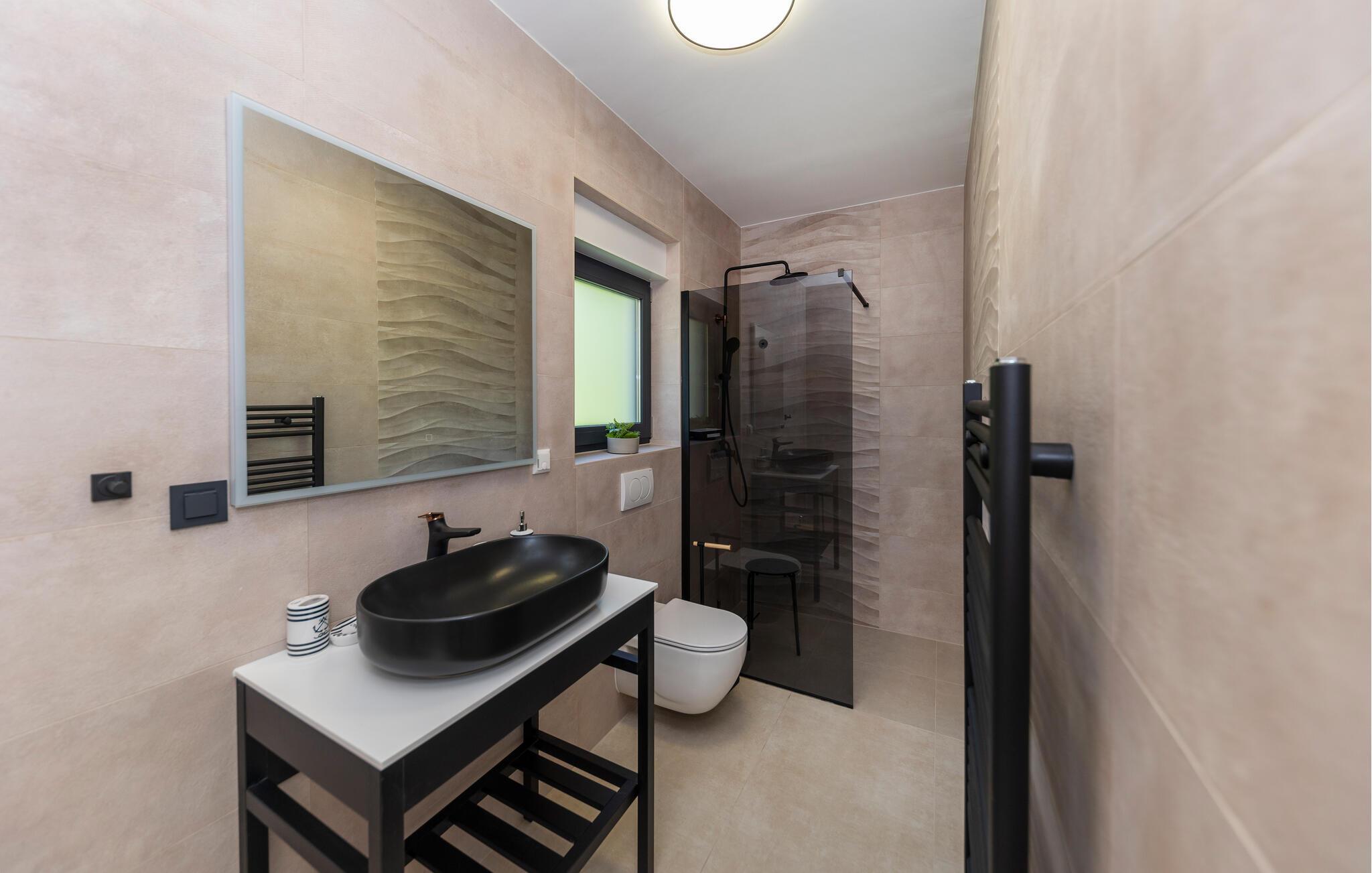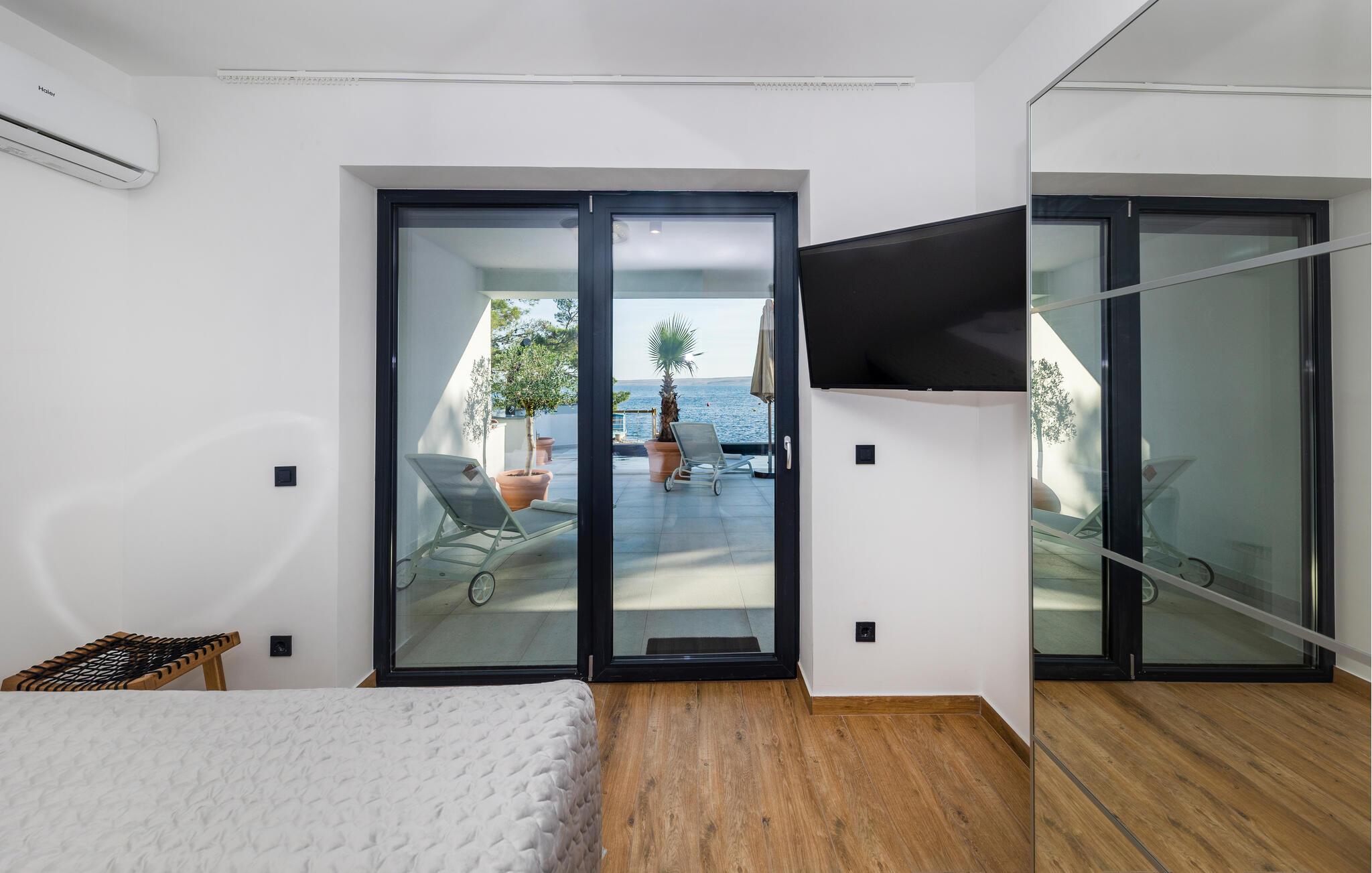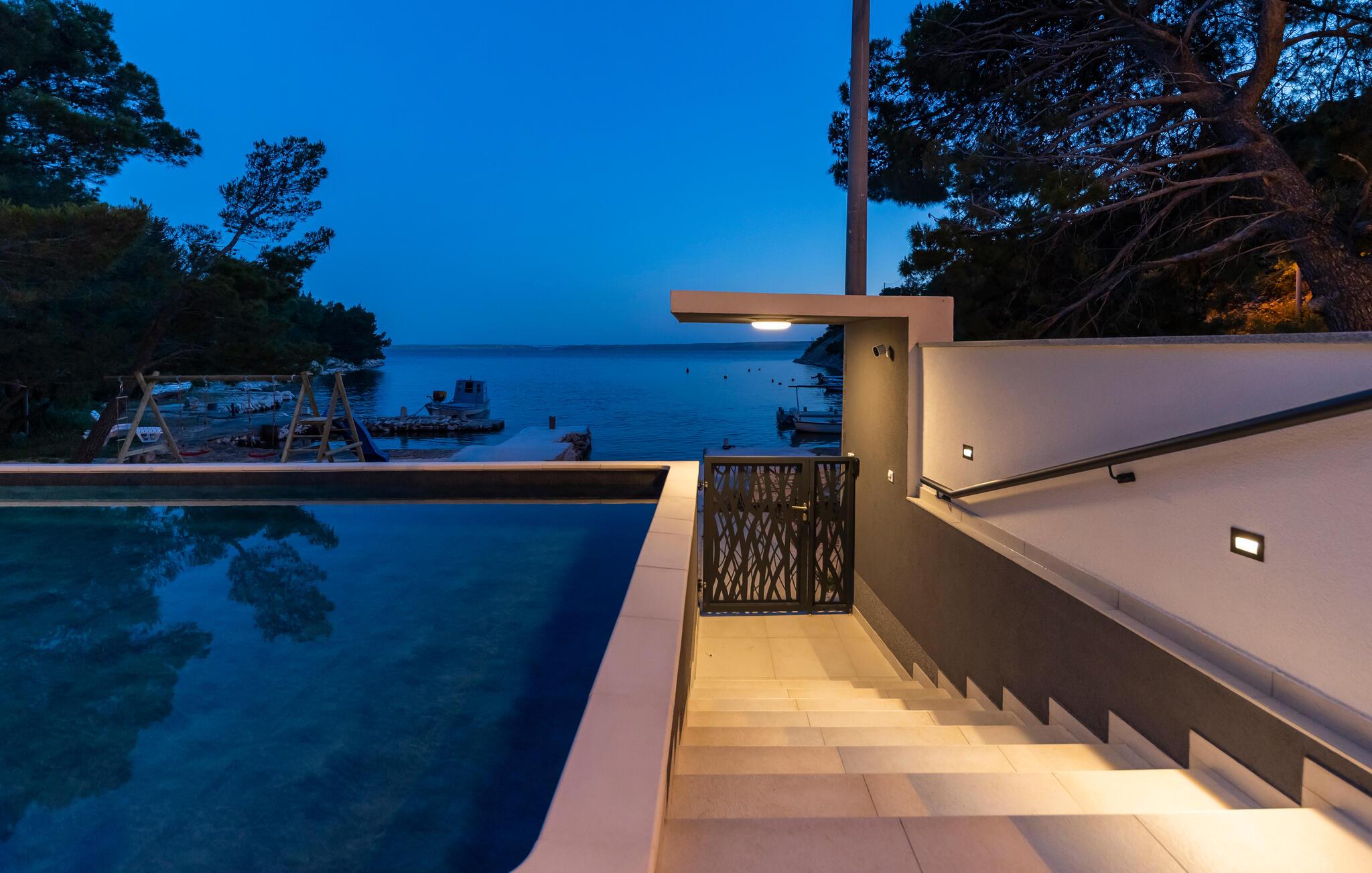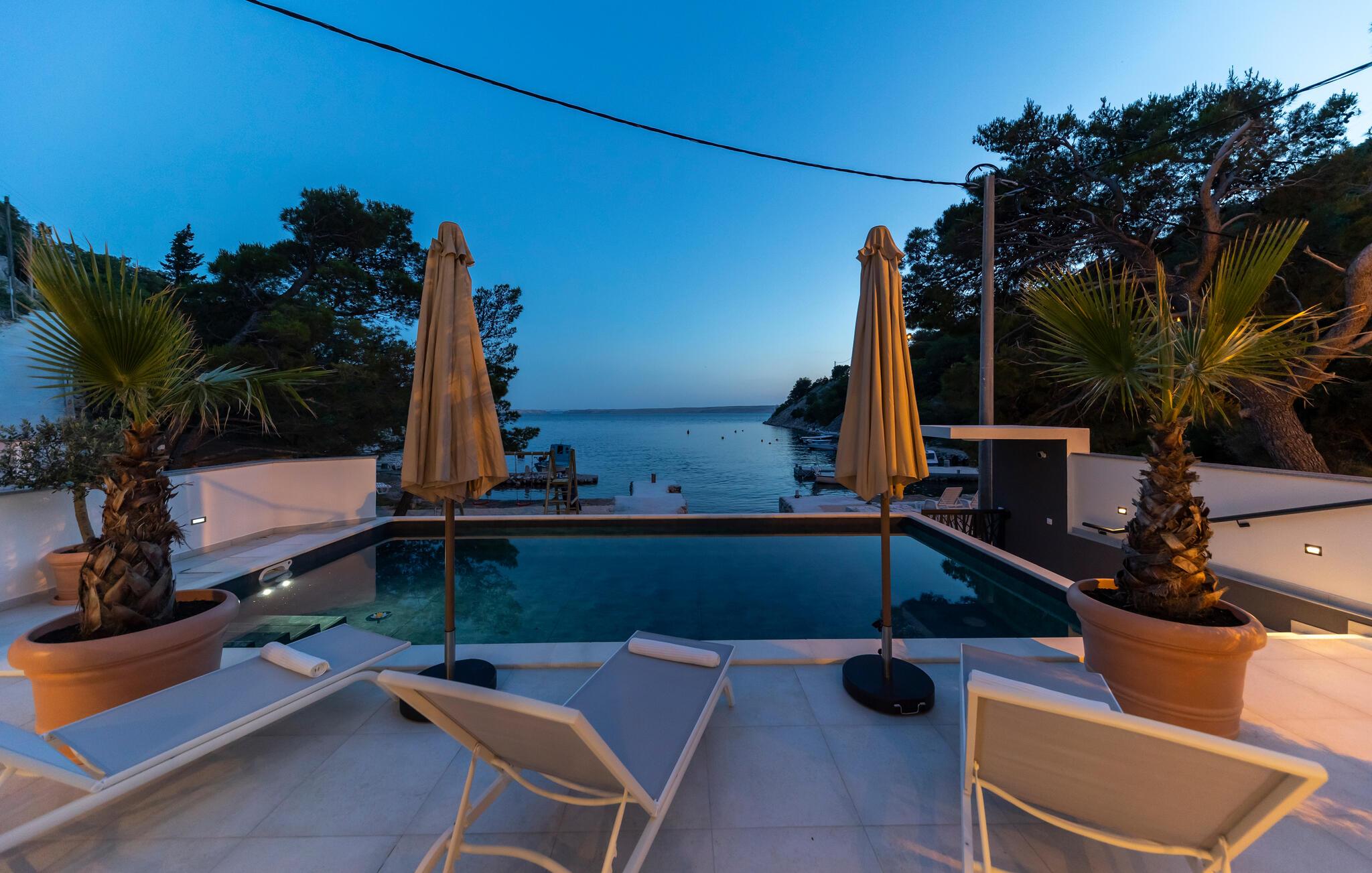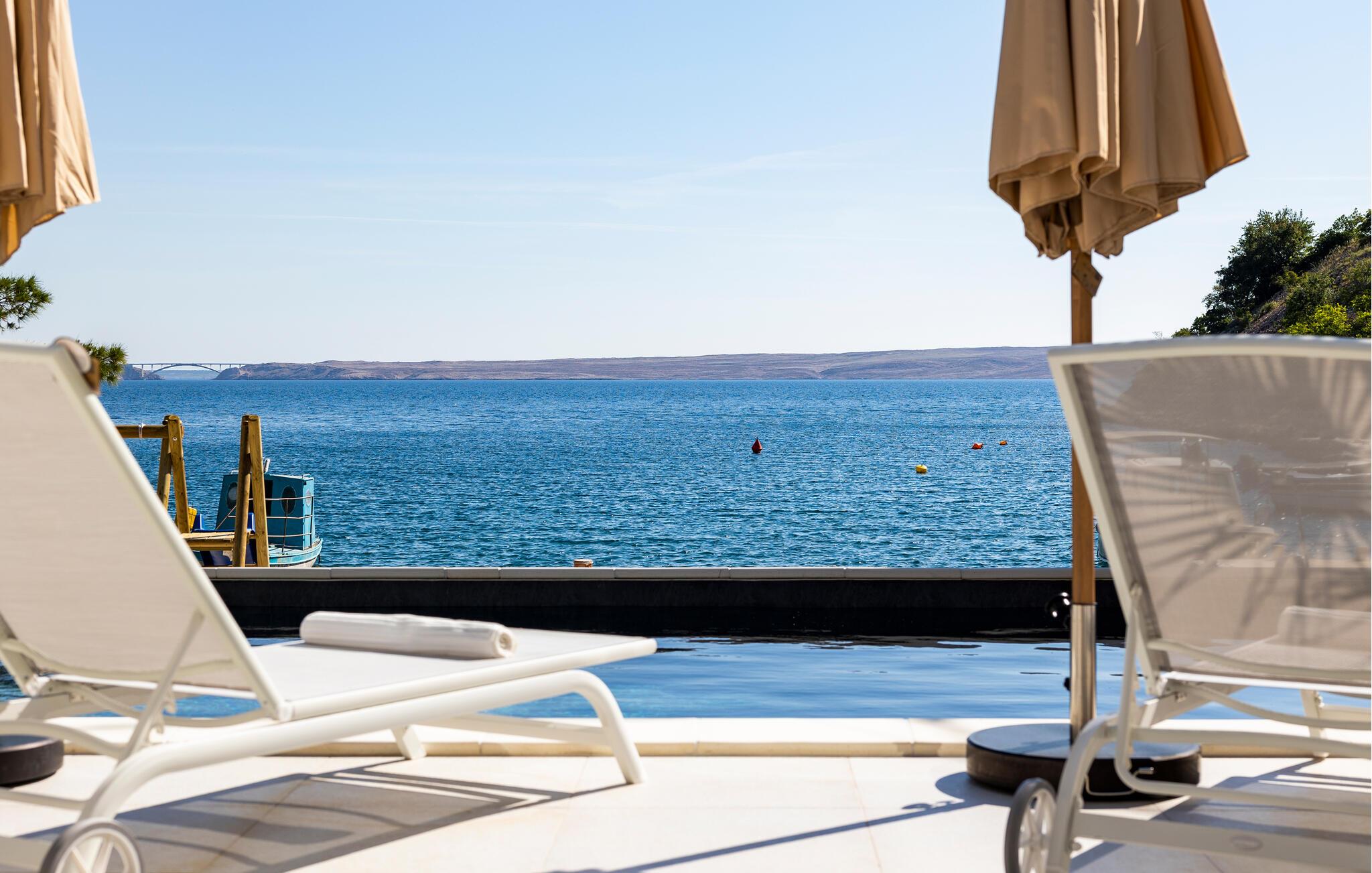 Udenfor inviterer terrasserne til at nyde solen uforstyrret. Slap af på en loungestol og nyd friske dukkerter i poolen eller sæt jer til rette i spabadet med havudsigt.