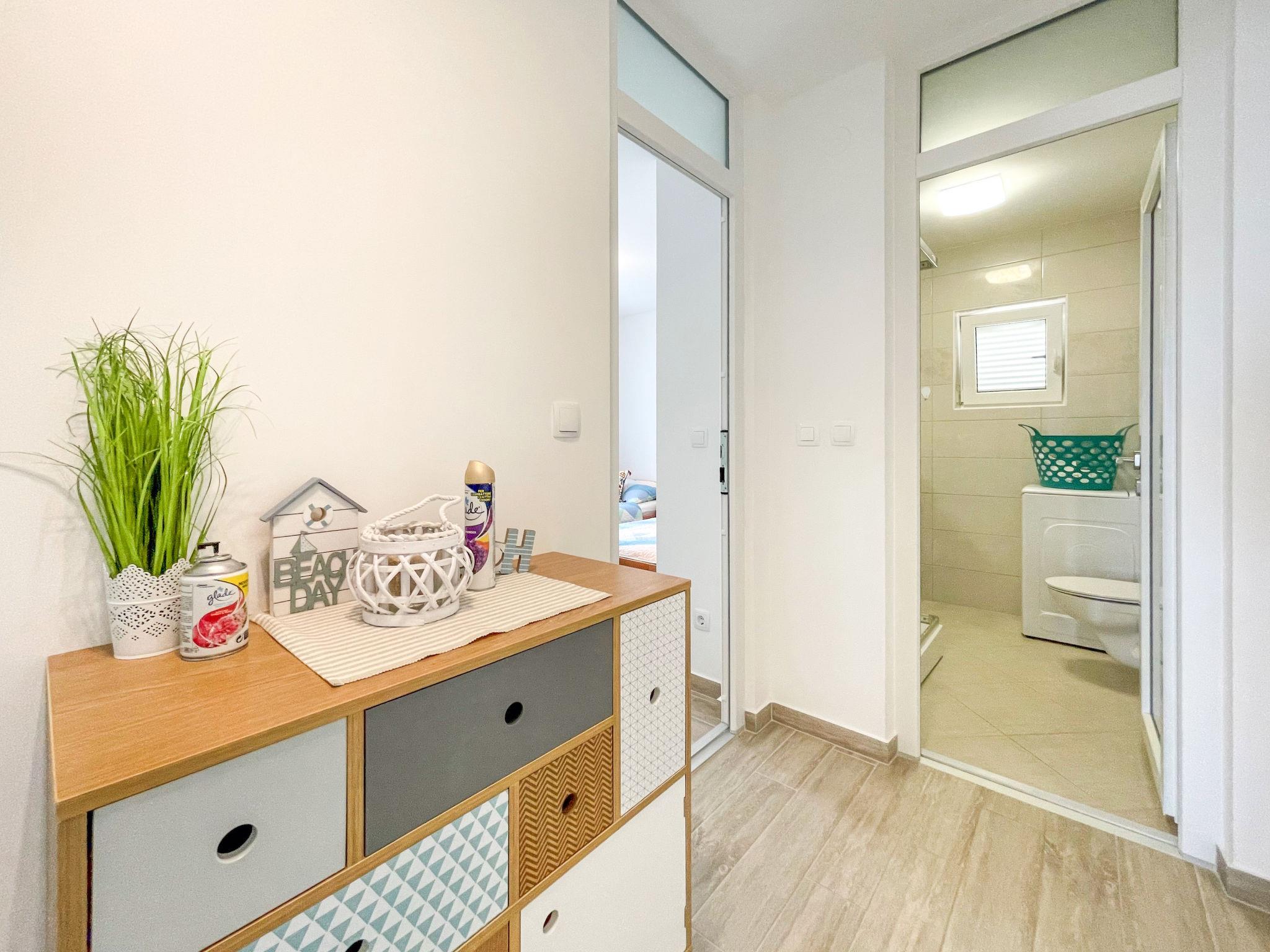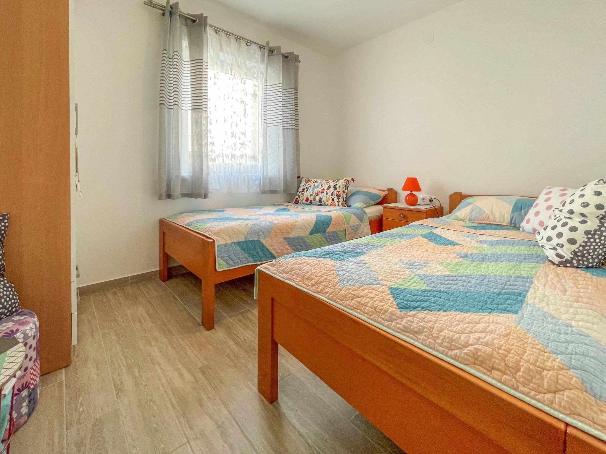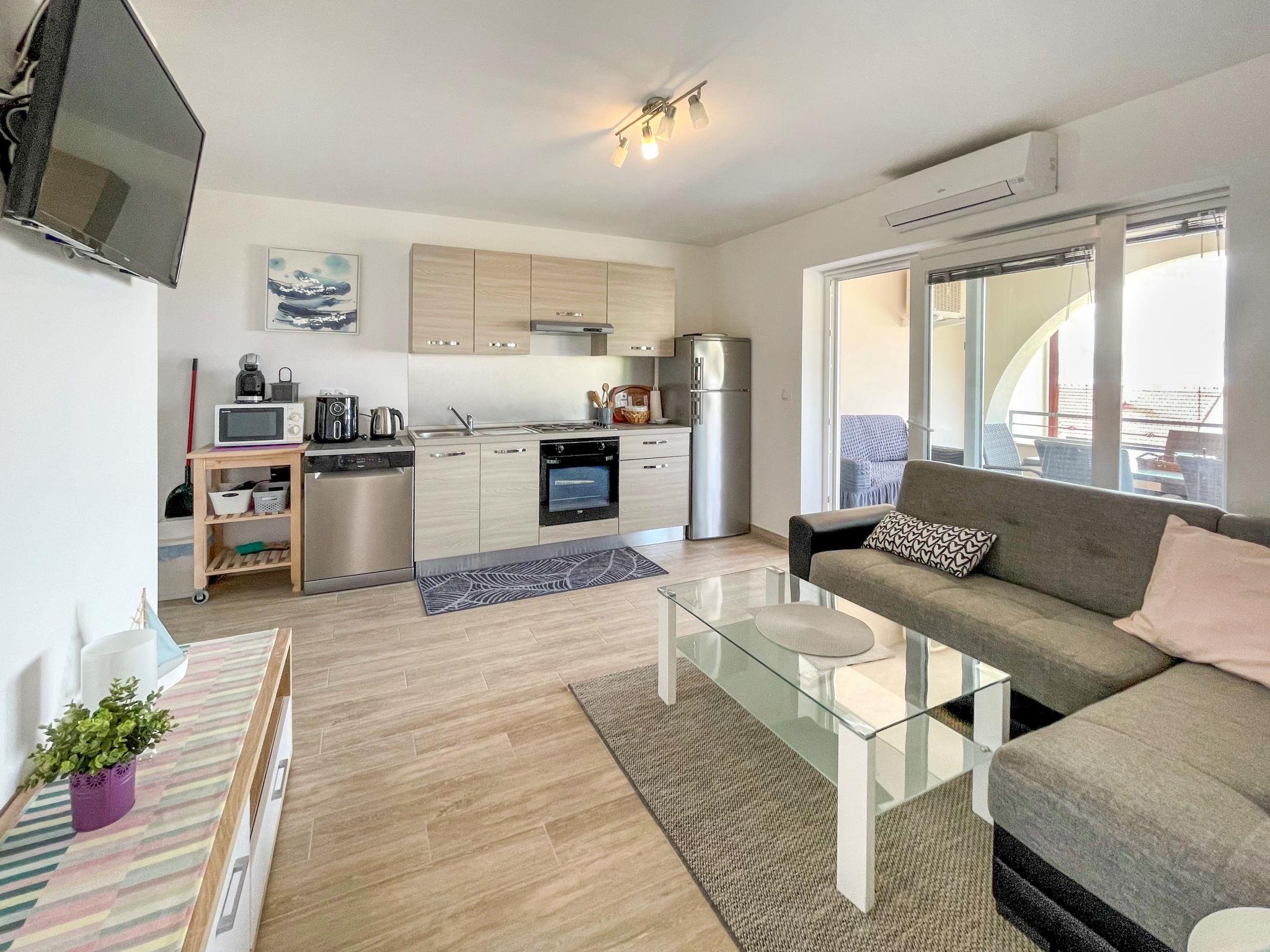 3-room apartment 60 m2 on 1st floor, south facing position. Object suitable for 2 adults + 2 children. Comfortable furnishings: living/dining room with satellite TV and air conditioning. Exit to the terrace. 1 room with 1 french bed (160 cm, length 200 cm). 1 room with 2 beds (90 cm, length 200 cm). Open kitchen (4 hot plates, oven, dishwasher, toaster, kettle, microwave, freezer, electric coffee machine). Shower/WC. No heating option. Terrace 16 m2, roofed. Terrace furniture. Beautiful view of the sea. Facilities: washing machine. Internet (WiFi, free). Parking (1 car). Suitable for families. Max. occupancy: 2 adults and 2 children up to 12 years old.