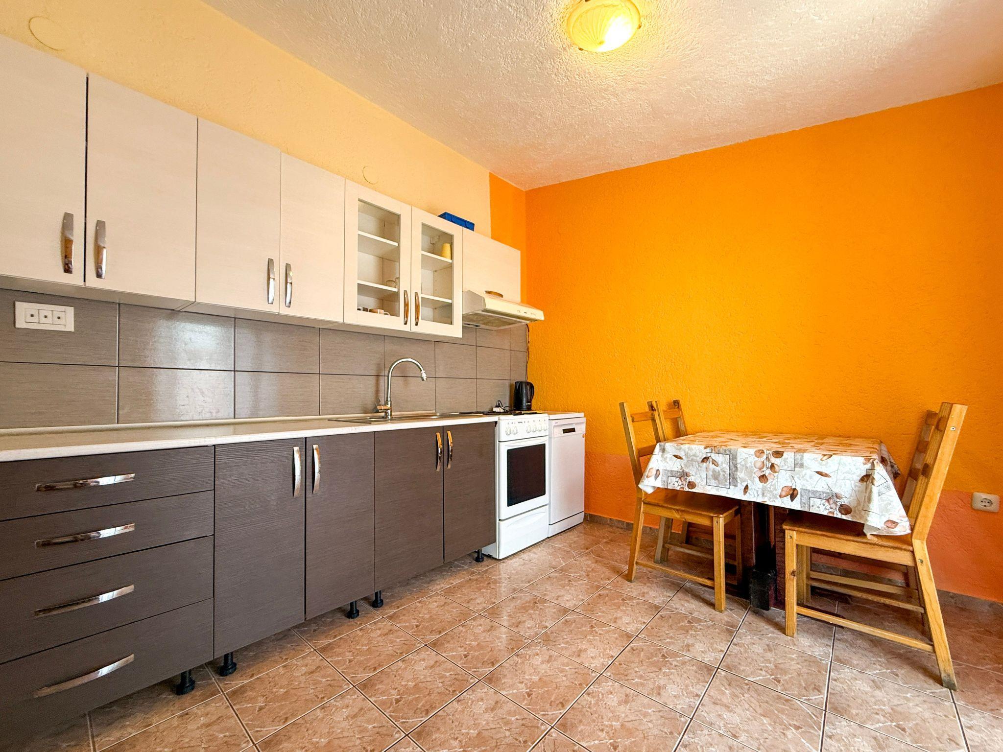 This 51m² flat consists of a large living room with kitchenette equipped with basic cooking utensils (crockery, fridge with freezer, cooker and basic cooking spices). The living room welcomes you with an antique wardrobe with its "history" and a few tiny pieces of antiquity "that means life". In the living area you will also find two sofa beds (each about 145 cm x 195 cm) for one person each. The separate bedroom is furnished with an oak double bed from the time of the monarchy (160 cm x 200 cm, with 2 anatomic mattresses, bedding). The small bathroom is equipped with shower, WC and towels. Air conditioning, Internet Wi-Fi and satellite TV are also available.