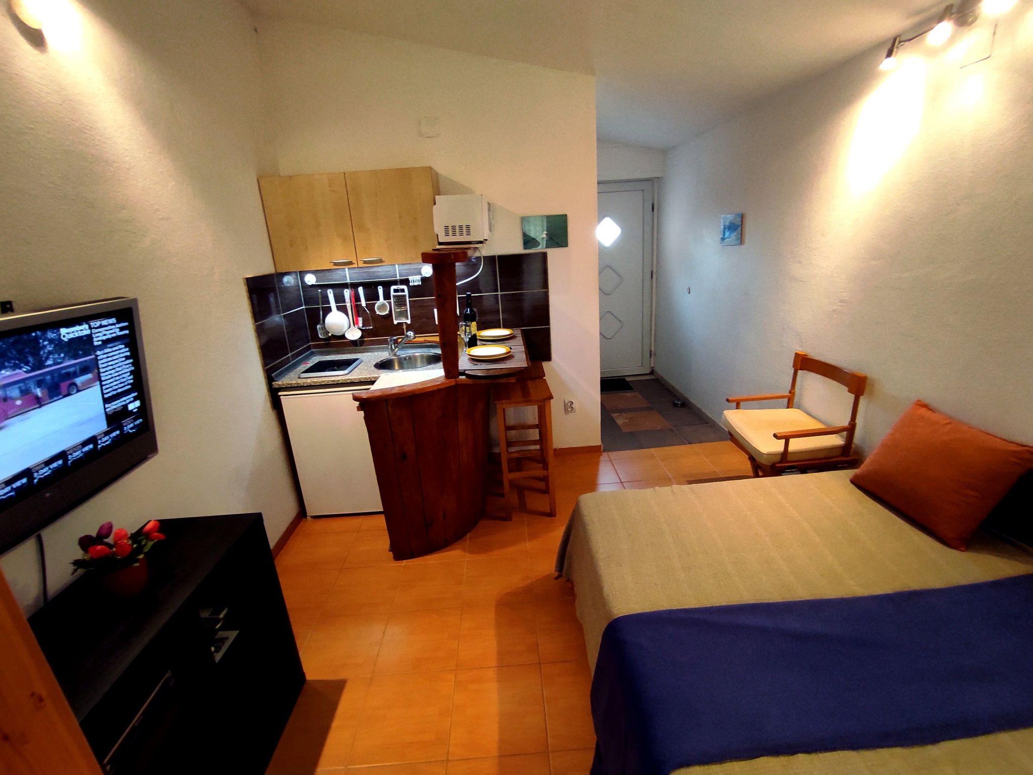 Inside, the studio is efficiently laid out to maximize comfort and convenience. The living area doubles as a bedroom, featuring a comfortable sofa bed that easily transforms into a spacious sleeping area for two. The well-appointed cooking space includes an induction hob, fridge, microwave, and essential appliances such as a filter coffee machine and electric kettle, making meal preparation a breeze. A dedicated fan ensures your environment remains cool, creating an inviting sanctuary to return to after a day under the sun.