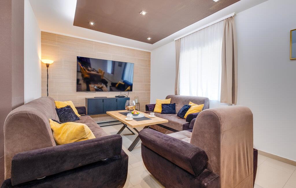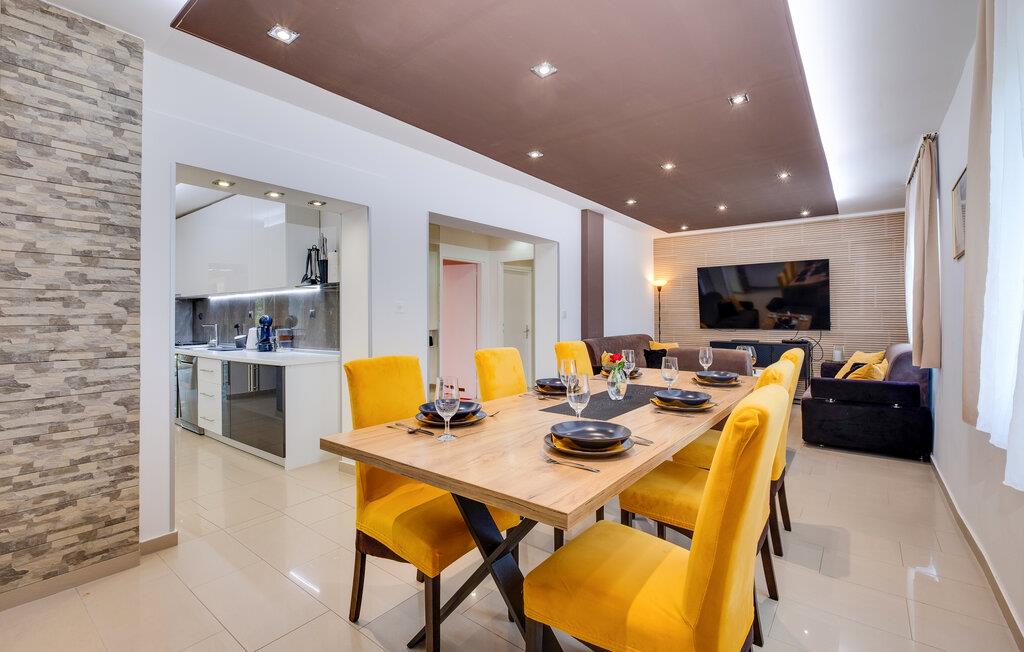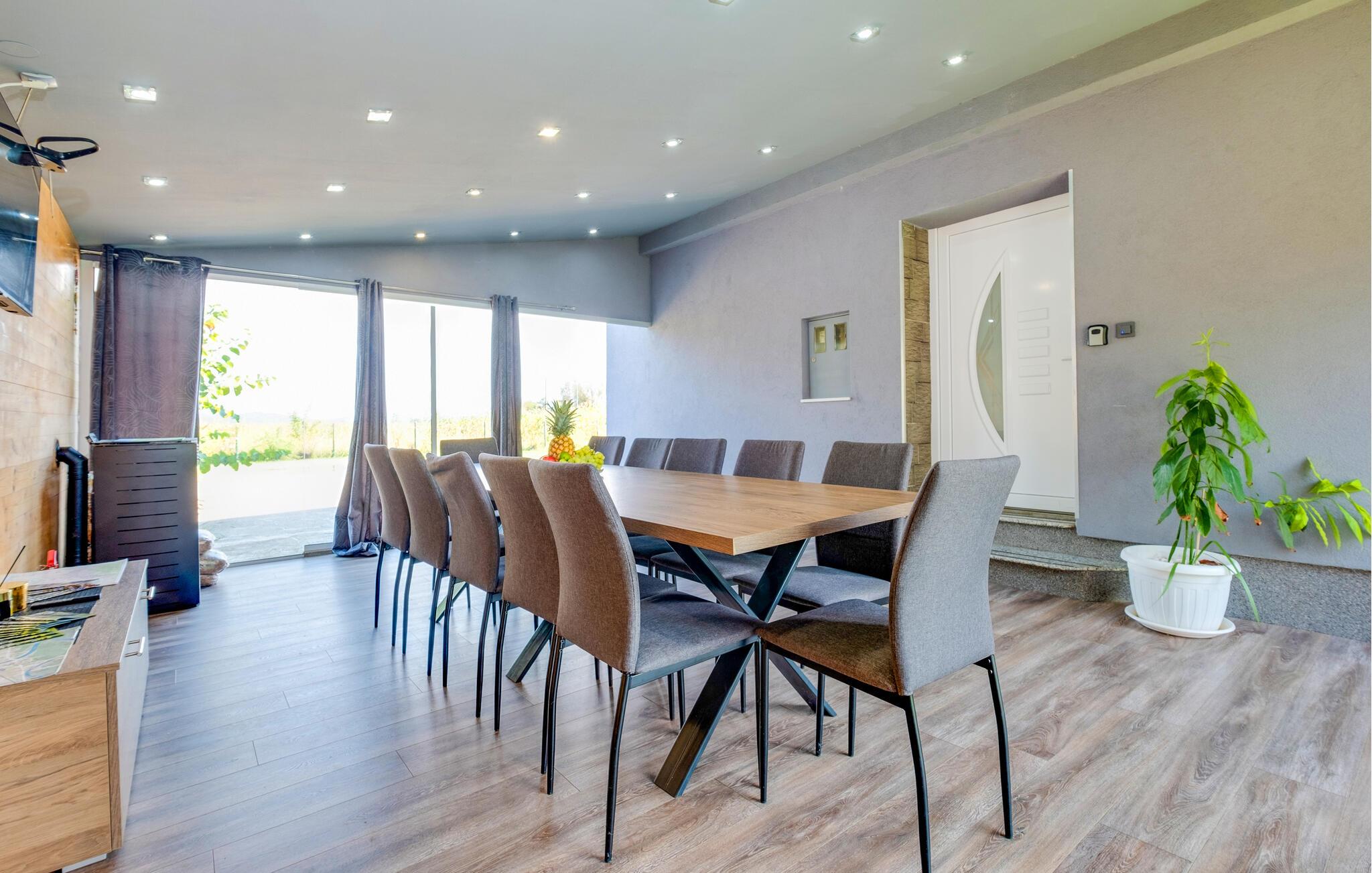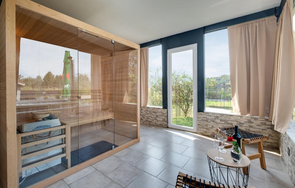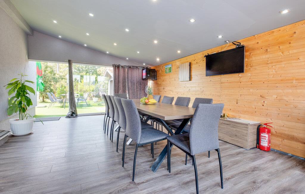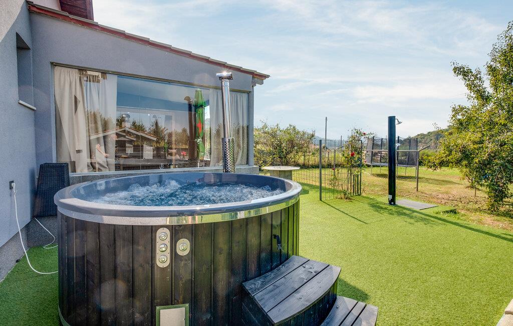 I dette rummelige og vennefamilielige feriehus i Ladvenjak kan I nyde ren luksus og afslapning. Møbleringen af ??høj kvalitet, præget af stilrent design og gennemtænkte detaljer, skaber en varm og indbydende atmosfære. Slap af i hotellets sauna eller i spabadet i haven, mens børnene render rundt på legeredskaberne. Terrassen med en muret grill og stor spiseplads lægger op til hyggelige aftener. kun nogle få skridt væk ligger badebroen og dykkertårnet på flodbredden - perfekt til fisketure, svømning og solbadning.