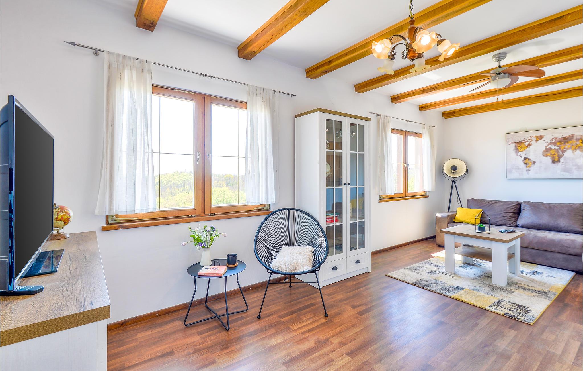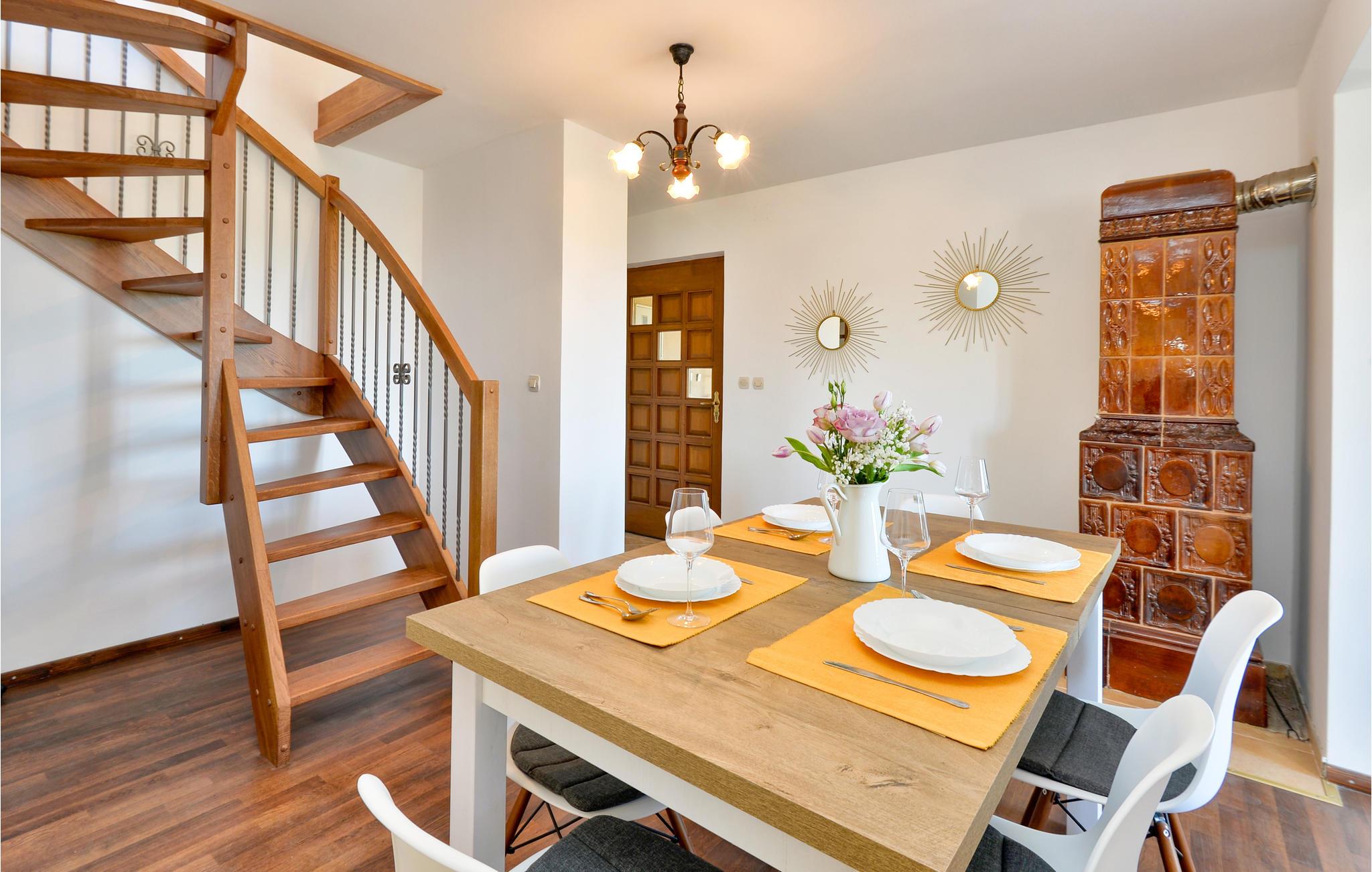 Dette feriehus har en idyllisk beliggenhed tæt på skov. Med tre soveværelser og to badeværelser har det plads til op mod otte personer, og I må også gerne tage hunden med på ferie. Det vellykkede miks af moderne møbler og synlige træbjælker bidrager til husets særlige charme.