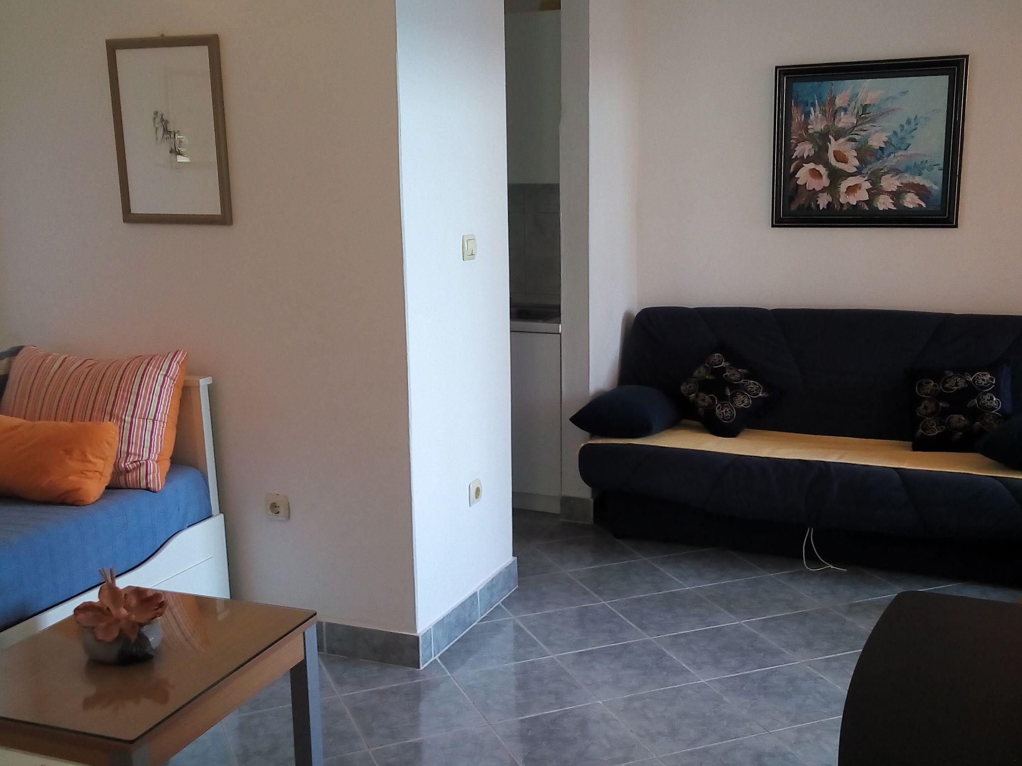 Vedran B flat is located on the second floor with a separate entrance and consists of a double bedroom without a sea view, living room with a sofa (also a bed) and another bed with 2 mattresses that can be closed during the day, fully equipped kitchen with an oven, toaster, kettle, mixer, coffee maker, American coffee machine, 10sqm covered terrace with a sea view, bathroom with shower, TV with satellite programs, DVD player, air conditioning, wireless internet.