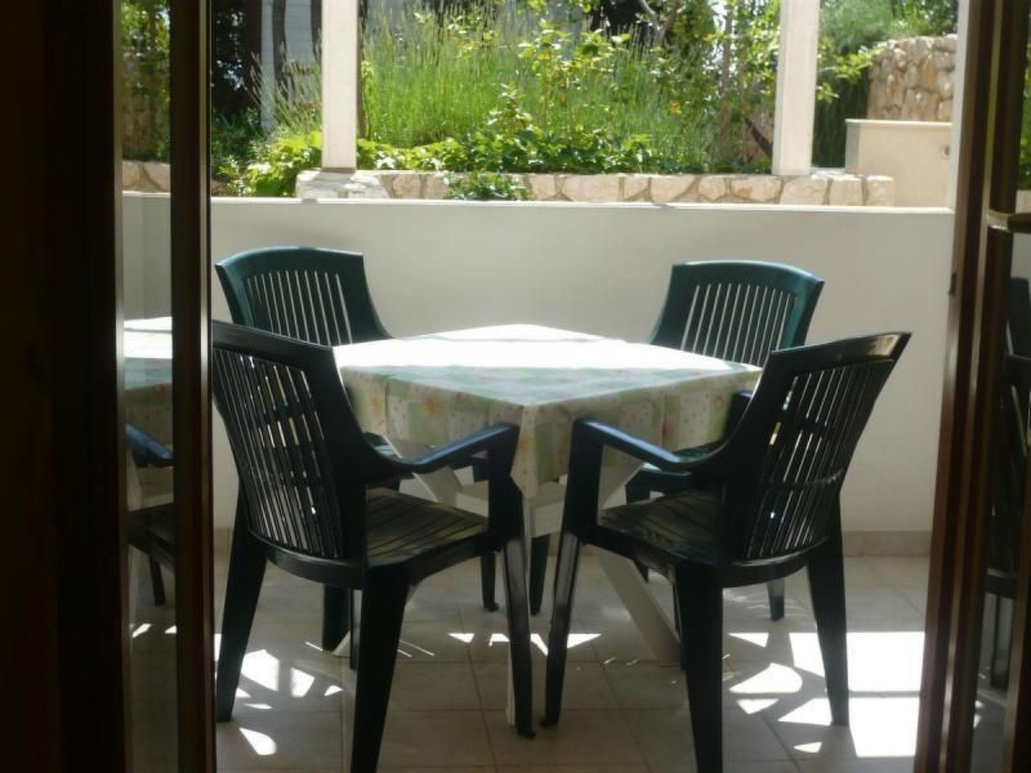 In front of the apartment there is a terrace with a table, garden chairs and an awning.