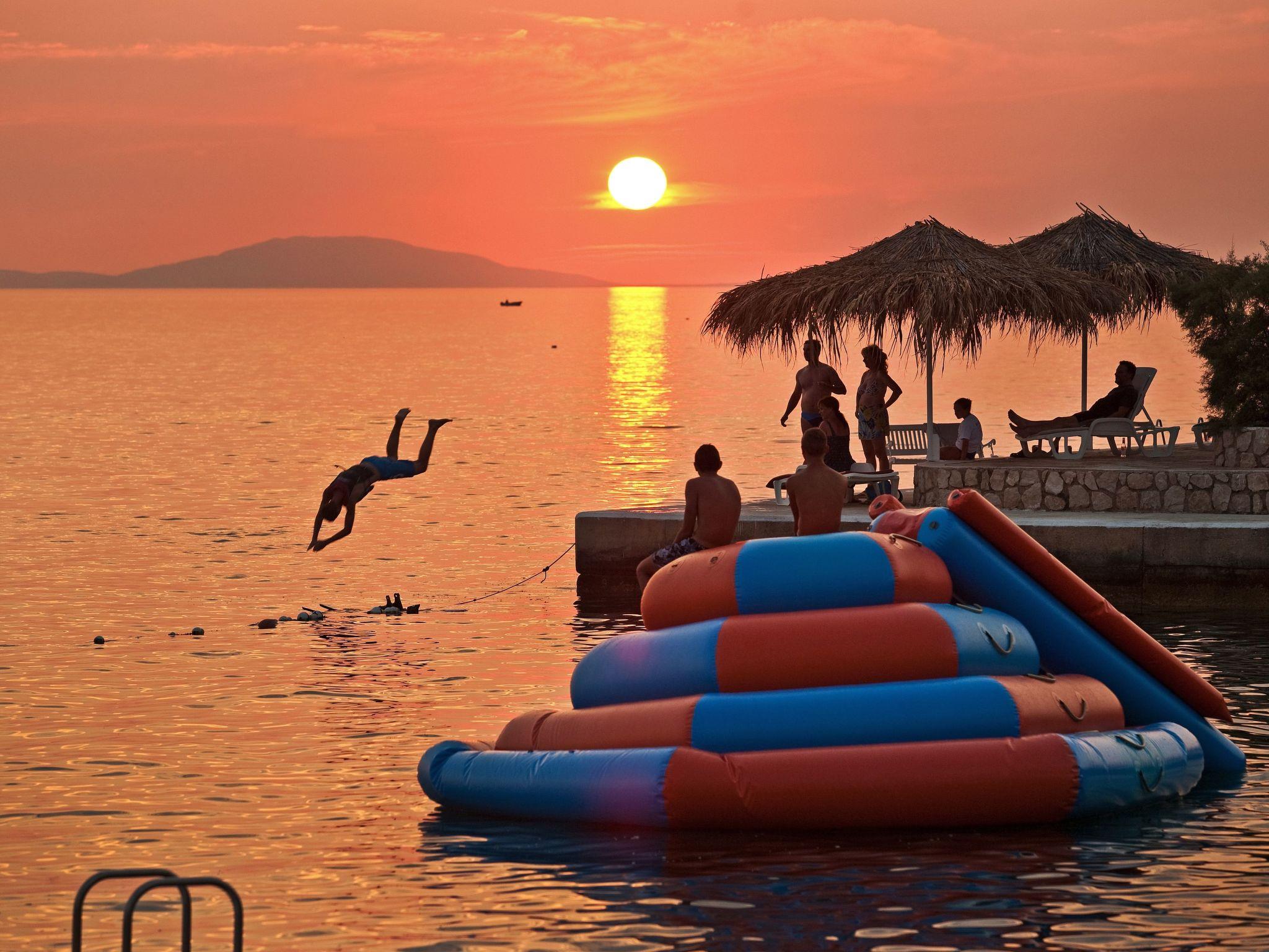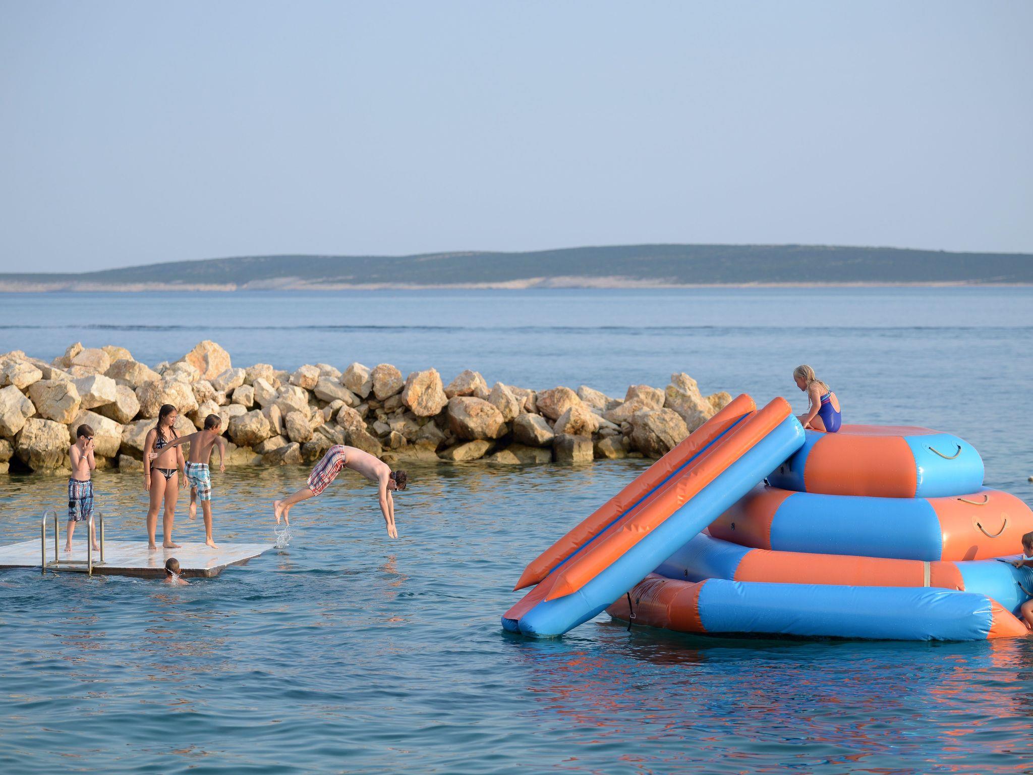 There is a beach we have a permit for in front of the complex. The beach is pebbled and partly paved. The gently shelved sea by the beach is ideal for children and you can find a changing cabin, shower, slide and water trampoline, parasols made of natural reeds, wooden tables for board games or meals, a jumping board 3 metres high. It is a perfect place for all those who would like a quiet holiday in beautiful surroundings, with little stone walls, stone oak and a clear sea.
