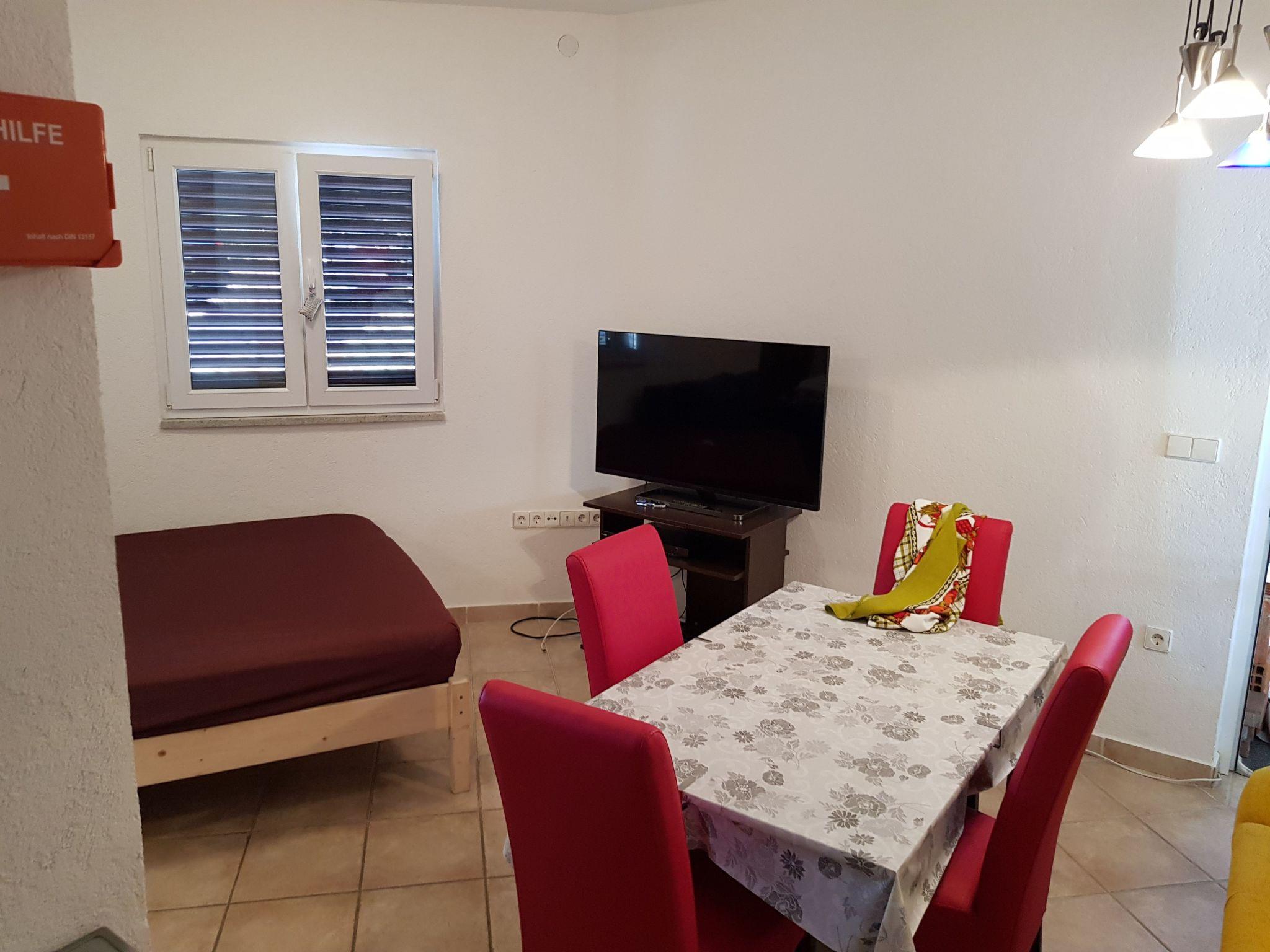 The ground-floor apartment is suitable for four people. It consists of a spacious bedroom, a newly renovated bathroom, a spacious living room with an open and fully-equipped kitchen and an inviting terrace. The living room has two sofa beds each for one person.