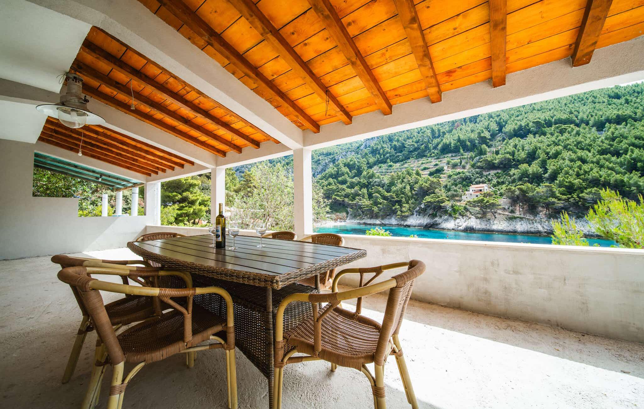 Dette stilfulde feriehus på øen Korcula er noget særligt med en spektakulær beliggenhed, der giver jer en vid panoramaudsigt over det glitrende hav. Slap af på jeres overdækkede altan eller terrasse og lad hverdagens bekymringer bag jer. Det lyse interiør er åbent. Tilbered lækre måltider i det praktiske køkken og Begynd dagene med morgenmad sammen ved det smukke spisebord.