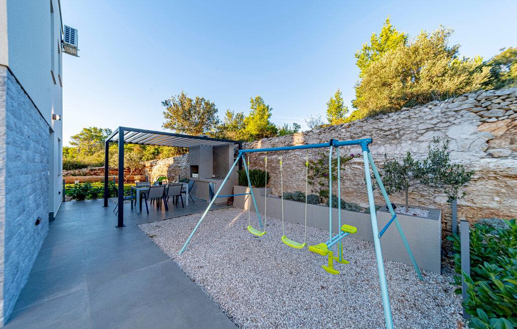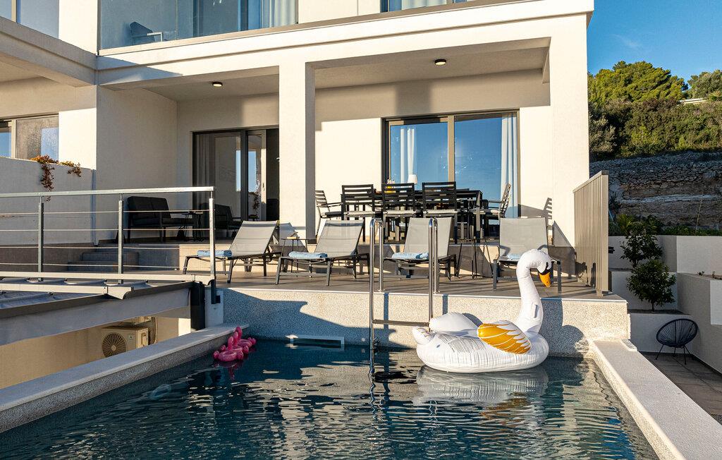 Oplad jeres batterier i infinity-poolen og lad jeres blik vandre over havet. Slap af på liggestolene, mens børnene leger i haven, eller nyd frisk fisk fra grillen under pergolaen, mens de smukke solnedgange bader terrassen i et varmt lys.