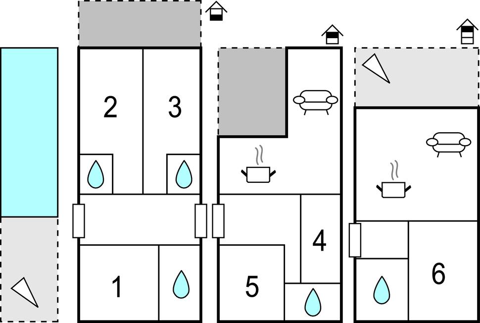 Huset fordeler sig over tre etager, som er forbundet af trapper indendøre. Huset egner sig især godt til flere familier eller en vennekreds. I stueetagen er der tre soveværelser med hver et lille tekøkken og eget bad. På førstesalen er der et stort køkkenalrum, en skøn overdækket terrasse med grill til fællesspisning og yderligere to soveværelser samt et badeværelse.