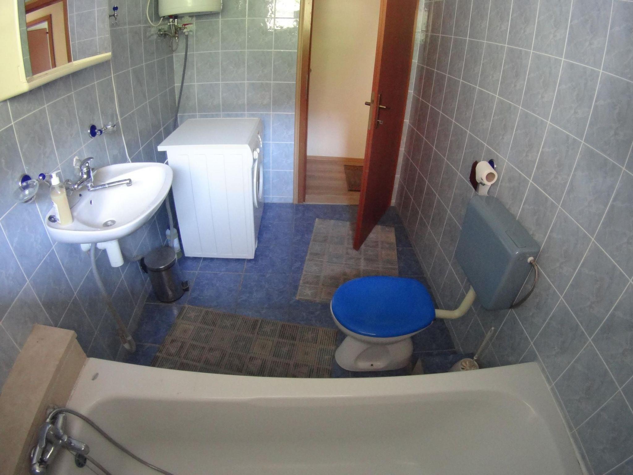 This apartment is located on the second floor and can accommodate up to five people. It has two bedrooms, each with a double bed and an extra bed. The air-conditioned living and dining area with an open kitchen offers a TV and a dining table with chairs. The kitchenette is fully equipped with all necessary kitchen appliances. The bathroom consists of a bathtub, sink, toilet and washing machine.