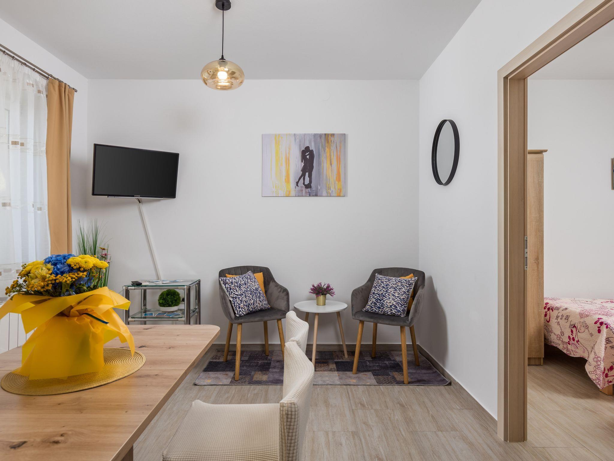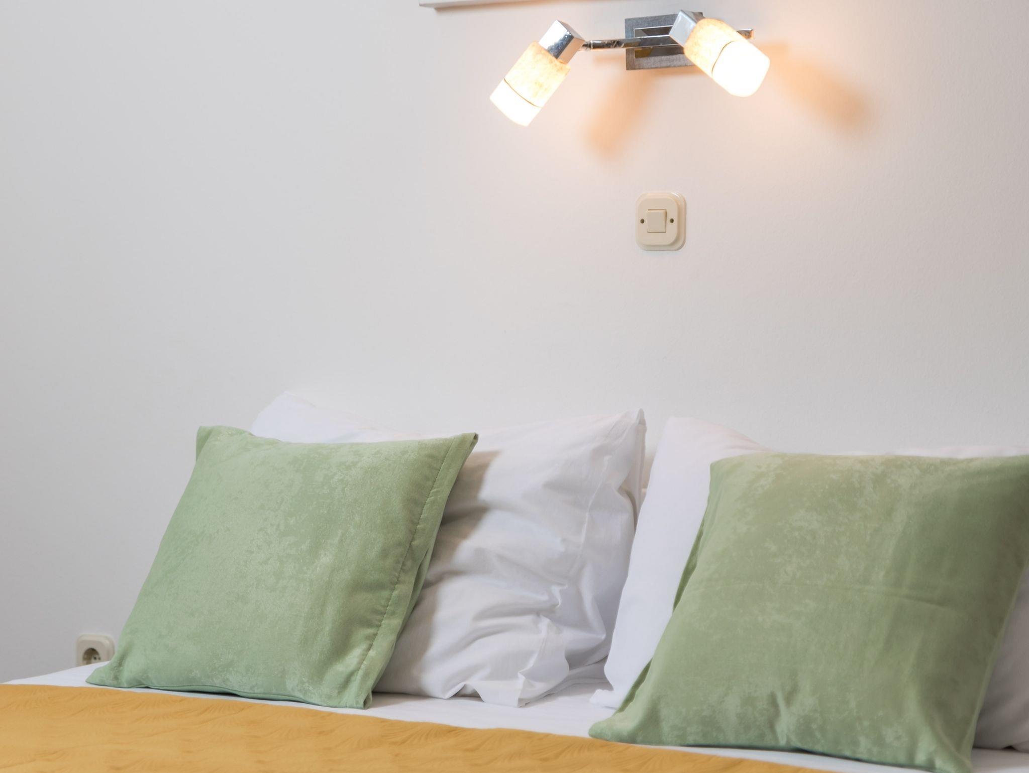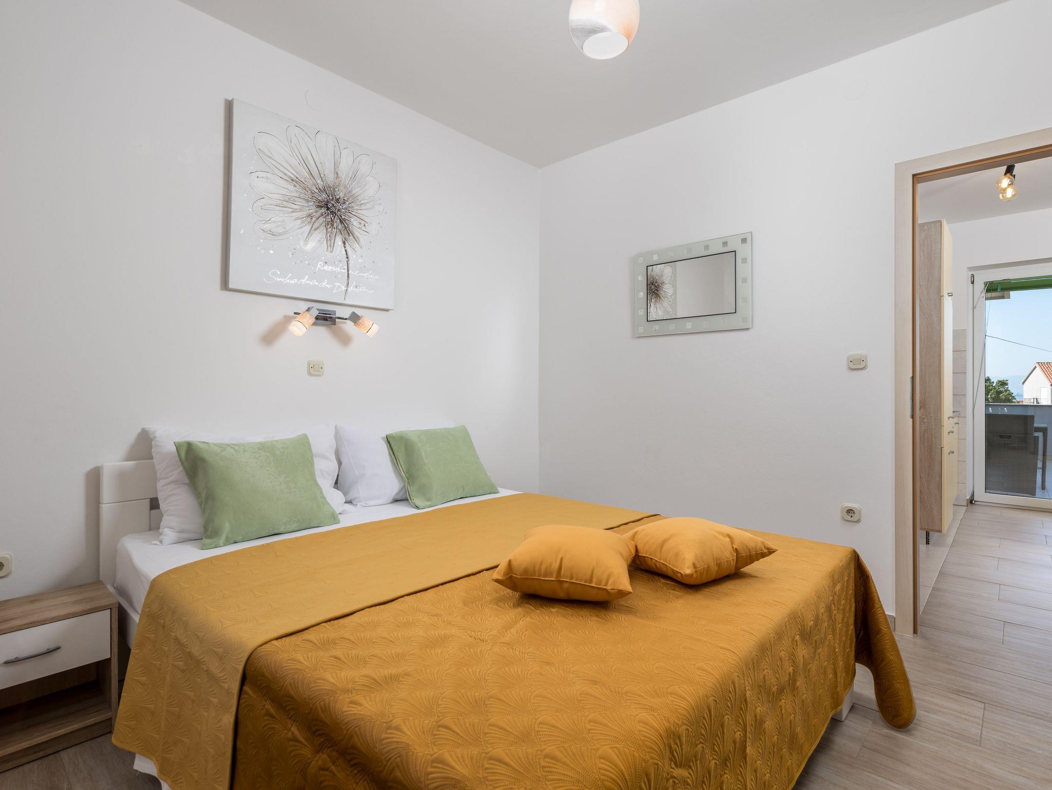Ferienwohnung bietet Platz für 4 Gäste. Die Betten sind in Schlafzimmern, die es 2 gibt, innerhalb einer Gesamtfläche von 38m2, angeordnet. Die Gäste haben eine eigene Terrasse zur Verfügung, auf der sie in warmen Sommernächten genießen können. Das Apartment bietet Meerblick. Es ist erlaubt, Speisen auf dem Gemeinschafts-Grill vorzubereiten. IM PREIS INBEGRIFFEN: Kurtaxe, Endreinigung, Klimatisierung, Zentralheizung, Parkplatz, Internet, Wäschewaschen, Bügeleisen. VERBINDLICHE ZUSÄTZLICHE KOSTEN: Aufzahlung für Kurzaufenthalte (prozentualer Zuschlag pro Nächtigungsanzahl: 30% - 1, 20% - 2, 10% - 3). Die Verfügbarkeit zusätzlicher Dienstleistungen in Ihrem reservierten Termin und die Preise derselben (falls nicht aufgeführt) müssen im Voraus überprüft werden. Zusätzliche Dienstleistungen die in der Zahlungsaufforderung nicht aufgeführt sind werden direkt beim Vermieter bezahlt, angenommen der Gast nutzt auch diese.