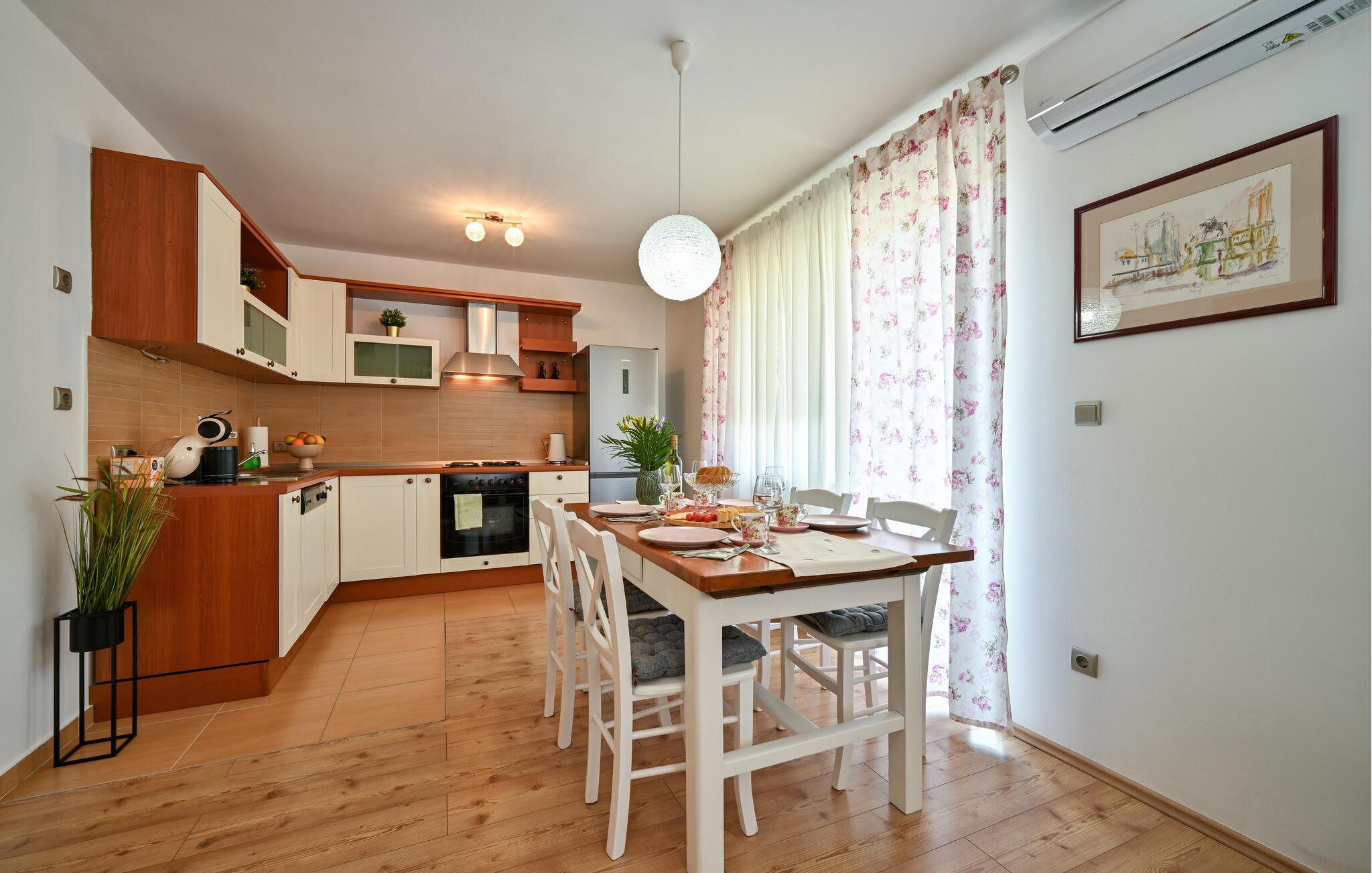 Velkommen til dette feriehus, udstyret med mange ekstraudstyr, hvor I finder en vellykket blanding af rustik charme og moderne komfort. Glæd jer til at lave mad i det åbne køkken og slappe af i den komfortable sofa. Brug det store udvalg af streamingmuligheder til at afslutte dagen med en spændende film, eller dediker jer selv til en selskabelig spilleaften.
