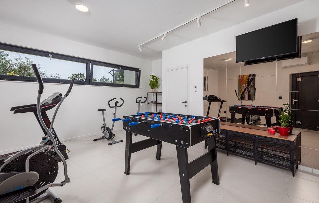 Villa Ante byder dig velkommen med en stor have, hvor du vil finde den forfriskende pool og 6 liggestole ved siden af. Uden for indhegningen er der en smuk privat spiseplads til op til 8 personer og en grill. Når du kommer tættere på villaen, vil du se et loungeområde foran de brede glasdøre. Indenfor er den moderne stue med TV oplyst af naturligt lys og har udsigt over poolen og haven. Lige ved siden af er det fuldt udstyrede køkken og spiseplads til op til 8 personer. I samme rum vil dine børn blive glade for at finde en trægynge. To dobbeltværelser, hver med deres eget tv og privat badeværelse, vil tilbyde dig nætter fuld af velfortjent hvile. En etage nede kan du få en hurtig træning i det private fitnesscenter, spille et spil bordfodbold eller slappe af i saunaen. På første sal inviterer yderligere to dobbeltværelser med eget tv og et fælles badeværelse til en behagelig nats søvn. De har hver en glasdør, der fører til en af de to altaner. For en luksuriøs familieferie i en fantastisk moderne villa, behøver du ikke lede længere end Villa Ante. Villa Ante ligger på den smukke ø Krk. Der er mange fantastiske velkendte strande rundt om øens kyst, hver enkelt kun omkring 35 minutter væk. Du kan besøge Biserujka-grotten, som du kommer ind i gennem en skjult indgang i et usminket stenhus midt i et bart karstlandskab. Kun 35 minutter væk kan du tilbringe en dag i Baška, en ferieby kendt for sin gamle bydel, kirker og strande som det centrale Vela Plaža. I nærheden af Baška, St. Lucy-kirken i Jurandvor, er en romansk katolsk kirke fra år 1100, hvor du kan se to store middelalderlige kroatiske artefakter: Baška-tavlen og en skakternet mønsterudskæring på klokketårnet.
