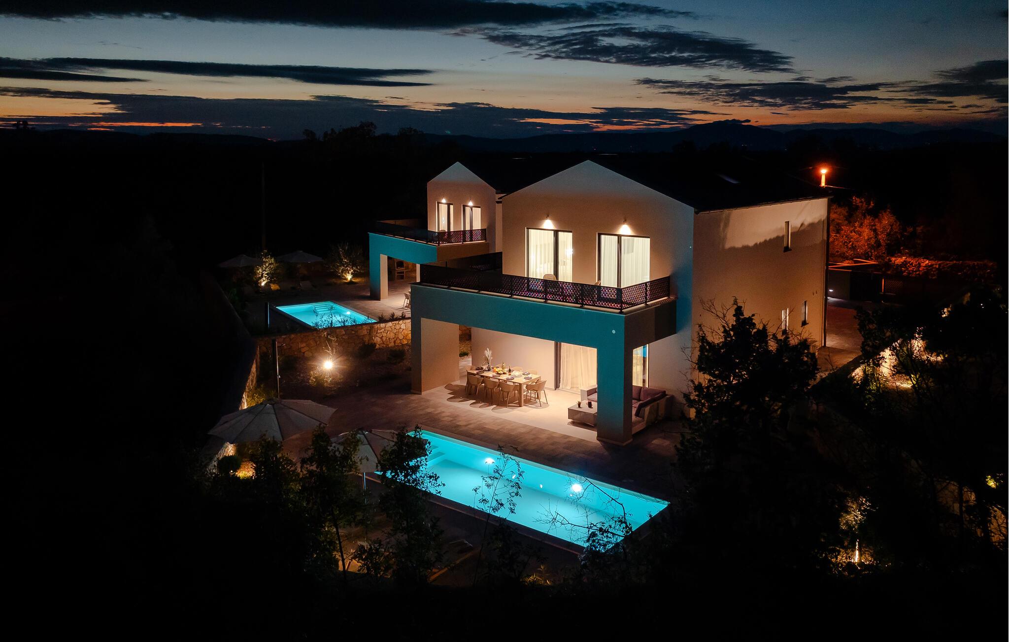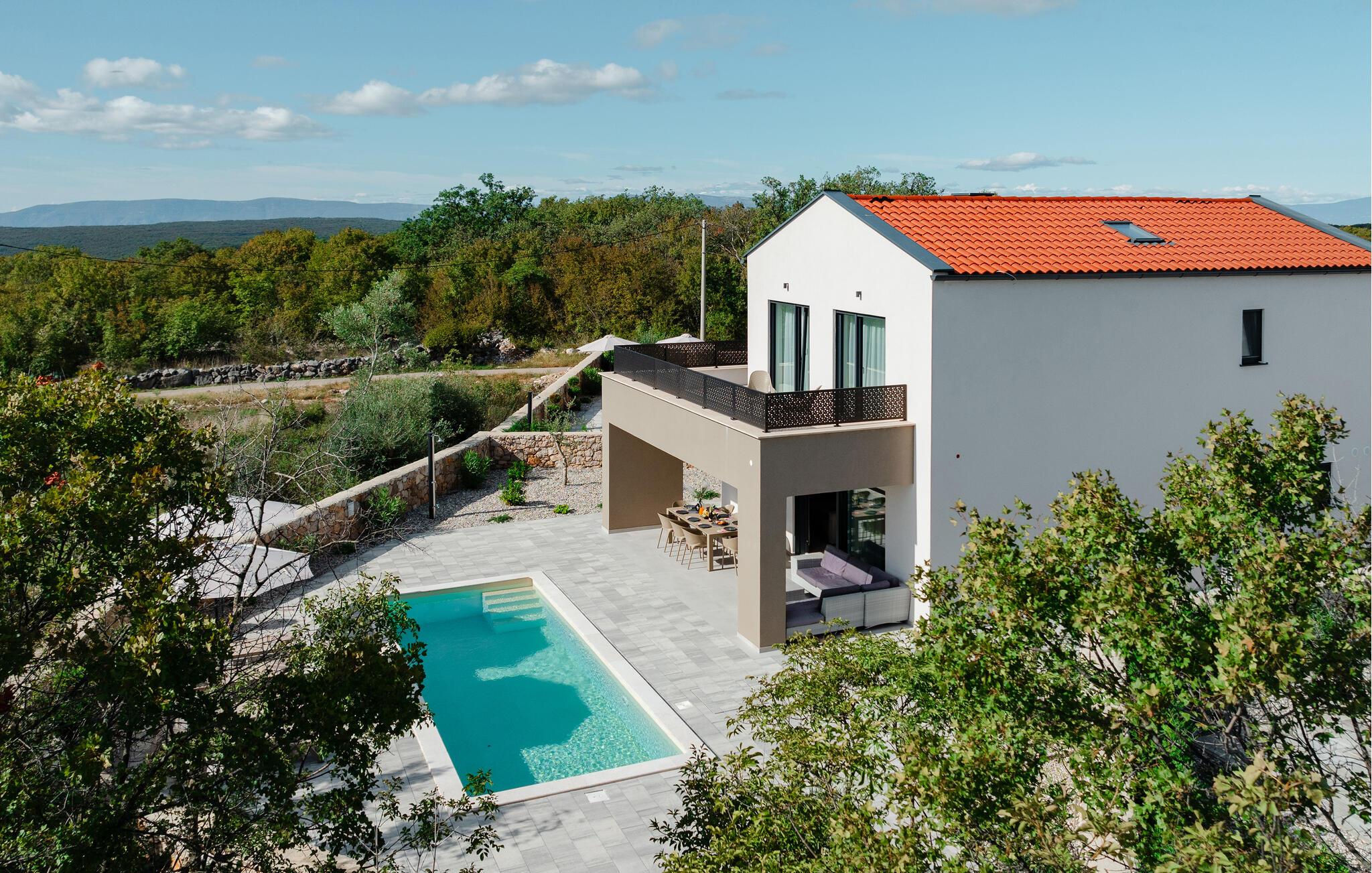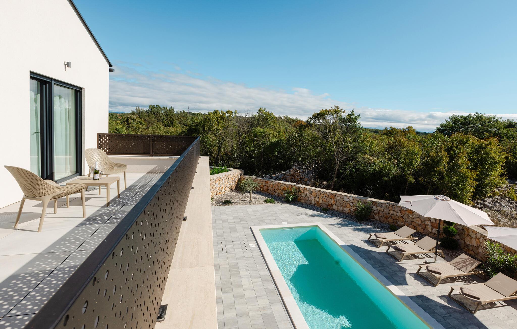 Tilbring en luksuriøs ferie i dette moderne feriehus, der ikke lader noget tilbage at ønske. jeres rummelige feriehus tilbyder jer en ideel blanding af elegance og komfort til afslappende dage under solen. Start jeres dag på den store terrasse, hvor I kan nyde morgenmaden ved det store udendørs spisebord, mens I har udsigt til den funklende pool. Slap af på liggestolene og tag en forfriskende dukkert i det krystalklare vand i den private pool. Huset er stilfuldt indrettet og har en rummelig stue med en komfortabel sofa og et moderne fladskærms-tv. Den elegante kombination af træelementer og lyse farver skaber en hyggelig, men luksuriøs atmosfære. Tilbring rolige aftener i opholdsområdet eller tilbered lækre måltider i det moderne køkken. Den tilstødende spiseplads byder på plads nok til middag sammen. Eller brug grillen og nyd jeres måltider al fresco. jeres sommerhus ligger i en rolig beliggenhed. Udforsk de omkringliggende seværdigheder, tag en bådtur langs Adriaterhavskysten eller oplev de kulinariske højdepunkter i en af de nærliggende restauranter.