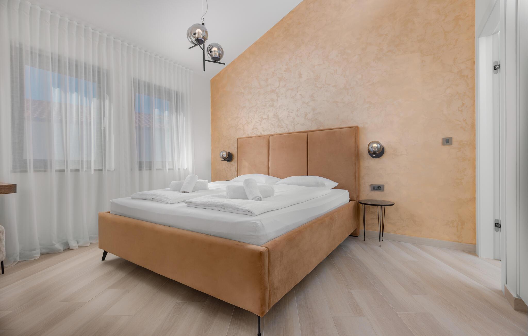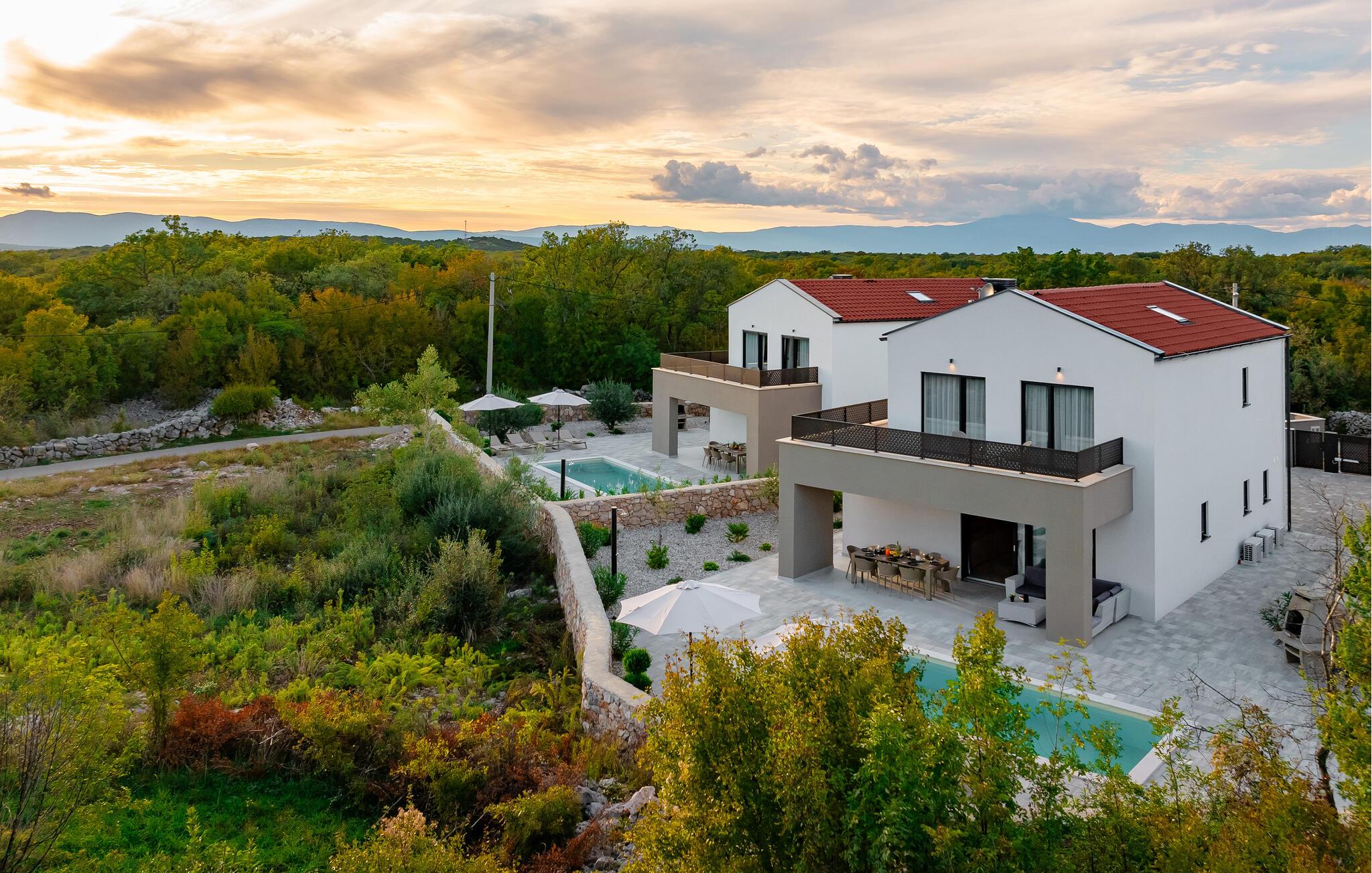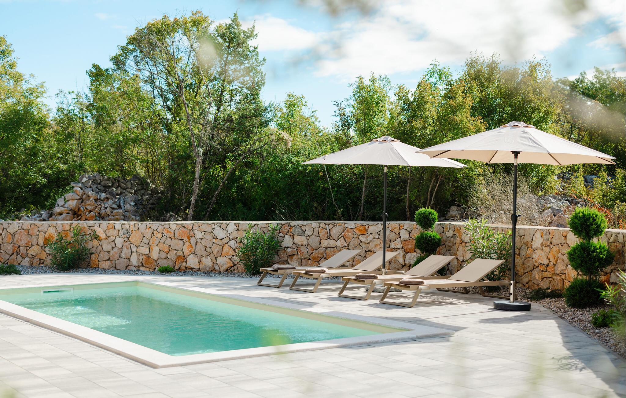 Tilbring en luksuriøs ferie i dette moderne feriehus, der ikke lader noget tilbage at ønske. jeres rummelige feriehus tilbyder jer en ideel blanding af elegance og komfort til afslappende dage under solen. Start jeres dag på den store terrasse, hvor I kan nyde morgenmaden ved det store udendørs spisebord, mens I har udsigt til den funklende pool. Slap af på liggestolene og tag en forfriskende dukkert i det krystalklare vand i den private pool. Huset er stilfuldt indrettet og har en rummelig stue med en komfortabel sofa og et moderne fladskærms-tv. Den elegante kombination af træelementer og lyse farver skaber en hyggelig, men luksuriøs atmosfære. Tilbring rolige aftener i opholdsområdet eller tilbered lækre måltider i det moderne køkken. Den tilstødende spiseplads byder på plads nok til middag sammen. Eller brug grillen og nyd jeres måltider al fresco. jeres sommerhus ligger i en rolig beliggenhed. Udforsk de omkringliggende seværdigheder, tag en bådtur langs Adriaterhavskysten eller oplev de kulinariske højdepunkter i en af de nærliggende restauranter.