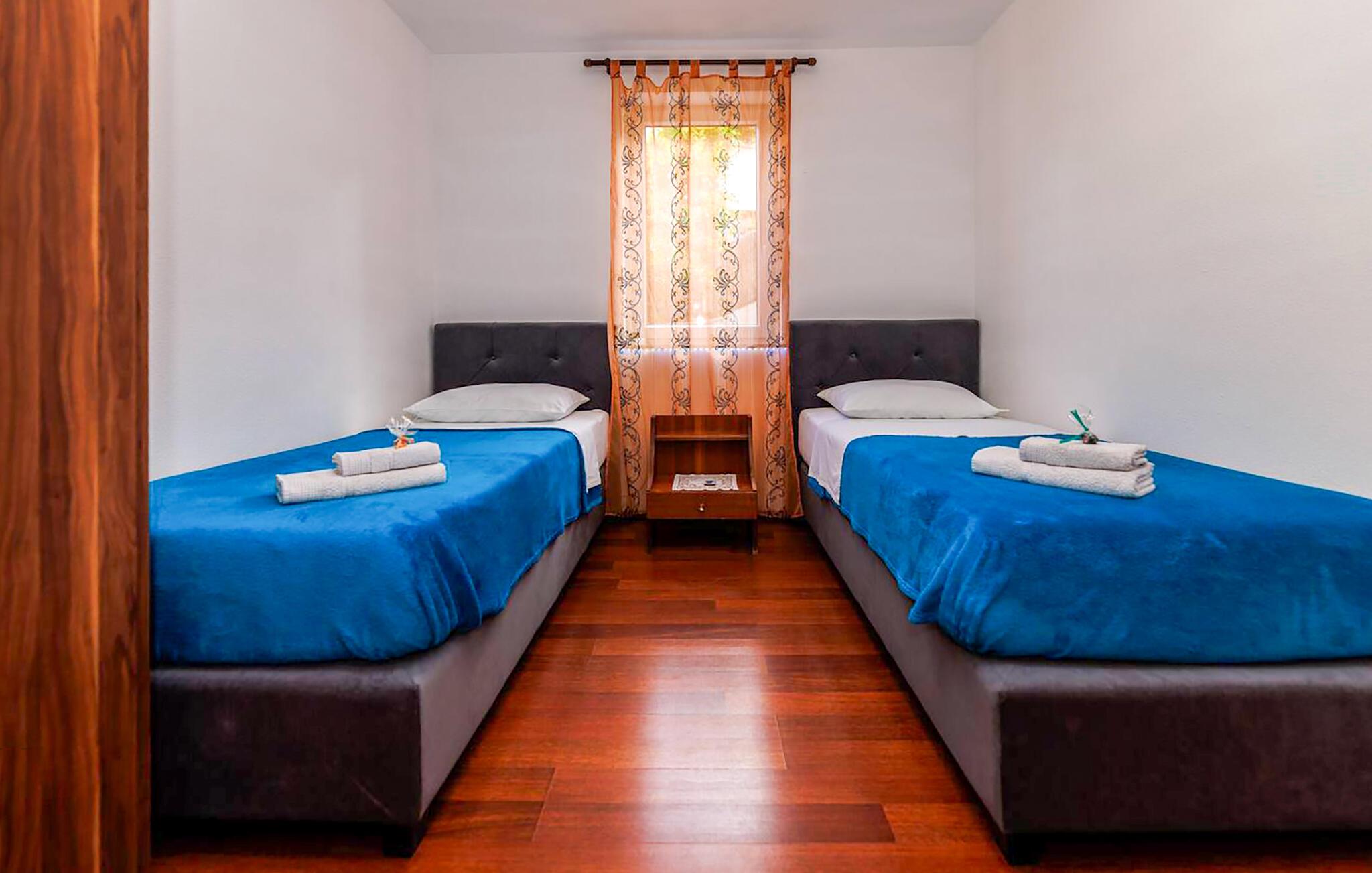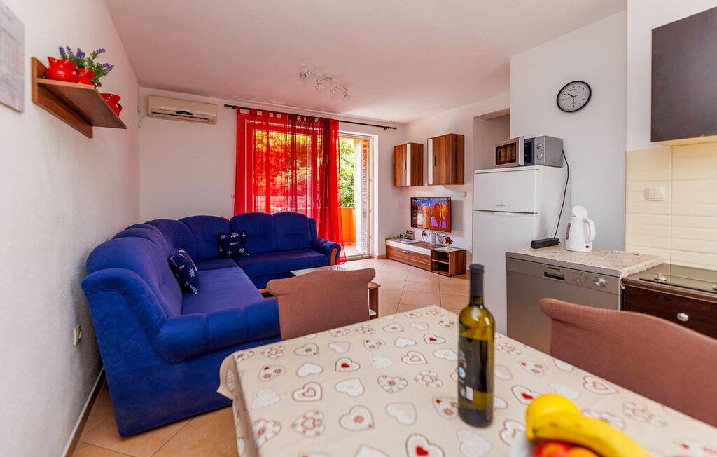 Tilbring varierede dage i denne komfortable ferielejlighed nær stranden. Denne rummelige lejlighed i stueetagen ligger kun en kort gåtur fra stranden og byder jer velkommen med en velholdt og hyggelig atmosfære. Tryl lækre måltider frem med regionale ingredienser, planlæg jeres aktiviteter over afslappede måltider, og afslut en begivenhedsrig dag med en sjov spilleaften eller en god film på den komfortable sofa. Den fælles terrasse tilbyder et dejligt spiseområde udenfor. Server jeres morgenmad her, og tænd grillen ved solnedgang. Udforsk den charmerende gamle bydel i Krk med dens historiske mure og snoede gader, cykl langs kysten og opdag skjulte bugter til svømning og snorkling. Slentr gennem de smalle, stejle gader i den maleriske landsby Vrbnik, prøv lokal mad på traditionelle restauranter, og tag en bådtur til de nærliggende øer. For aktive feriegæster er kajak- eller stand-up paddle-ture langs kysten en god mulighed, mens I kan nyde solen på strandene i Malinska eller Porat.