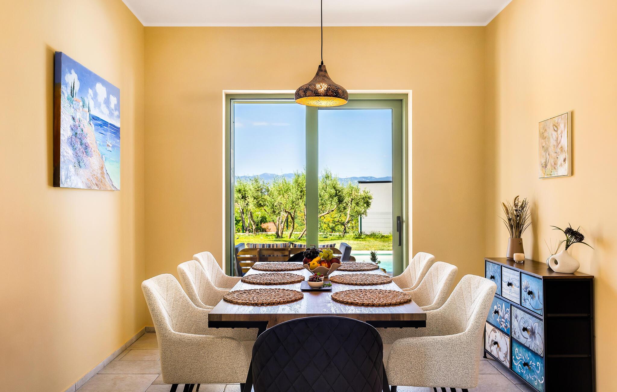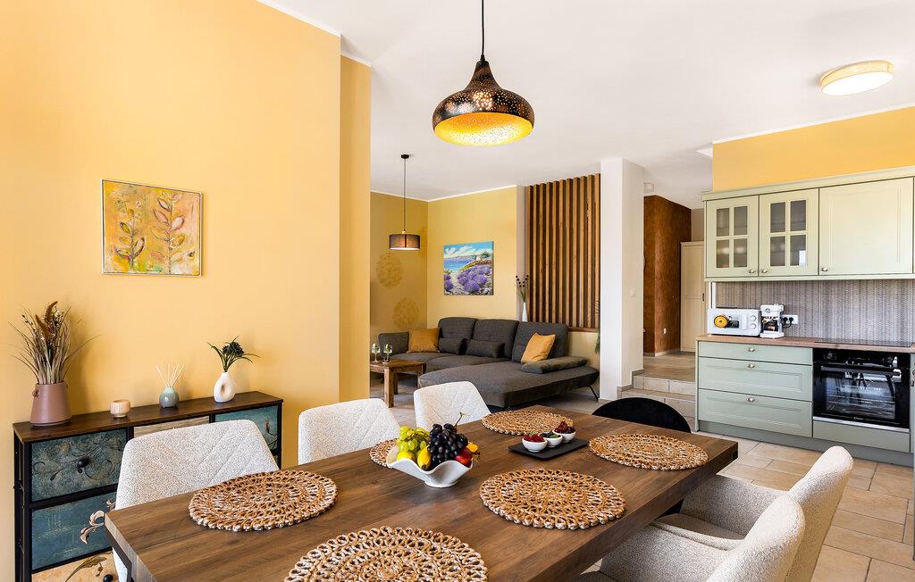 Tilbring solrige timer i det velholdte udendørsområde og lad blikket vandre over havet og den gamle bydel i Vrbnik. Svøm et par baner i den oplyste udendørs pool eller Læn jer tilbage på de omkringliggende liggestole. Tilbered jeres måltider på grillen og nyd dem på den overdækkede terrasse. Læn jer tilbage på balkonen med de komfortable siddepladser og se solnedgangen over Kvarnerbugten.