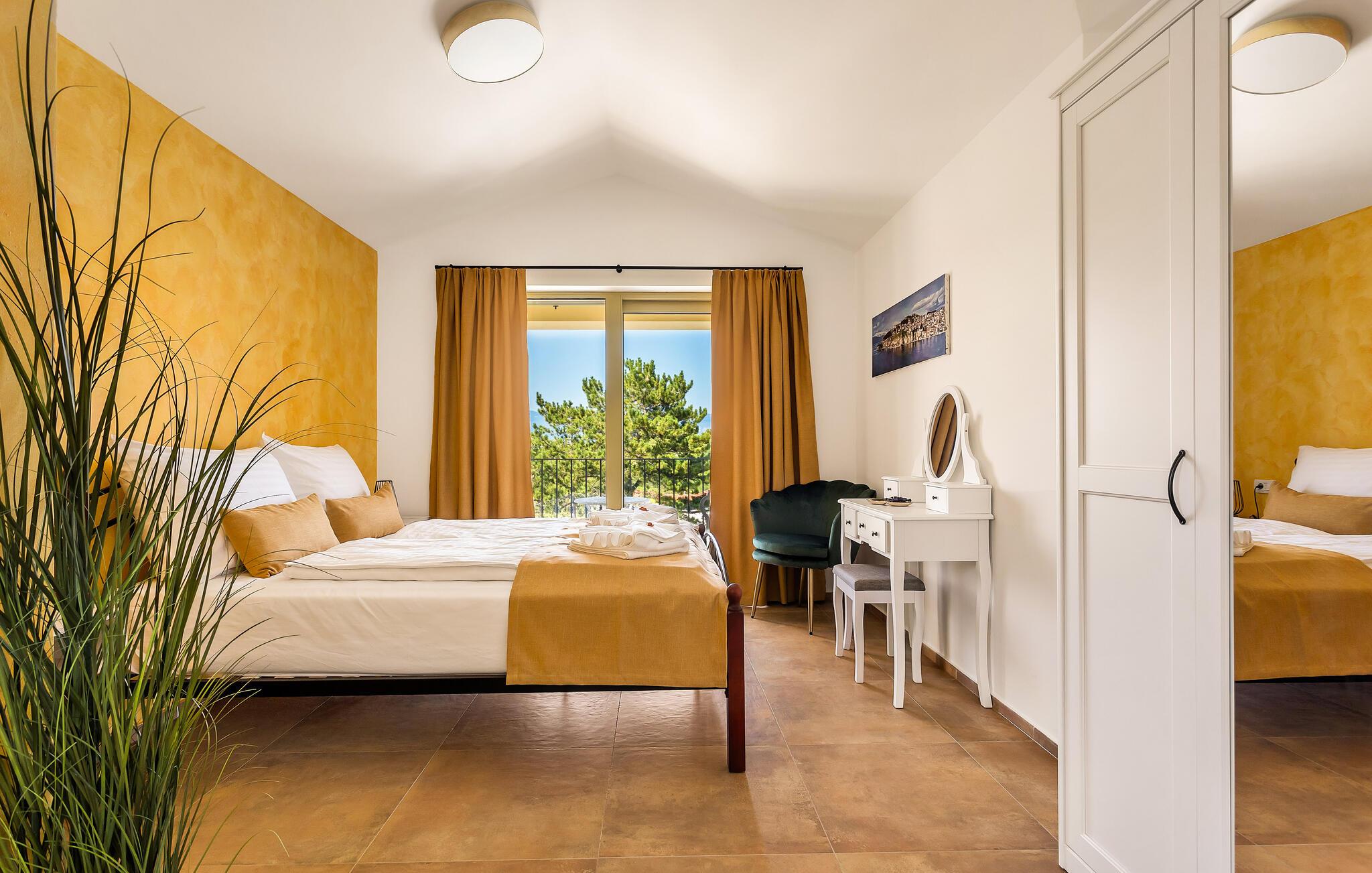 Tilbring tid på balkonen og lad jeres blik vandre over havet og det omkringliggende landskab. Udenfor kan I nyde forfriskende timer i poolen og derefter slappe af på liggestolene i rolige, grønne omgivelser. Brug terrassen til stille øjeblikke udendørs eller til et glas vin ved solnedgang.