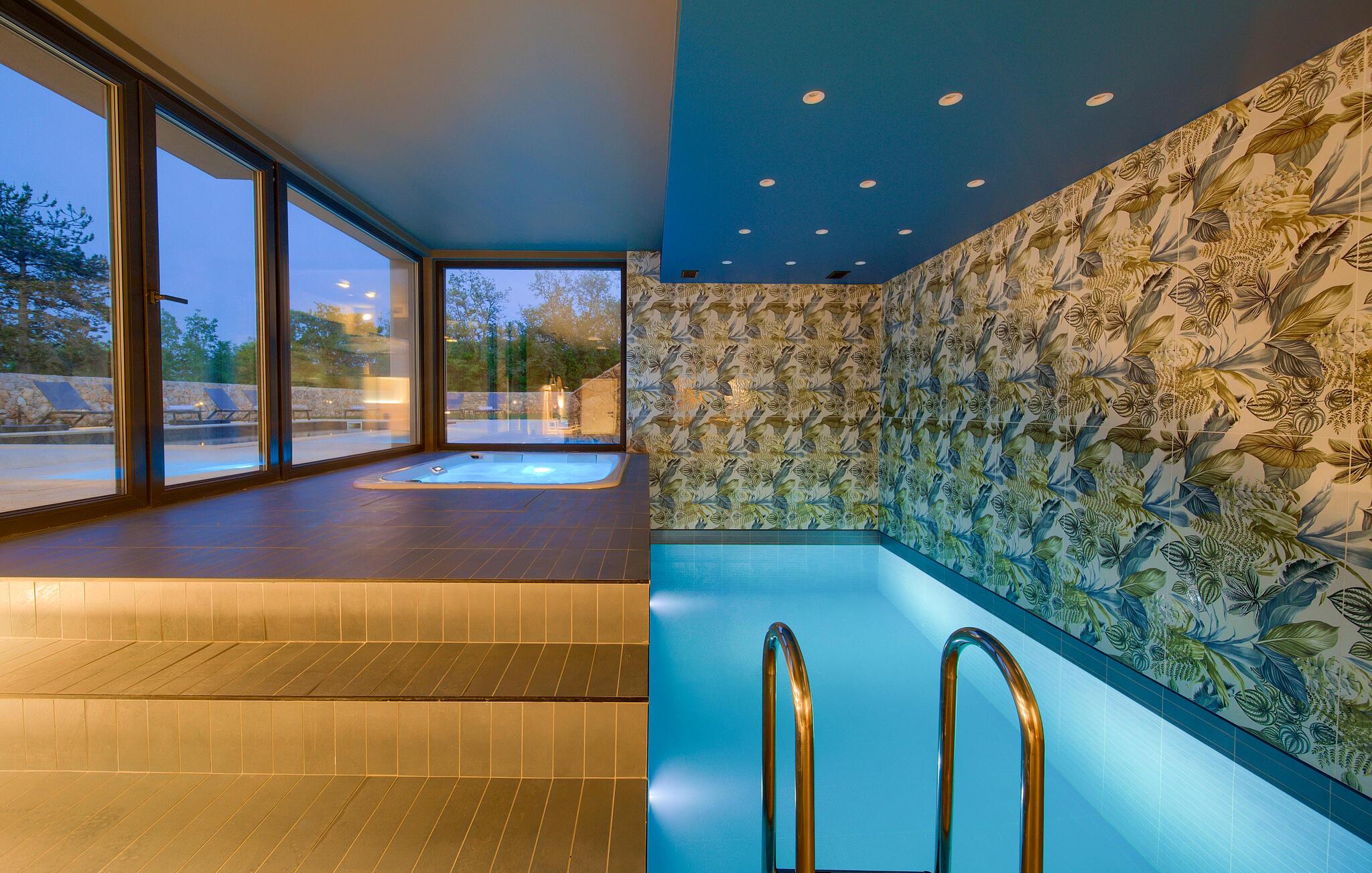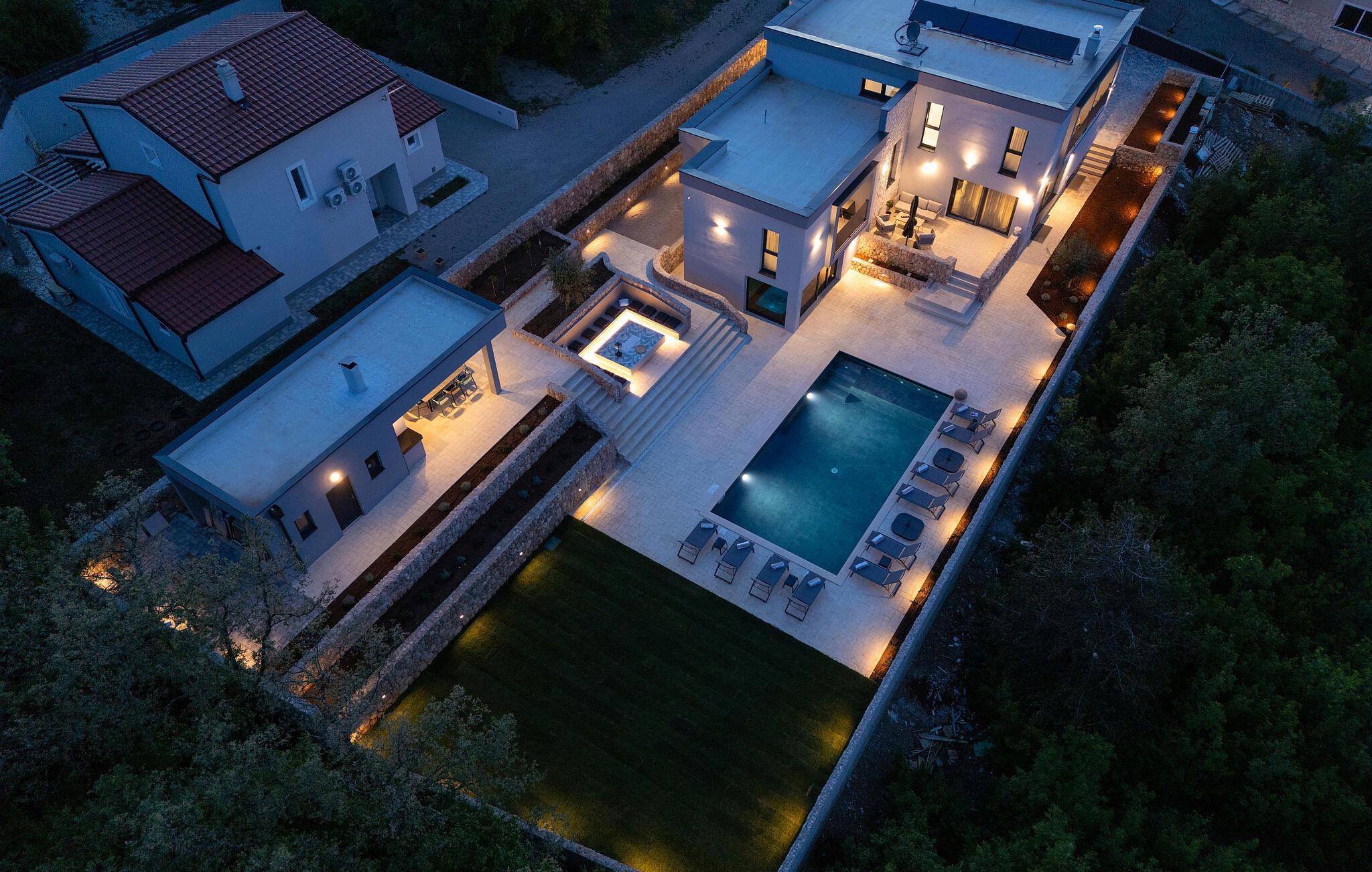Slap af på den store udendørsterrasse og tilbring hyggelige aftener ved grillen. De komfortable solsenge omkring udendørspoolen indbyder til afslapning. Nyd solen og den klare himmel over Krk, mens jeres børn hopper på trampolinen. I den hyggelige stue finder I alt til afslappede stunder. Gør jer det behageligt på den komfortable sofa foran den moderne brændeovn og nyd udsigten ud i det fri.