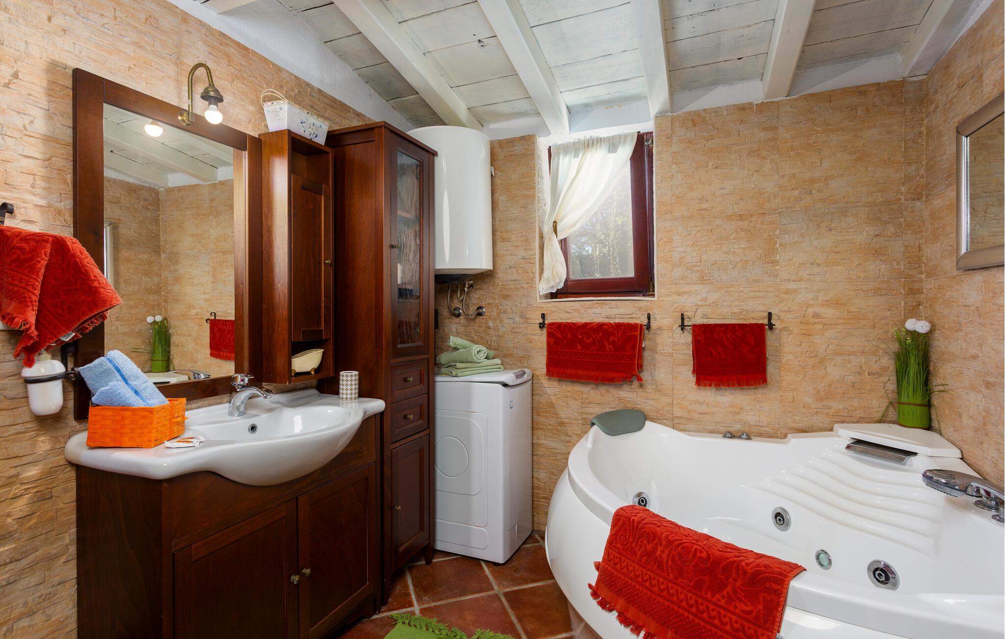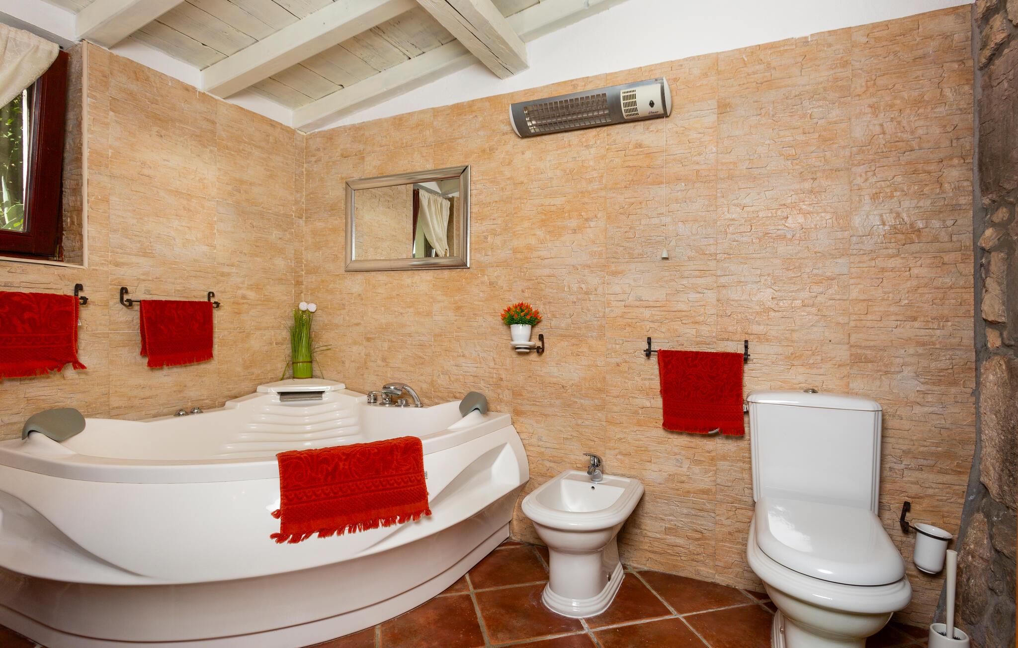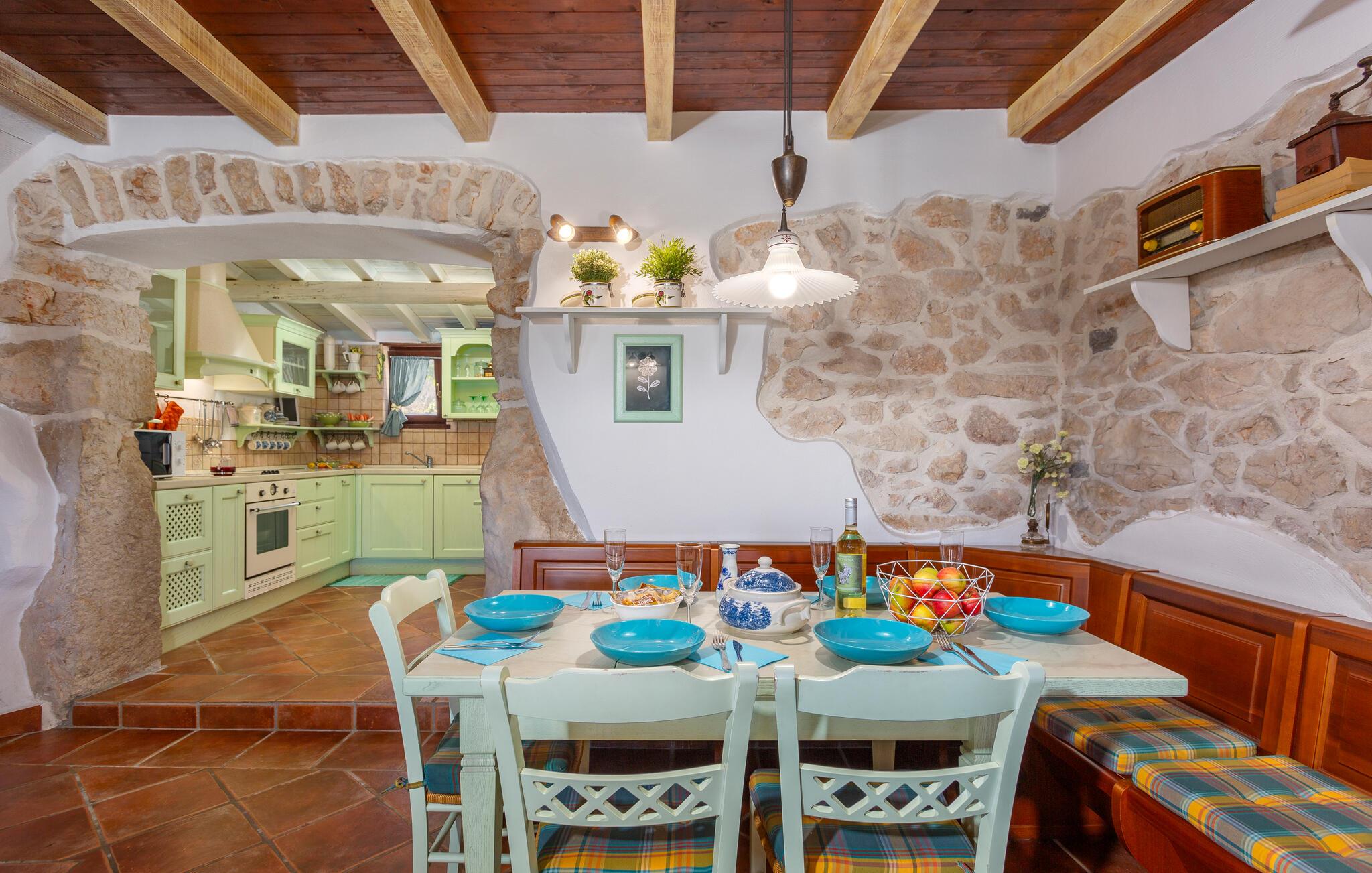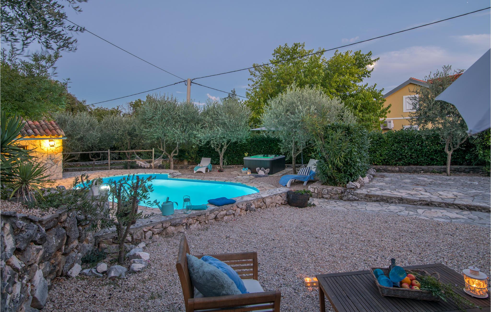 Dette flotte og traditionelt indrettede feriehus ligger midt på øen Krk. På den overdækkede terrasse er der hyggelige træmøbler, her kan I se børnene lege og nyde husets rolige omgivelser. Slap af med jeres familie ved siden af den dejlige pool. I et lille hus ved siden af er der et soveværelse med plads til to personer og et badeværelse. Grunden er indhegnet. Med bilen kommer I hurtigt til strandene i nærheden, mudderbadene i Kimno, gemte bugter, byerne Silo, Vrbnik og Malinska samt byen Krk med sit livlige natteliv i højsæsonen. Besøg de mange strande, øen tilbyder.