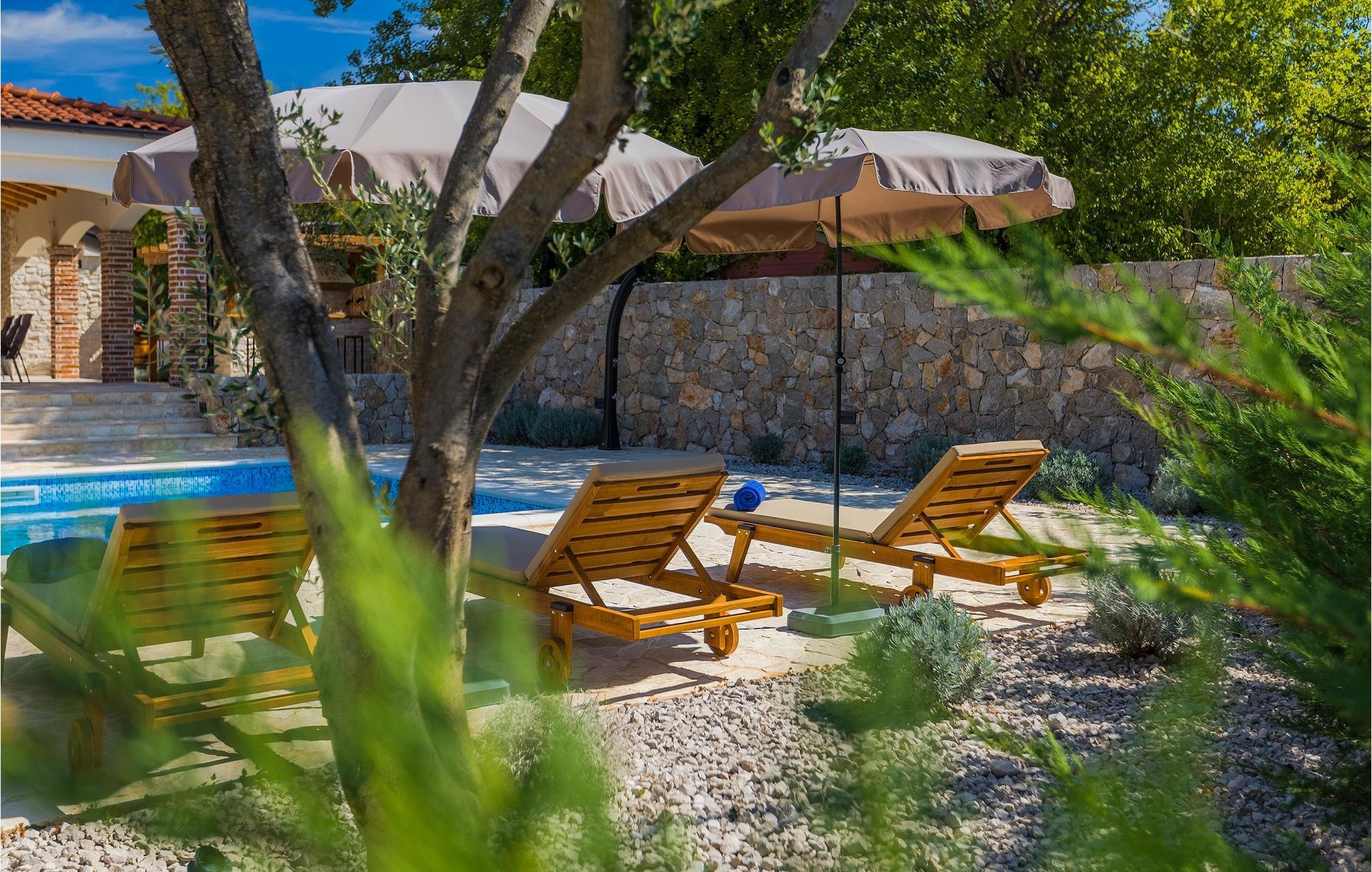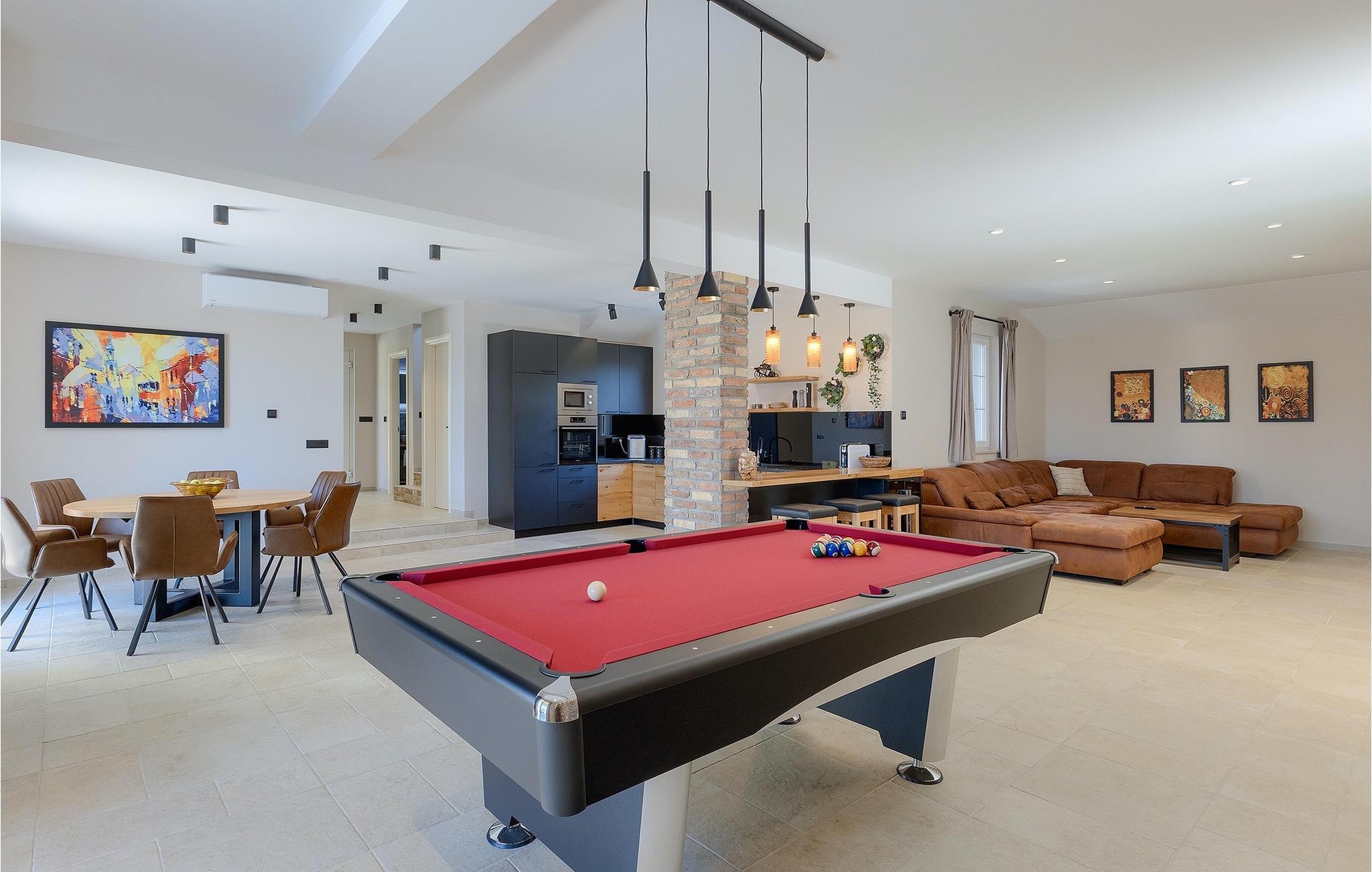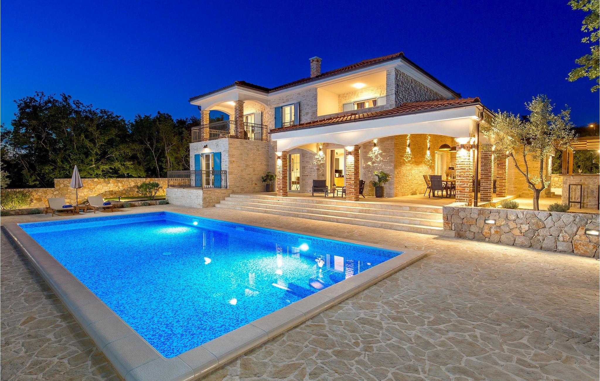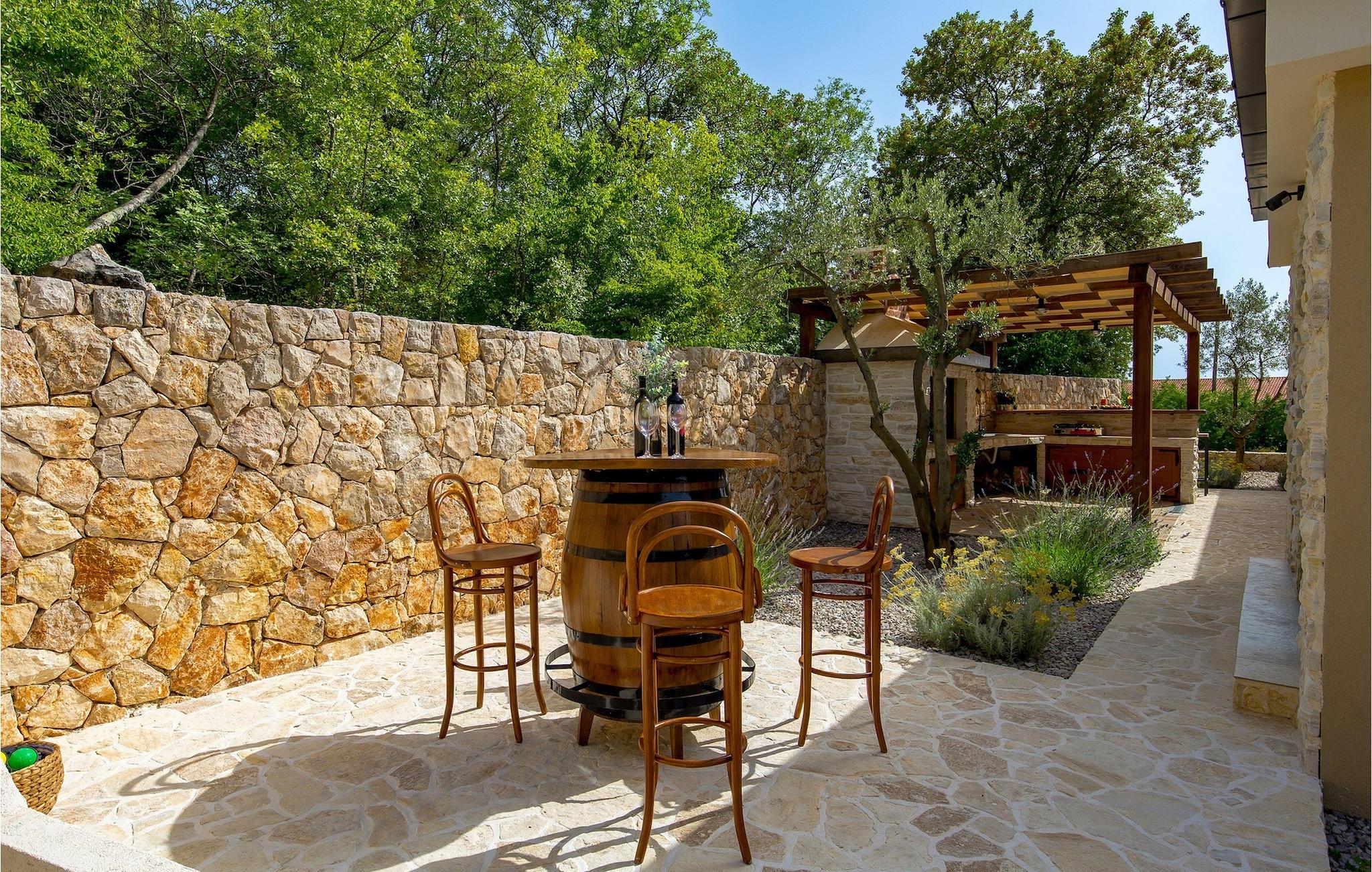 Stenvilla Maya Krk med sit rustikke udseende og rummelighed inviterer dig til at tilbringe en behagelig og behagelig ferie i villaen. Villaen er omgivet af en græsplæne med en smuk grøn have beplantet med lavendel, storslåede træer og buske, der giver den naturlig skønhed. I villaens udendørsområde er der en privat swimmingpool, ideel til at undslippe sommervarmen eller nyde solens stråler på liggestolene lige ved poolen. Mens du ser dine kære i poolen, kan du få din første morgenkaffe på den overdækkede terrasse ved siden af huset eller liggestolene under baldakinen lige ved siden af poolen. For elskere af madlavning er der en overdækket grillplads, hvor du kan tilberede traditionelle retter, mens dine kære nyder dem i den udendørs spiseplads. Sportselskere kan prøve deres kræfter med at spille boccia på petanquebanen bag huset, som er ideel til sjov og underholdning. Fra den udendørs terrasse er der adgang til husets indre, hvor der er åben, rustik opholds- og spisestue, moderne køkken, underholdningsområde med poolbord og en storslået udsigt over poolen og landskabet. På første sal er der også et depotrum, 1 komfortabelt soveværelse med eget badeværelse og 1 toilet. På anden sal i villaen er der 3 moderne soveværelser med eget badeværelse. Et værelse har udgang til altan, hvor man kan nyde en storslået udsigt over landskabet, og et andet værelse har udgang til terrassen, hvor der er et afslapningshjørne, hvor man kan slappe af med en forfriskende drink med udsigt over poolen. Book Villa Maya Krk og giv dig selv og dine kære en drømmeferie!
