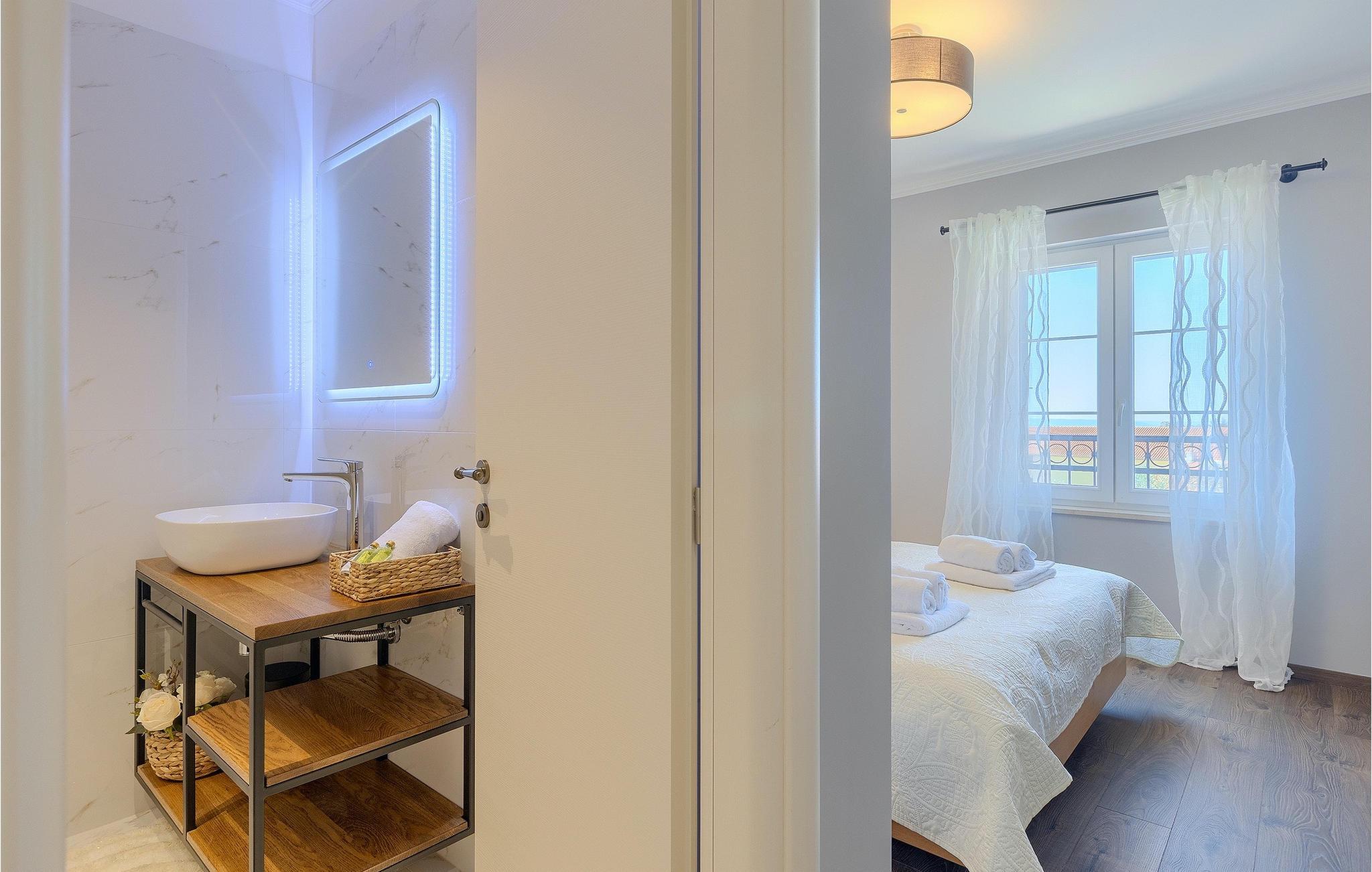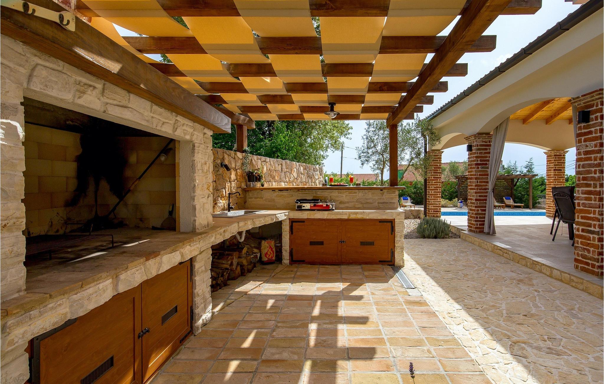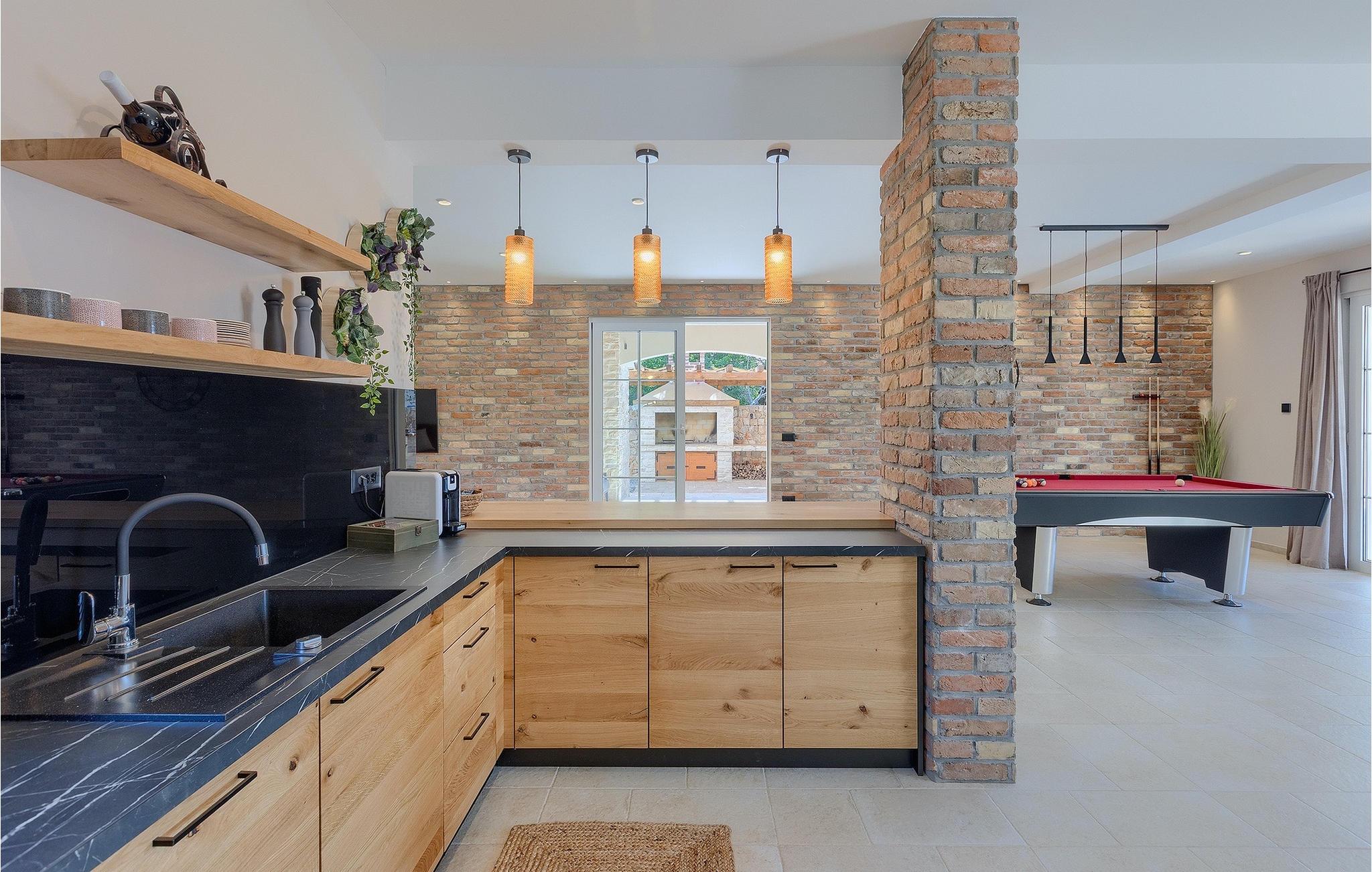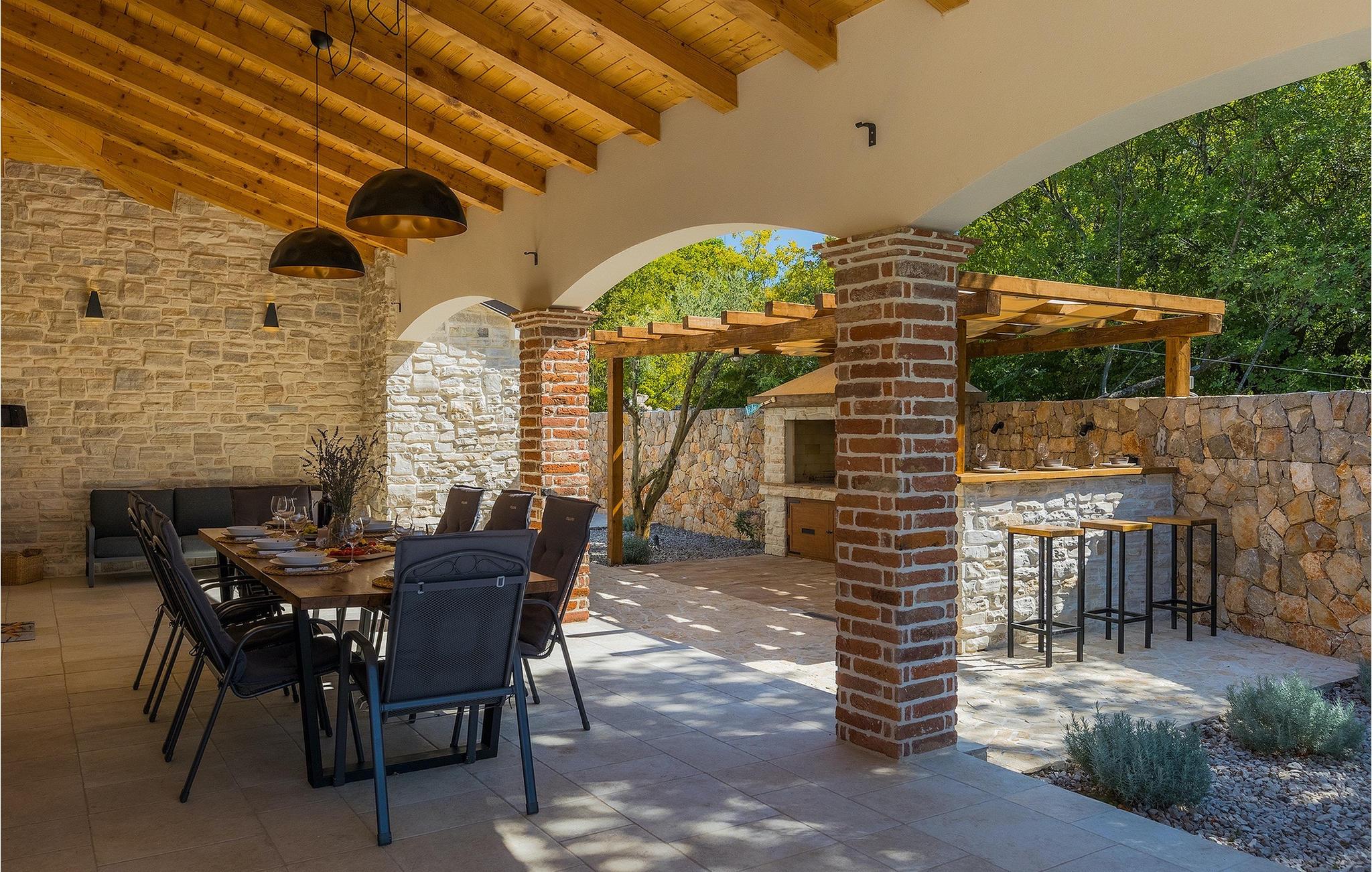Stenvilla Maya Krk med sit rustikke udseende og rummelighed inviterer dig til at tilbringe en behagelig og behagelig ferie i villaen. Villaen er omgivet af en græsplæne med en smuk grøn have beplantet med lavendel, storslåede træer og buske, der giver den naturlig skønhed. I villaens udendørsområde er der en privat swimmingpool, ideel til at undslippe sommervarmen eller nyde solens stråler på liggestolene lige ved poolen. Mens du ser dine kære i poolen, kan du få din første morgenkaffe på den overdækkede terrasse ved siden af huset eller liggestolene under baldakinen lige ved siden af poolen. For elskere af madlavning er der en overdækket grillplads, hvor du kan tilberede traditionelle retter, mens dine kære nyder dem i den udendørs spiseplads. Sportselskere kan prøve deres kræfter med at spille boccia på petanquebanen bag huset, som er ideel til sjov og underholdning. Fra den udendørs terrasse er der adgang til husets indre, hvor der er åben, rustik opholds- og spisestue, moderne køkken, underholdningsområde med poolbord og en storslået udsigt over poolen og landskabet. På første sal er der også et depotrum, 1 komfortabelt soveværelse med eget badeværelse og 1 toilet. På anden sal i villaen er der 3 moderne soveværelser med eget badeværelse. Et værelse har udgang til altan, hvor man kan nyde en storslået udsigt over landskabet, og et andet værelse har udgang til terrassen, hvor der er et afslapningshjørne, hvor man kan slappe af med en forfriskende drink med udsigt over poolen. Book Villa Maya Krk og giv dig selv og dine kære en drømmeferie!