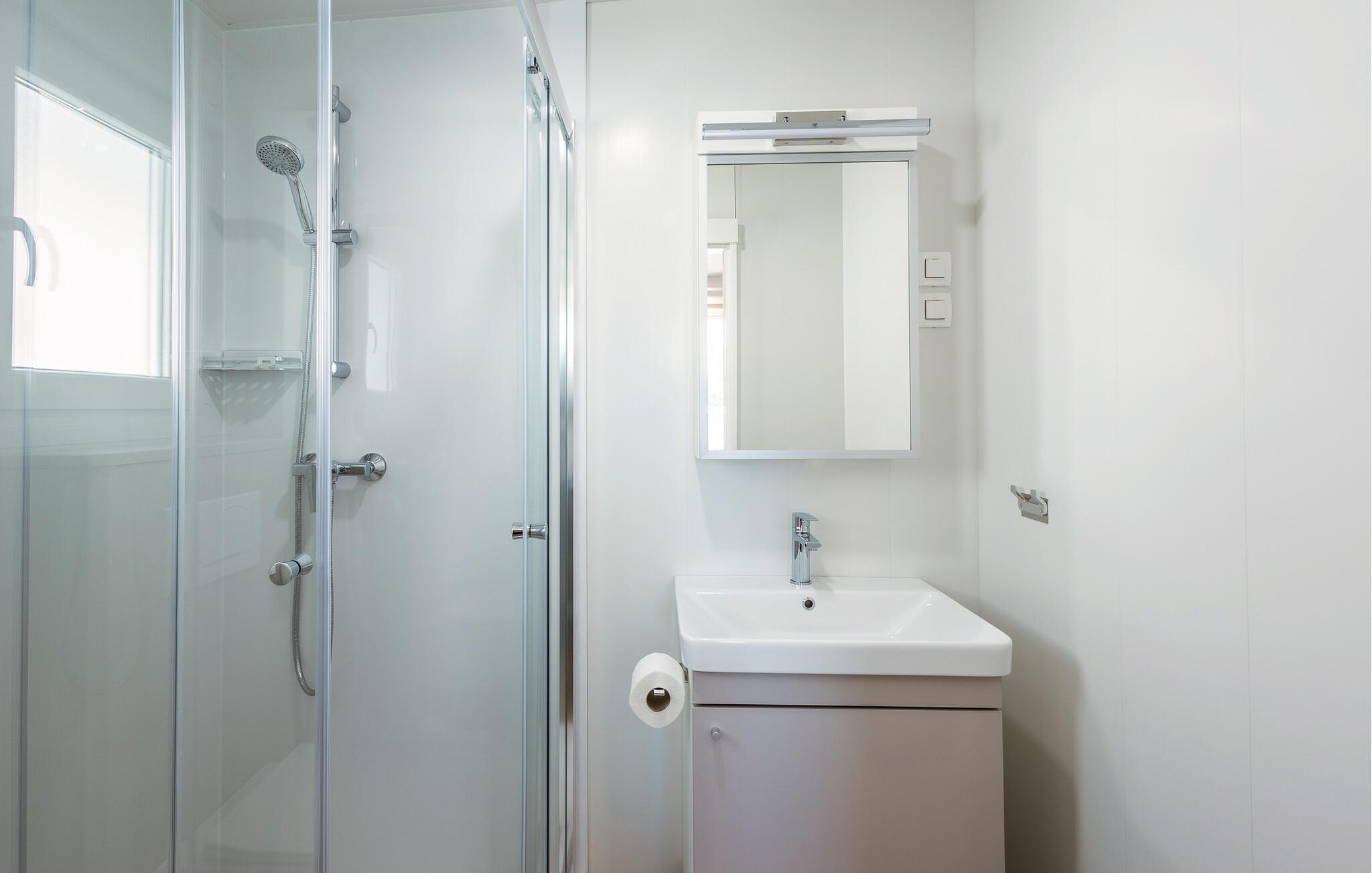 Dette lyse og moderne mobilehome ligger lige ved havet og tilbyder familien adskillige muligheder for at slappe af, dyrke sport og nyde udendørsspil. Planlæg jeres aktiviteter til afslappende måltider, brug det indbydende spisebord til sjove spilleaftener eller slap af efter en aktiv dag med stille læsning.