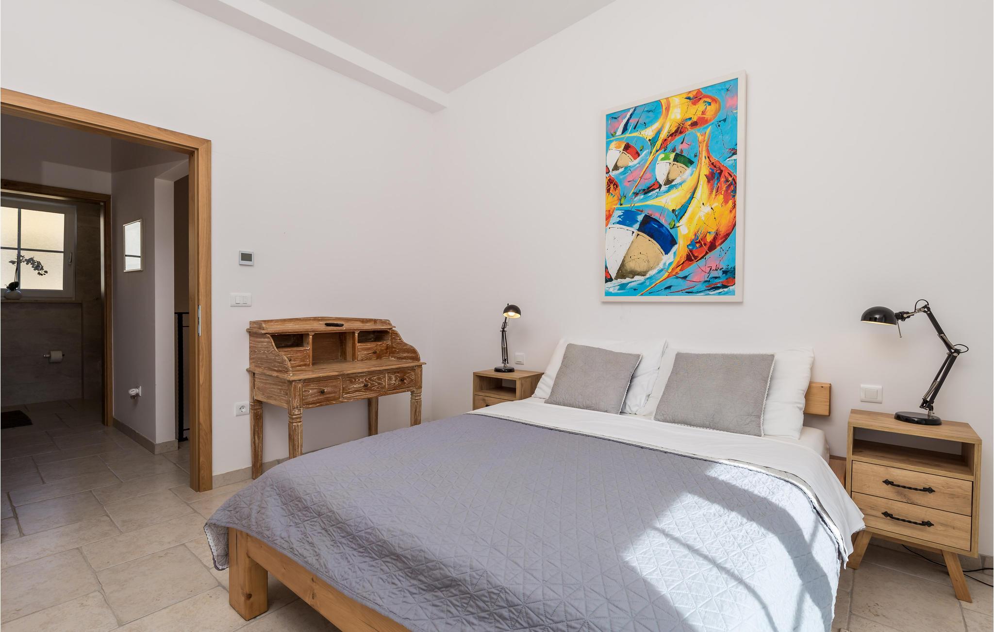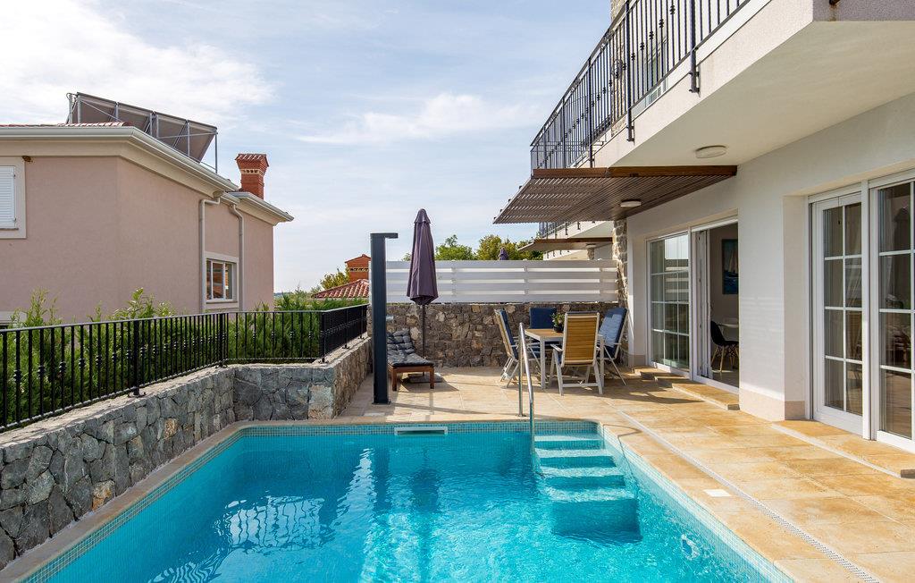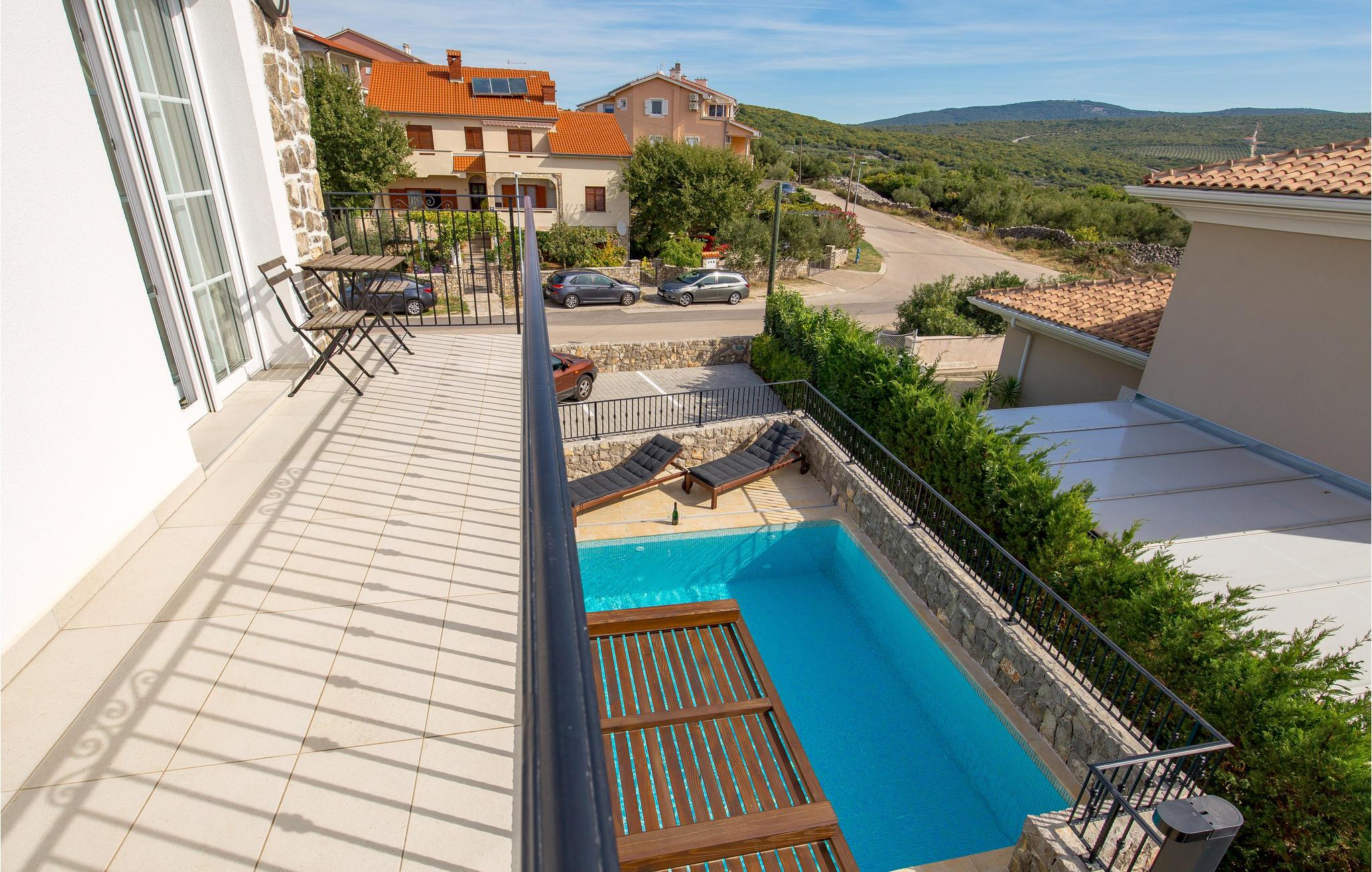 På øen Krk i den lille by Kornic ligger dette vidunderlige feriehus med egen privat pool. Det ligger kun fem minutter i bil fra den historiske by Krk og fra Punat med sin godt beskyttede havn. På grund af beliggenheden på en pakke er der en fantastisk udsigt over havet og de sølvgrønne olivenlunde, som denne region er så berømt for. Huset er indrettet med kærlighed helt ned i de små detaljer og bygget helt traditionelt, og indrettet med en vellykket blanding af gammelt og moderne. Fra stuen er der direkte udgang til terrassen med grill, loungehjørne og område til solbad samt til den opvarmede pool. Det største soveværelse ligger i stueplan og resten på første sal. I huset er der klimaanlæg, gulvvarme og I kan parkere på den store indhegnede grund.