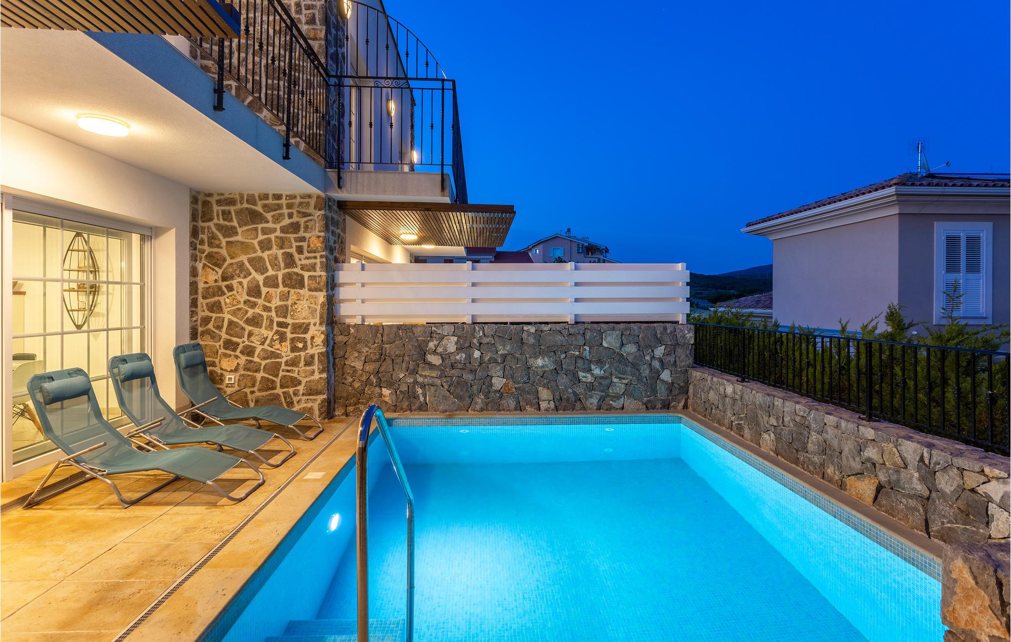 På øen Krk i den lille by Kornic ligger dette vidunderlige feriehus med egen privat pool. Det ligger kun fem minutter i bil fra den historiske by Krk og fra Punat med sin godt beskyttede havn. På grund af beliggenheden på en pakke er der en fantastisk udsigt over havet og de sølvgrønne olivenlunde, som denne region er så berømt for. Huset er indrettet med kærlighed helt ned i de små detaljer og bygget helt traditionelt, og indrettet med en vellykket blanding af gammelt og moderne. Fra stuen er der direkte udgang til terrassen med grill, loungehjørne og område til solbad samt til den opvarmede pool. Det største soveværelse ligger i stueplan og resten på første sal. I huset er der klimaanlæg, gulvvarme og I kan parkere på den store indhegnede grund.