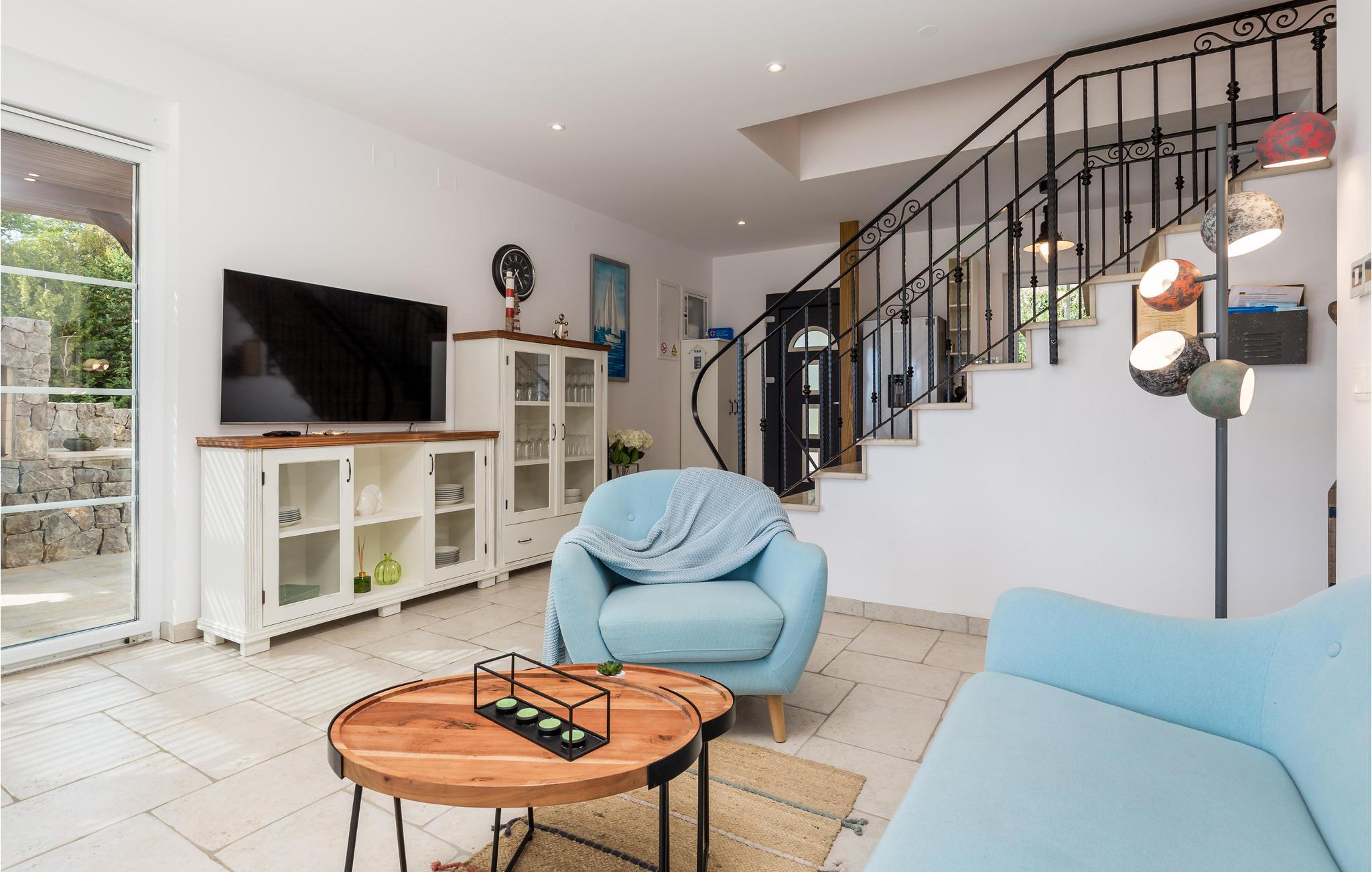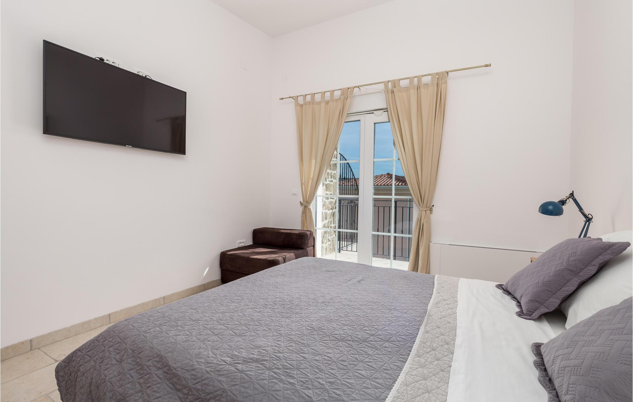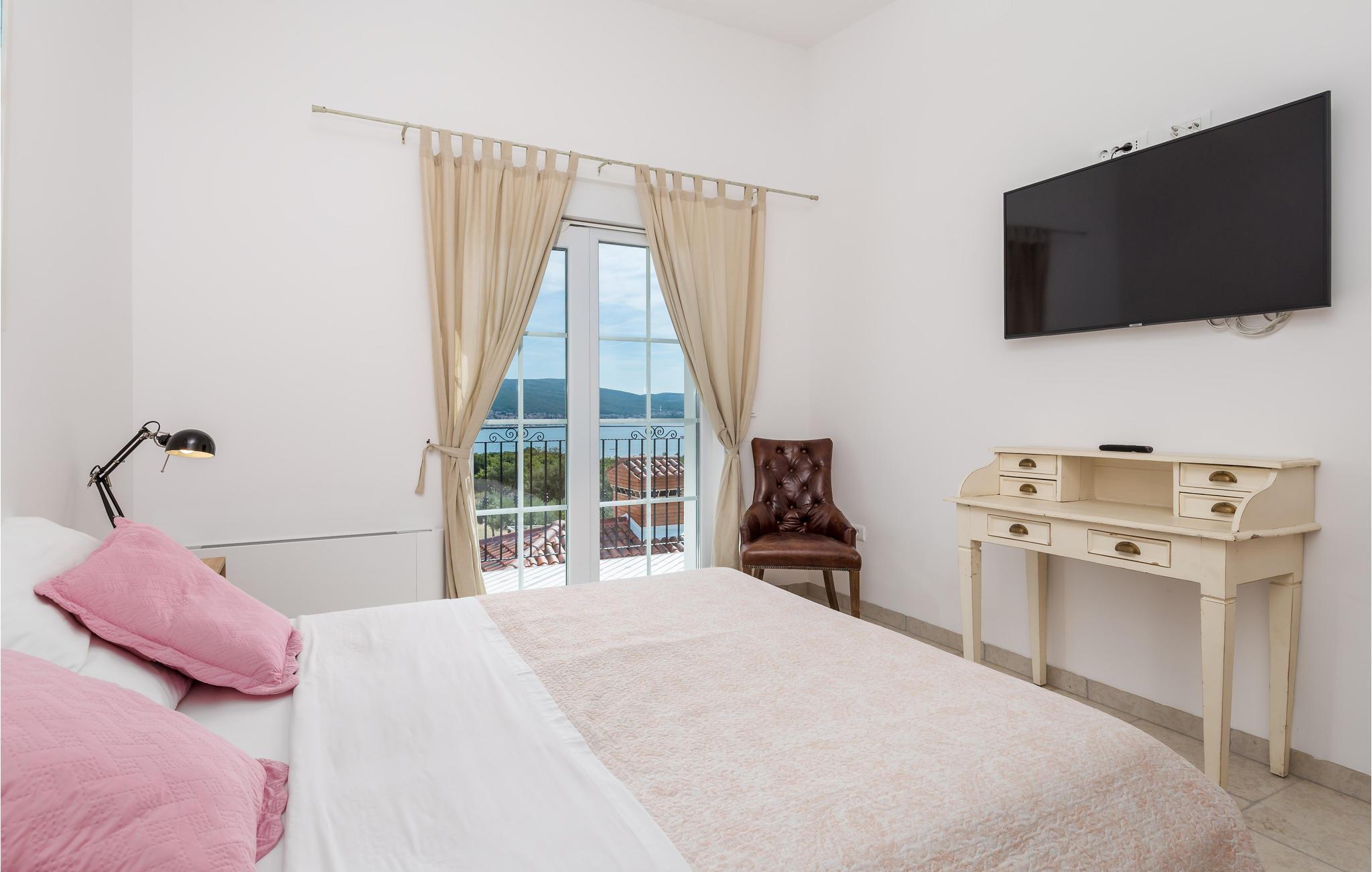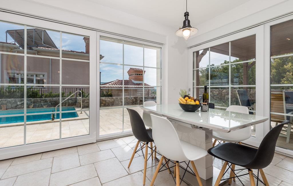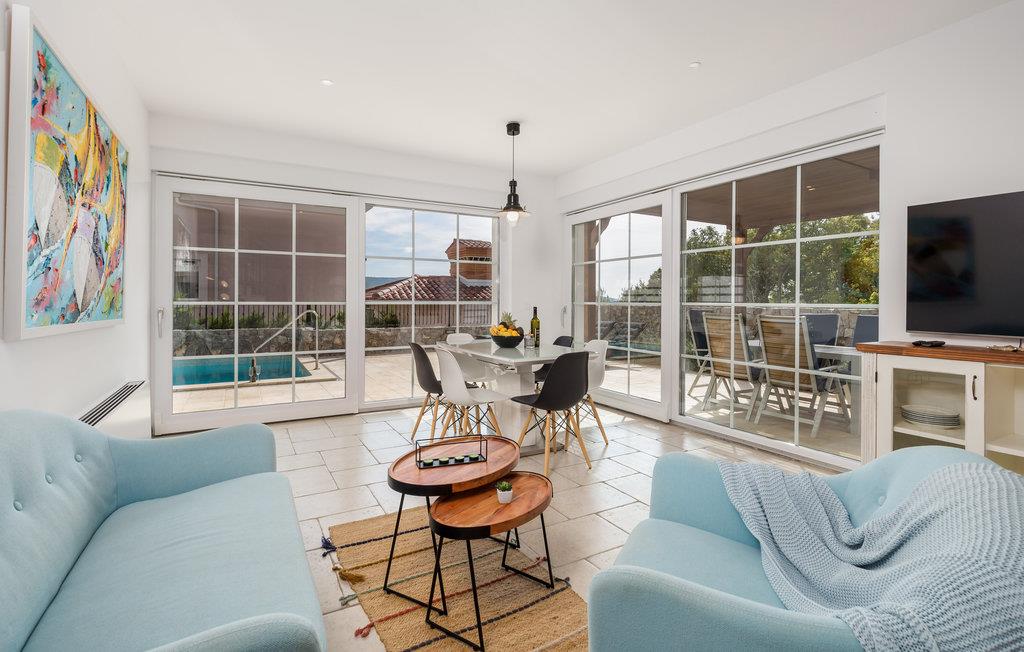 På øen Krk i den lille by Kornic ligger dette vidunderlige feriehus med egen privat pool. Det ligger kun fem minutter i bil fra den historiske by Krk og fra Punat med sin godt beskyttede havn. På grund af beliggenheden på en pakke er der en fantastisk udsigt over havet og de sølvgrønne olivenlunde, som denne region er så berømt for. Huset er indrettet med kærlighed helt ned i de små detaljer og bygget helt traditionelt, og indrettet med en vellykket blanding af gammelt og moderne. Fra stuen er der direkte udgang til terrassen med grill, loungehjørne og område til solbad samt til den opvarmede pool. Det største soveværelse ligger i stueplan og resten på første sal. I huset er der klimaanlæg, gulvvarme og I kan parkere på den store indhegnede grund.