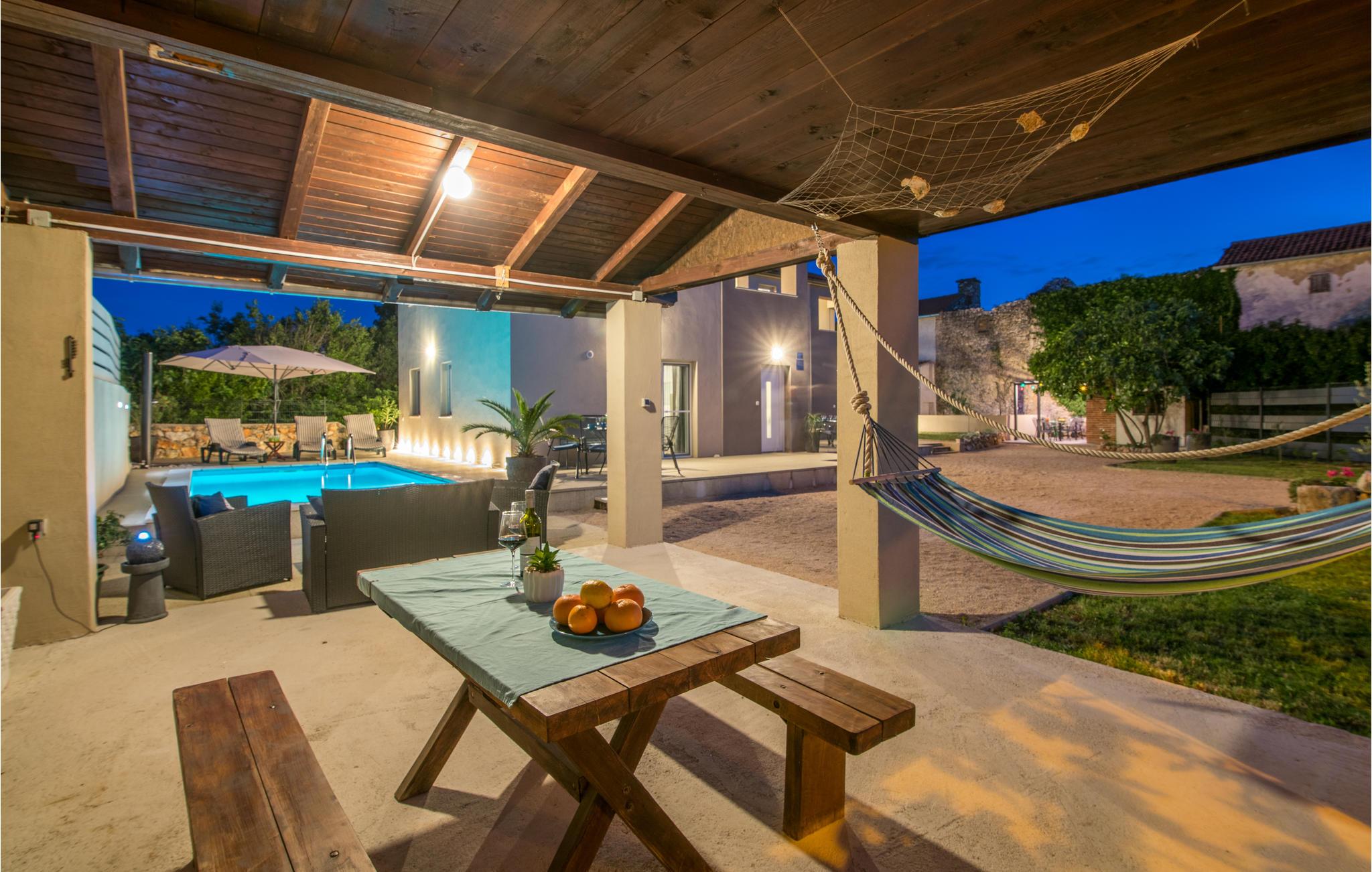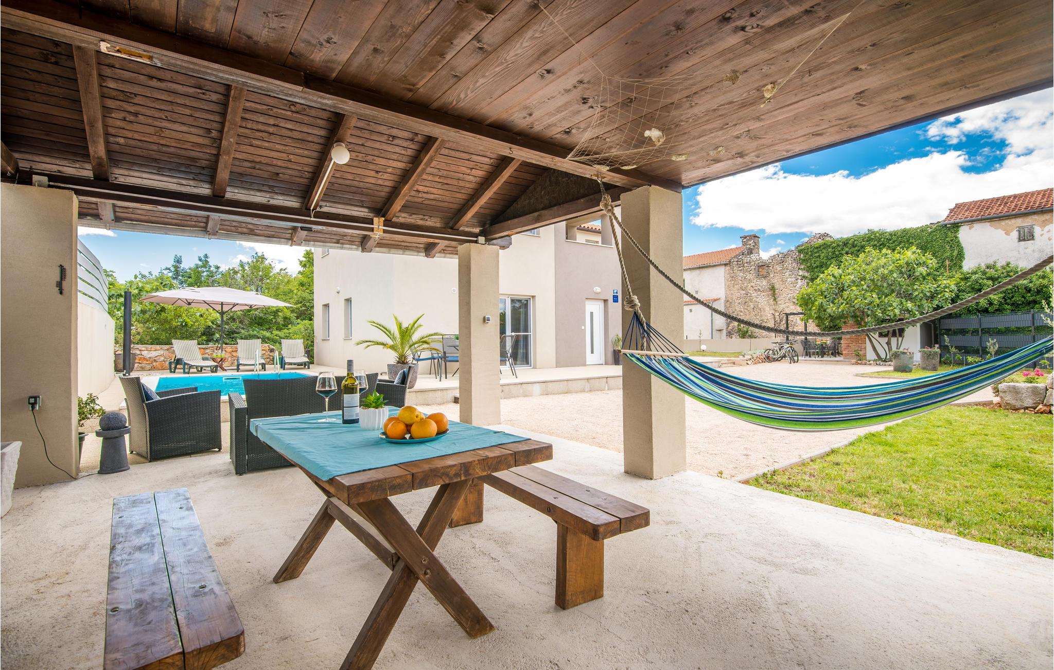 Dette fuldt udstyrede og charmerende møblerede feriehus ligger midt på øen Krk, i den lille landsby Kras. Den delvist indrettede villa består af to separate lejligheder, en i stueetagen og en på første sal, hver med et soveværelse, et badeværelse, et køkken-spisestue og terrasser. Nyd den rummelige grund med havemøbler, grill, pool og et solbadningsområde, der giver privatliv. Oplev strandene og det blå hav i Baški og Stara Baška eller tag til sandstranden i Risika. Interessante seværdigheder findes i Krk, Vrbnik eller på den lille ø Košljun. Dykkerskoler og et netværk af cykelstier findes over hele øen.
