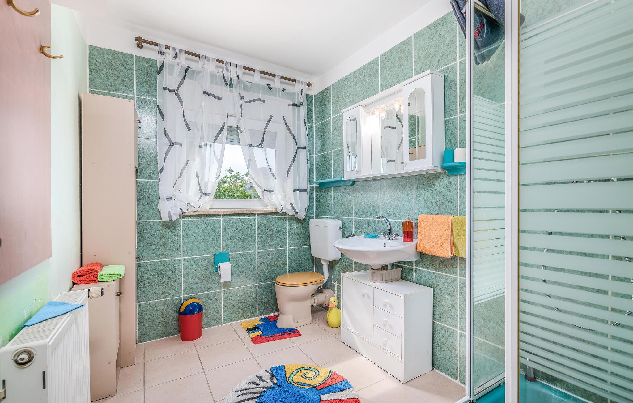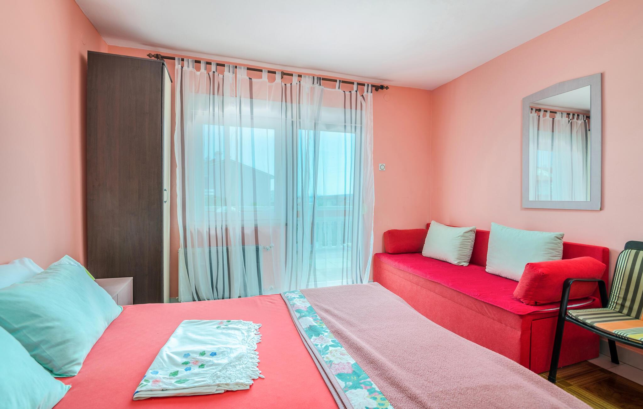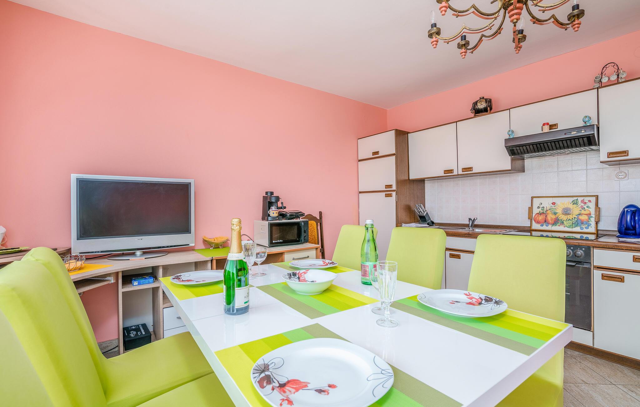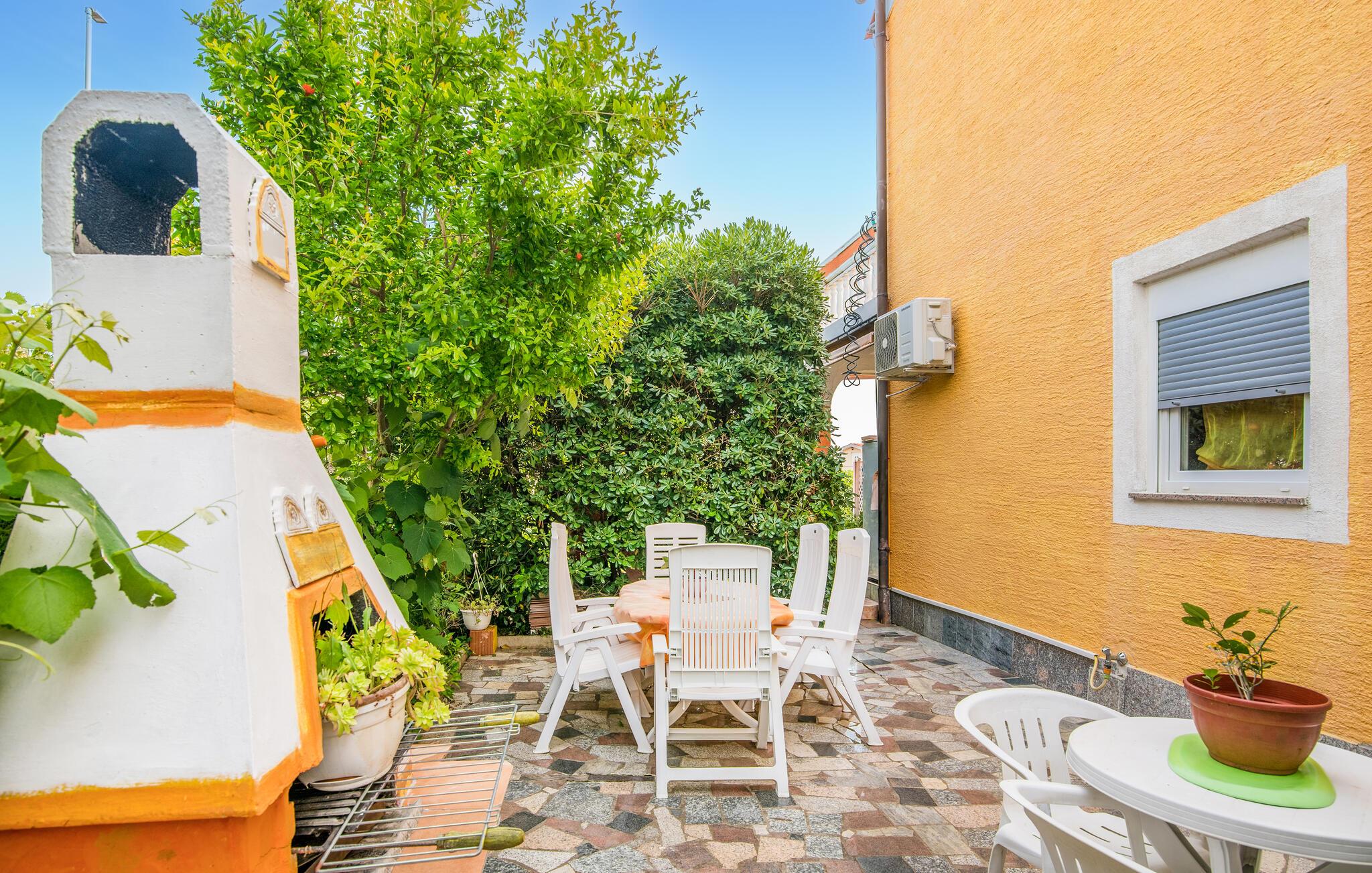 Denne farverige og indbydende ferielejlighed byder dig og din familie på et behageligt miljø, hvor I kan føle jer hjemme. De klassisk og hyggeligt indrettede rum skaber en afslappende atmosfære, perfekt til at nyde ferien fuldt ud. Start dagen på den tilstødende balkon med morgenmad i solen, og afslut aftenen med lækre retter på terrassen i haven, hvor der er en muret grill til rådighed. Den korte afstand til stranden gør denne lejlighed ideel til ubekymrede feriedage.
