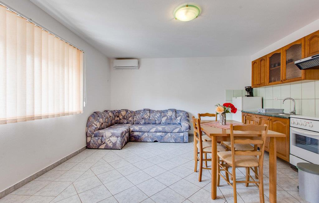 Denne lille, funktionelt møblerede lejlighed venter sine gæster på 1. sal i et hus og tilbyder delvis havudsigt. Det giver plads til 4 personer, der er en dobbeltseng i soveværelset, yderligere 2 senge kan findes i stuen. Et kæledyr er velkomment. Aircondition sikrer behagelige temperaturer på varme sommerdage.