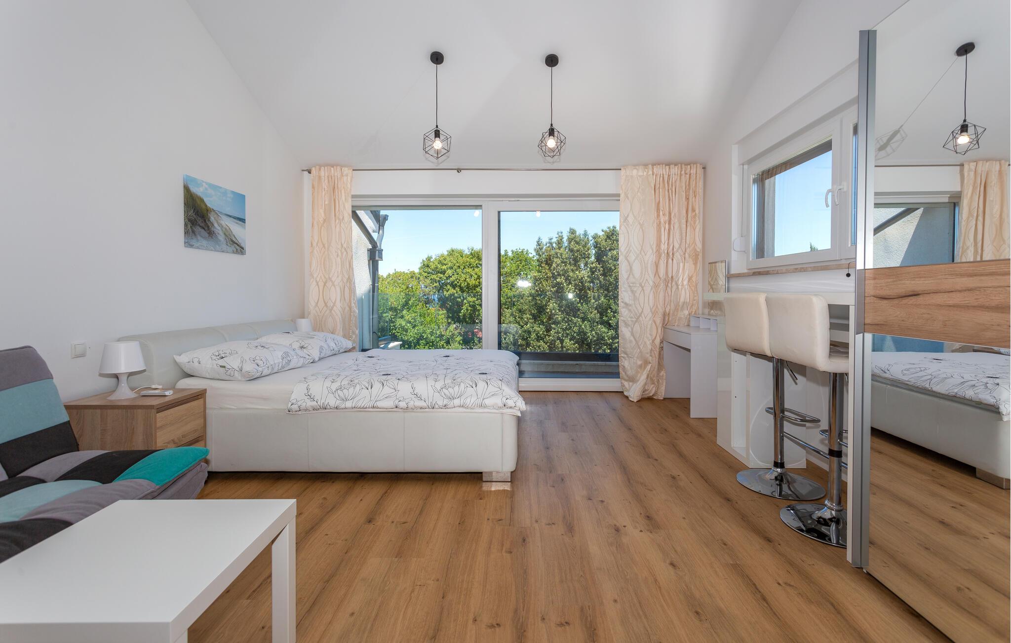 Denne kærligt indrettede lejlighed kombinerer moderne komfort med en stilfuld, indbydende atmosfære. De lyse og rummelige indendørsområder er smagfuldt indrettet og tilbyder alt, hvad I har brug for til en afslappende ferie. I det åbne og lyse opholdsrum kan I lave mad, spise og slappe af sammen, og den hyggelige stue er perfekt til rolige aftener.
