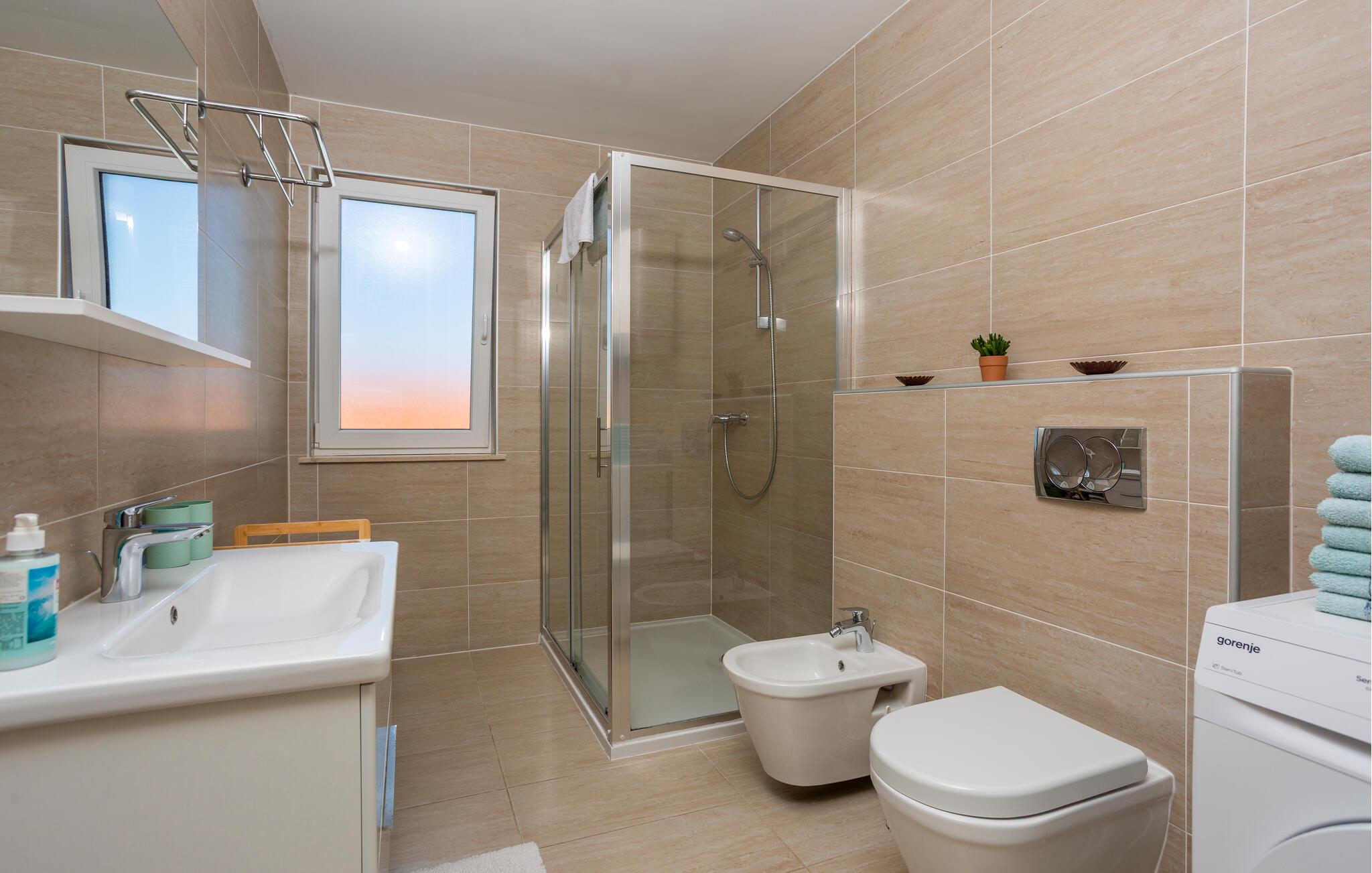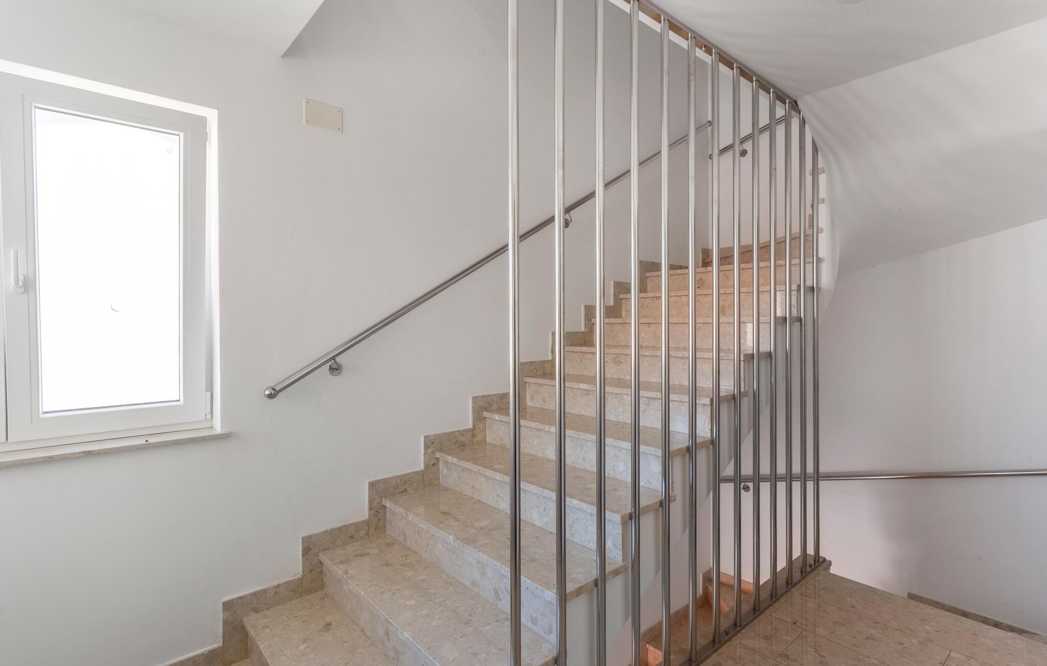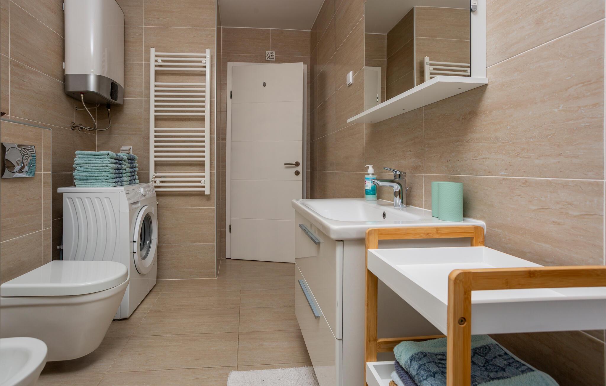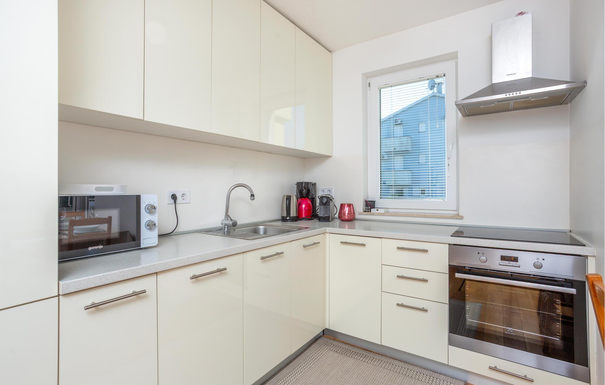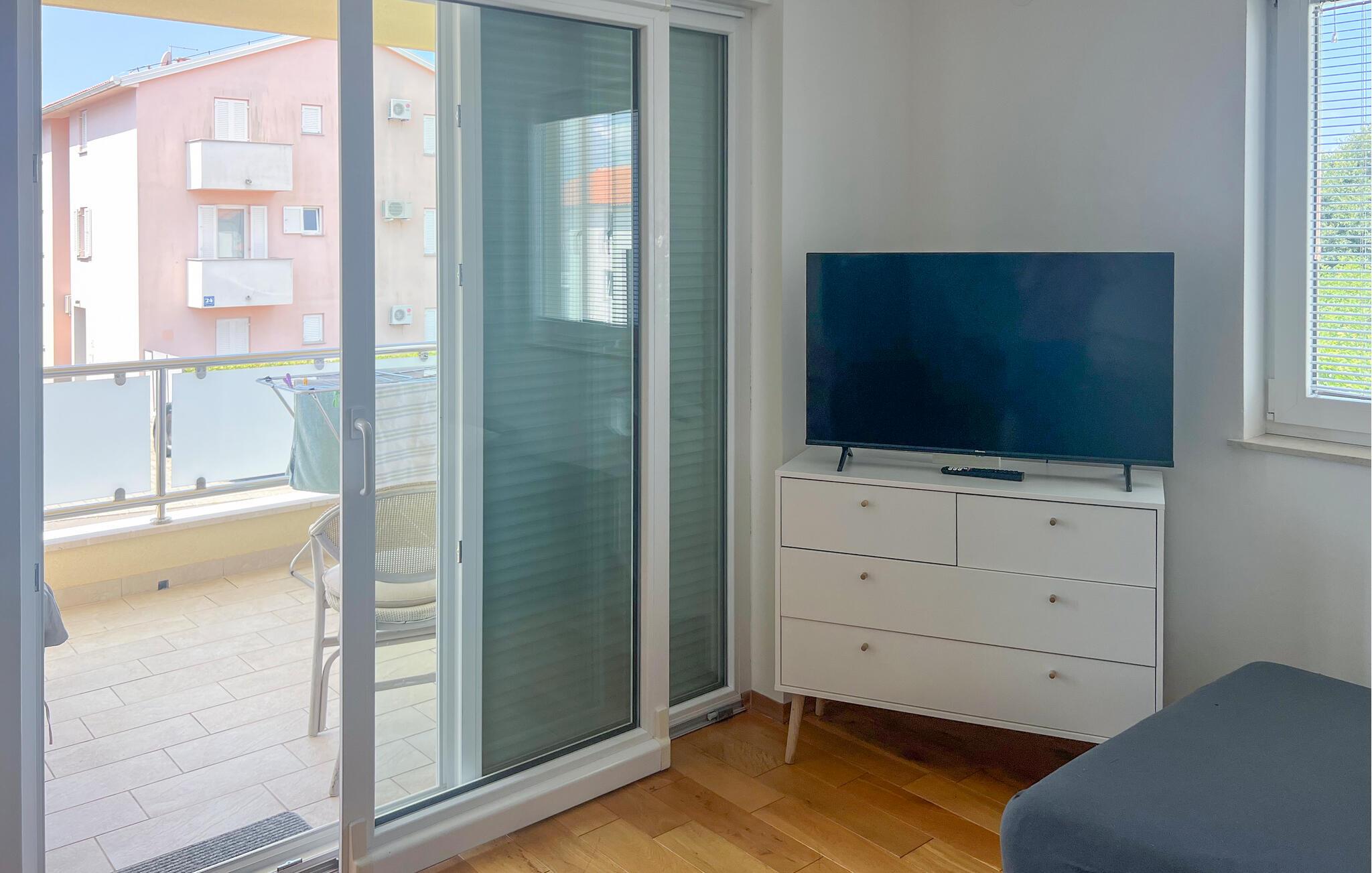 Tilbring en afslappende ferie i denne ferielejlighed beliggende på en ø nær stranden. Denne indbydende lejlighed byder jer velkommen til en afslappende flugt fra hverdagen. Lyse værelser, smukke parketgulve og et sofaområde med udsigt til naturen skaber en hyggelig atmosfære. Stream jeres yndlingsserier, lyt til musik, eller hør en interessant podcast. Tilbered lækre måltider i køkkenet og nyd et glas vin. Sæt jer i den komfortable sofa på terrassen om morgenen og nyd jeres første kaffe her. Nyd morgenmaden i fred og ro, og fordyb jer derefter i en god bog eller lav planer for den næste dag. Om aftenen inviterer terrassen jer til at reflektere over jeres oplevelser med en lille snack. Tag en kort gåtur til havet og nyd afslappende timer på de idylliske strande i Malinska. Slentr gennem den charmerende bymidte med dens små butikker, caféer og restauranter. Udforsk det omkringliggende område på en cykeltur eller vandretur langs den maleriske kyst. Prøv friskfanget fisk og andre specialiteter fra øen Krk i regionens konobas.